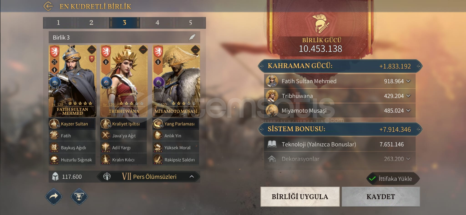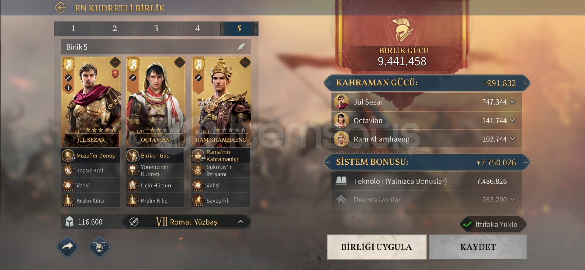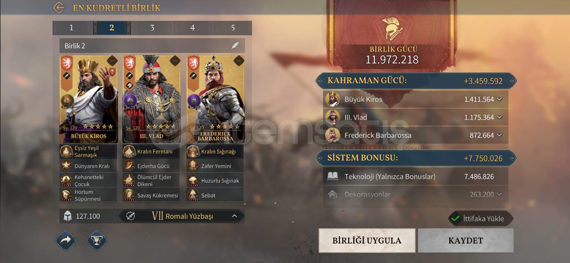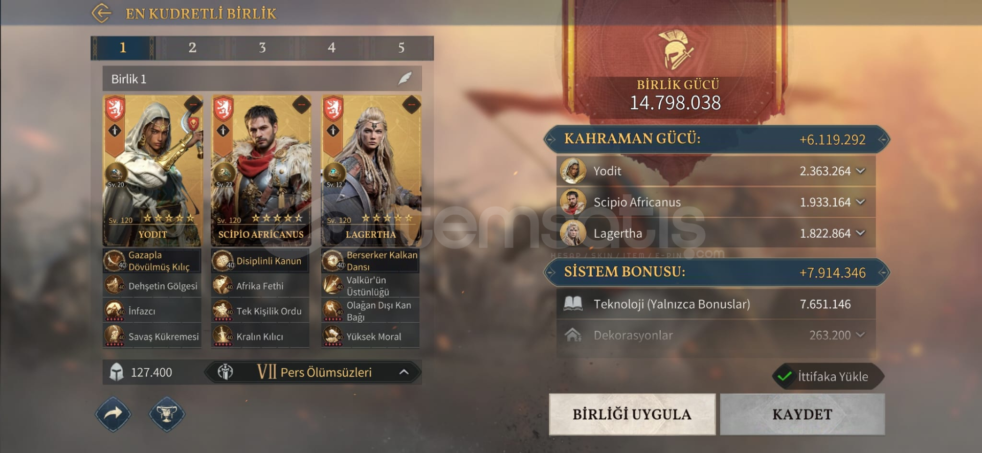 Göç sonrası en güçlü imparatorluklardan biri haline gelen 162'de yer alan 87M savaş güçlü hesabın Vip11 olmasına çok az kaldı.Savaşçı kılıç ana birlik olması yanı sıra ikinci birlik olarak da savaşçı mızrak mevcuttur.Zırh malzemeleri 3 birliği 80 seviyeye tamamlayacak ve 4. birliğe de ekleme yapacak kadar vardır.Son valide bü...