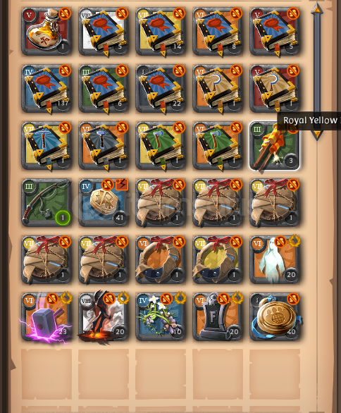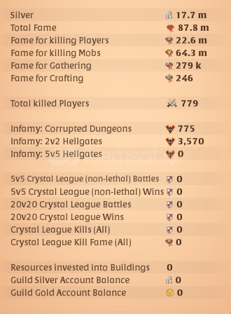 Marketteki satılacak eşyalarla beraber 25 M civarı silver mevcut hesapta.4.3M Fame kitabı vardır.5.3M kombat fame vardır.Deri toplayıcılığı T7 olmak üzere.Diğer toplayıcılıklar T4 hepsi.414 Öğrenme Puanı var hesapta.