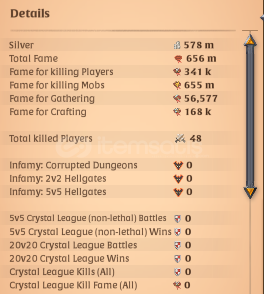656m TOTAL FAME 578m CASH SILVER hesap ( detaylı inceleme için https://imgur.com/a/ZpPVLoG )hesapta item sadece 20m değerinde mistpiercer vardır onun dışında item yoktur hepsini sattım cash çevirdim.---550 total spec plate boots700 total spec plate armor500 total spec plate helmet100 spec bear paws100 spec incubus80 spec carving sword300 total spec gloves900 total spec leather shoes763 total spec leather jacket900 total spec leather hood300 total ...