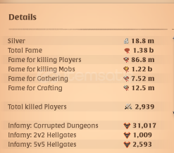Oyundaki bütün contentlere rahatlıkla girebilecek bir hesap.-Clouth cowl/robe/sandals 900 (aralarında 106-111-116 olanlar var)-leather hood/jacket/shoes 900 (aralarında 106-111-116 olanlar var)-plate helmet/armor/boots 900-bütün of handler 100 aralarında (116-120 olanlar var)-arcane 800/801-spear 800/800-axe 800/800-bow 800/800-dagger 700/800-shapeshifter 700/800-curse 350-holy 300-fire 350-druid 400-gloves 250t8 gather alt specleri iyiT8 At yetiştiri...