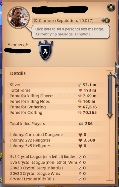 Total: 170m FamePVE: 160M Fame40M Combat famePVP: 6.8M Fame (250 kill)1.610 Learning point varHesapta 100m nakit silver vardır (1500 liraya yakın zaten nakit silver var arkadaşlar bunuda göz önünde bulundurun lütfen ) Off-handler full 100 specRMT kesinlikle yapılmadıHesapta güzel combat fame ve silver var başlangıç için güzel bir hesap