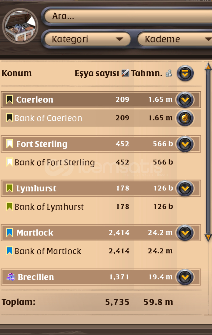 ZırhlarCloth Kafalı : 900Cloth Göğüslük: 576Cloth Ayakkabı: 900Leather kafalık: 900Leather göğüslük: 906Leather ayakkabı: 850Plate ayakkabı: 906Plate göğüslük: 900Plate kafalık: 900Silahlar Sword: 800Axe: 551Hammer: 557Yumruk: 377Mace: 500 küsürBir çok kostüm ve pegasus atı bulunan bir hesap çok fazla emek verilmiştir zvz ye tank olarak katıla bilieceği...