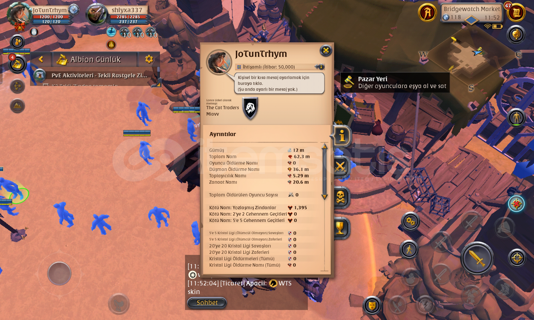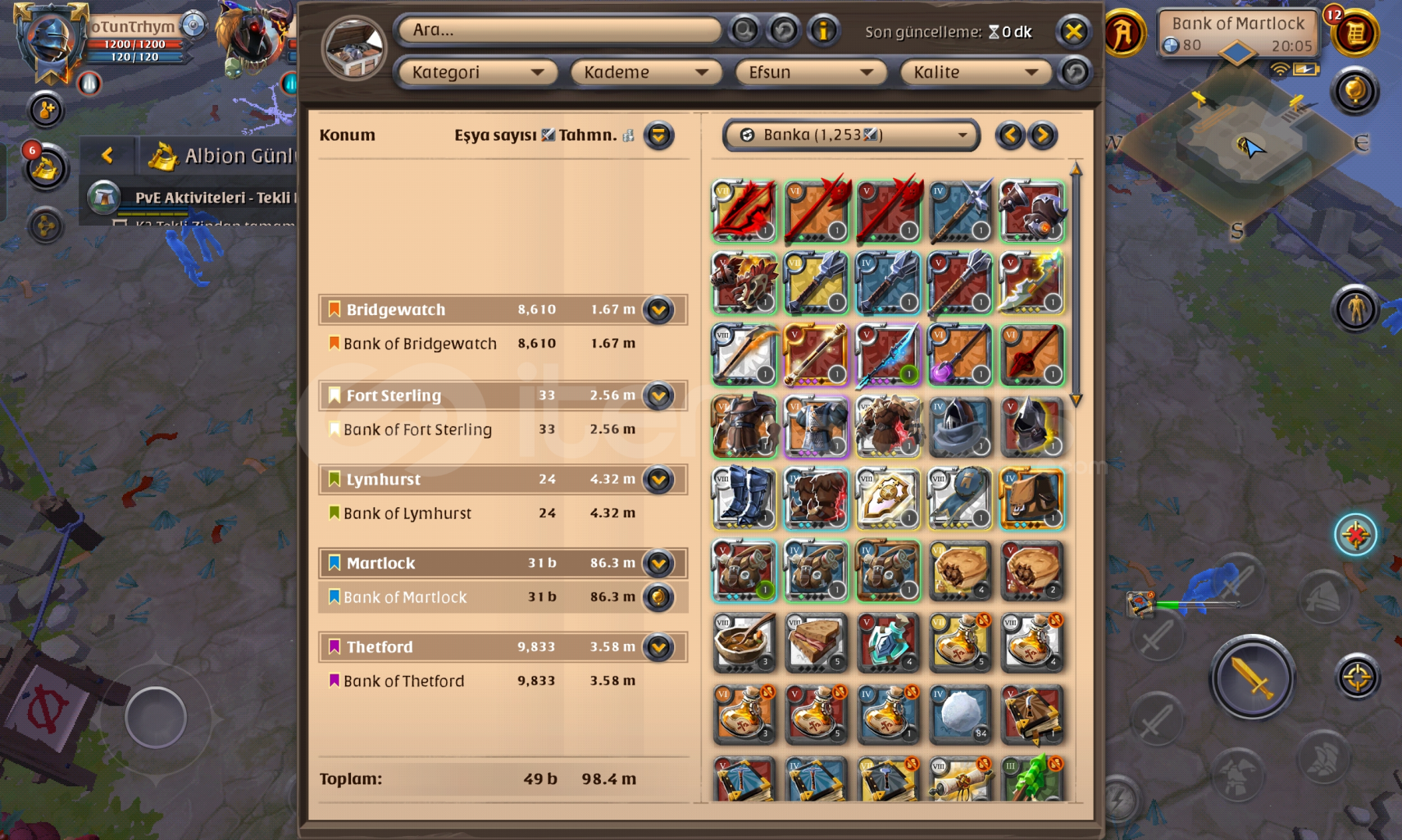 Emek hesap RMT yok ilk mail.Gather Cevher t 8 specleri 100 t6 30'.odun balık t6 taş ve keten T5.Plaka craft 95 te .Cevher rafineleri full. Kraliyet kostüm var ekstra.Specler plaka botlar 470, Zırhlar 650,Helmet 300.Deriler zırh 200, başlık 370,kumaşlar sandals290, robe 200, kafalık 270. İkinciller yarısı tamam.Sopa main Sopalar 700, Doğa asası son çıkan haykırış asası 100. Hesapta loot vardı...