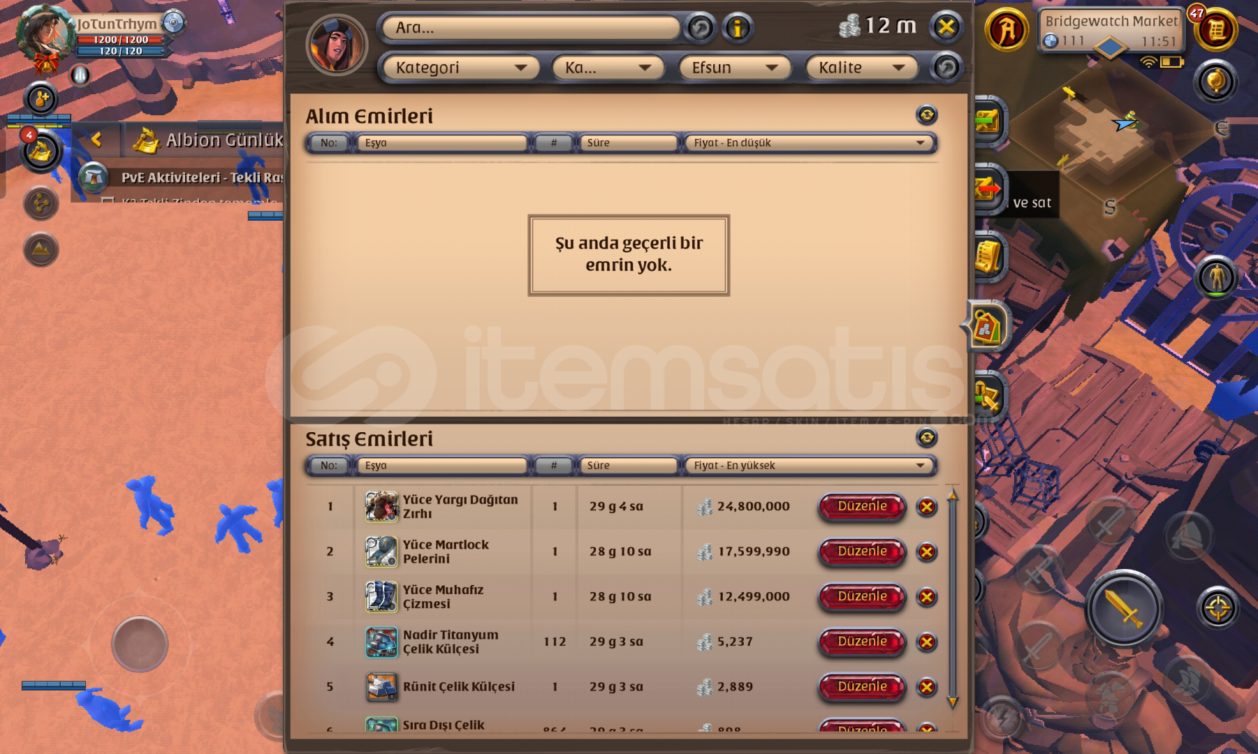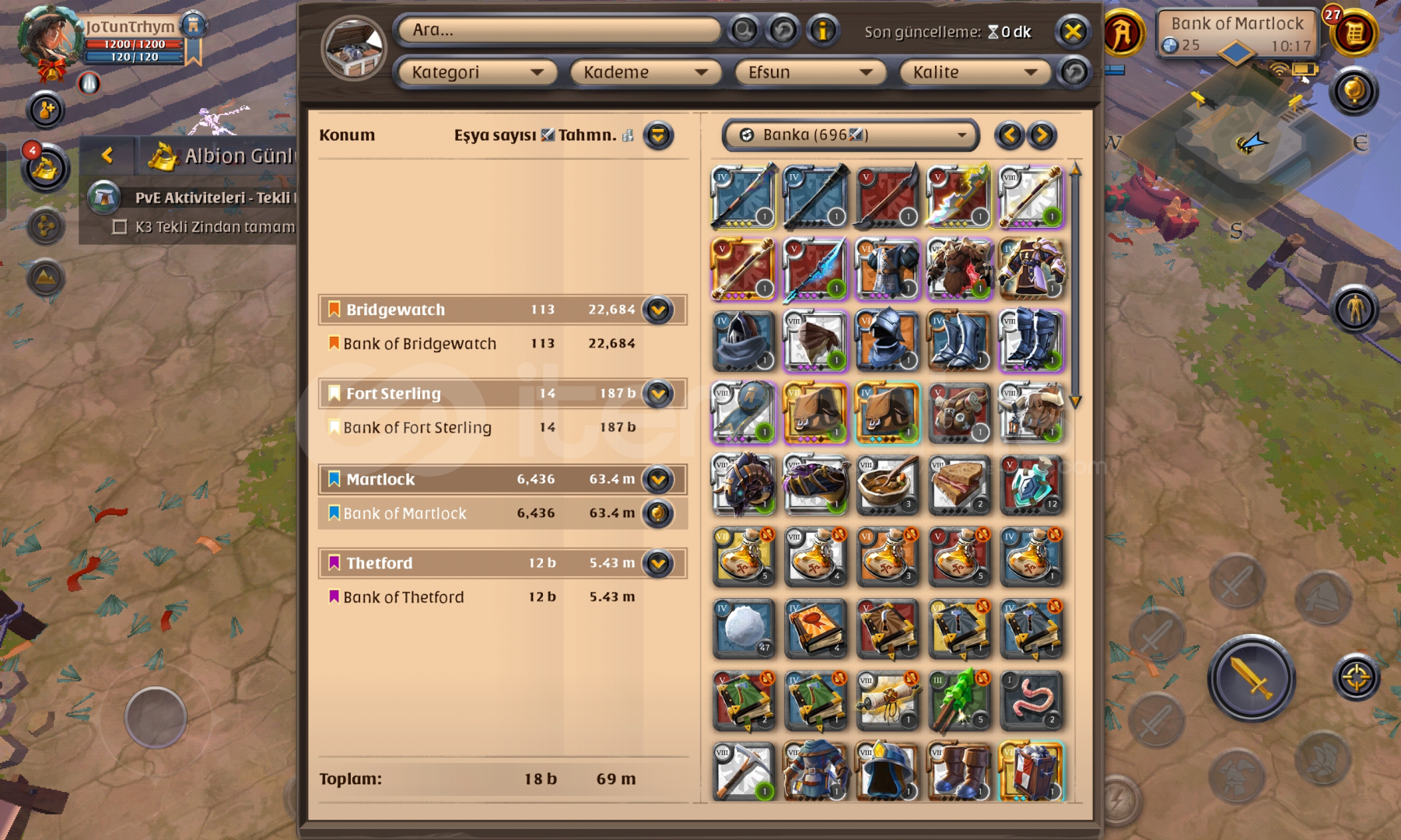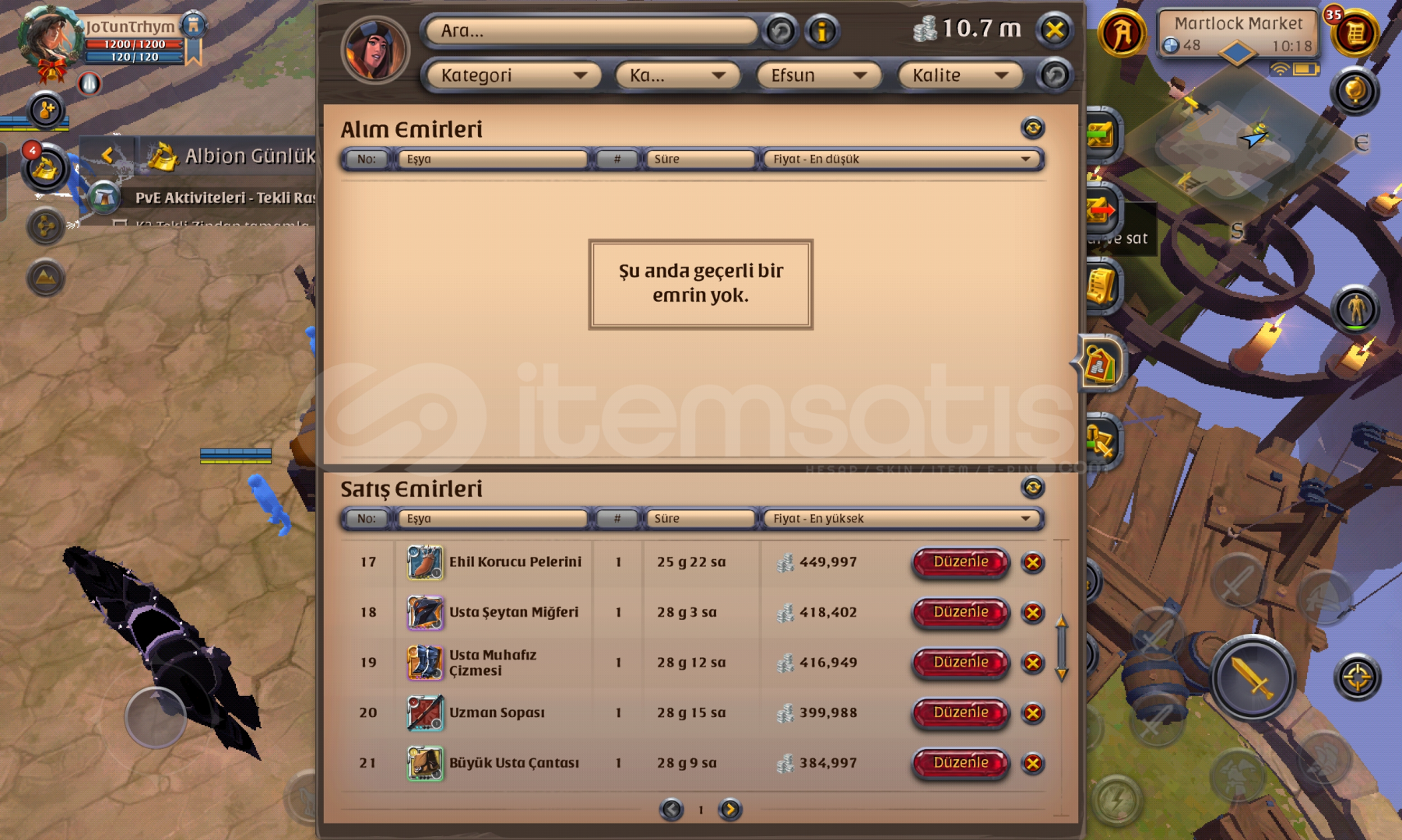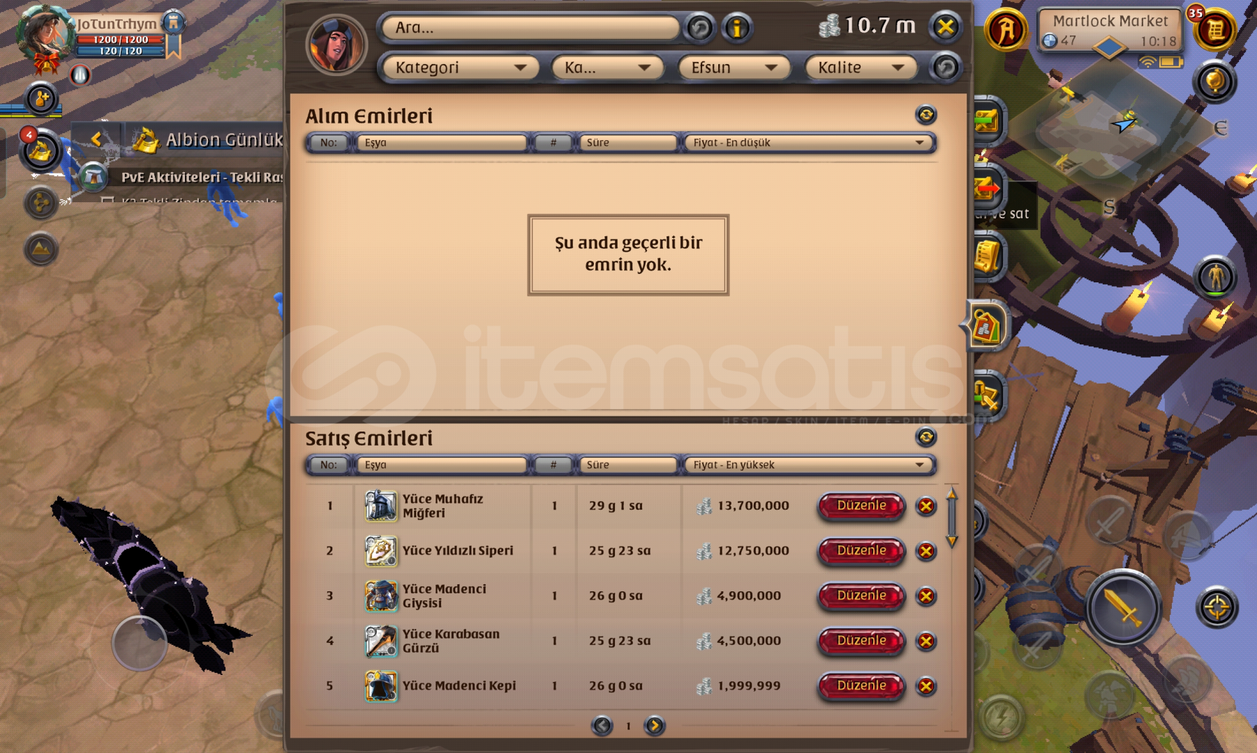 RMT hiç yapılmadi.ilk mail teslim.market ve kasada toplam 190m malzeme hâlinde silver mevcut.gather Cevher t 8 dir diğerleri t5. Cevher specler T5 100 spec T4,100spec t6 27.craftta plate açık 95 spec.adada 5 ev T5 Cevher işçisi mevcut.1 ay premium var. Specler,Sopalar 580 ,plateler 500,plaka ayakkabı 300 plaka başlık 370, ceket 200, başlık 200, kumaş ayakkabı 300 elbise 200 başlık 250,