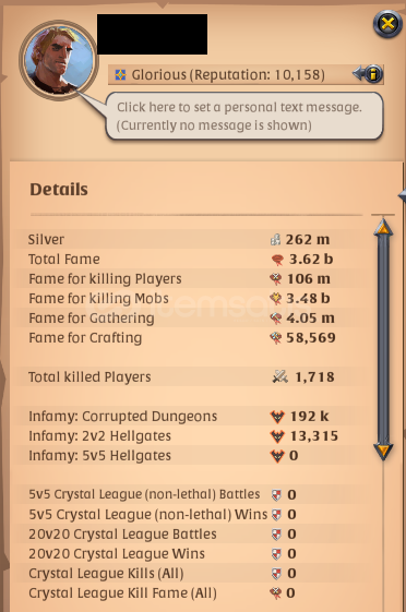 kısaca tüm kıyafetler 100 bazıları 110+ hammer curse (cursed staff120) crossbow ağaçları 700 tüm crystal silahlar 100 spec 1.79b combat fame kredisi ve 260m nakit silver bulunmaktadır tüm gatherlar (balıkçılık dışı) t8 dir.