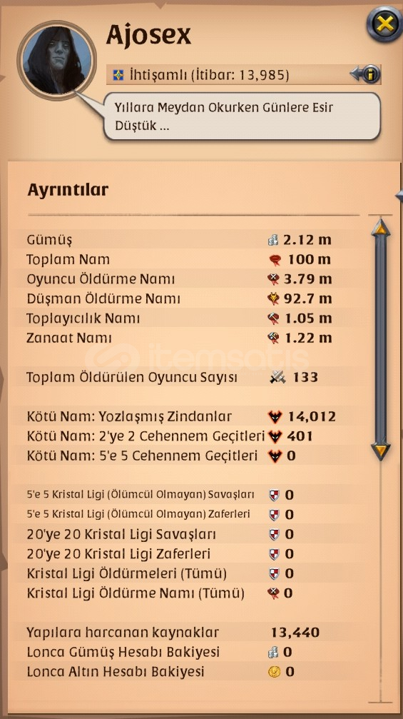 dostlar öncelikle herkese merhabalar hesabım eylül ayında açılmıştır kısa sürede solo bir şekilde bu fameye ulaştım ve artık bırakmaya karar verdim hesabı uzatmadam şöyle anlatayım 2x ada 6 seviye 3760 altın Gathering olarak kazma T8 Taş t4 olup diğerleri T6 dır Afet asası + uzun yay + şövalye miğferi + paralı asker ceketi + uğursuz ceketi + ismi...
