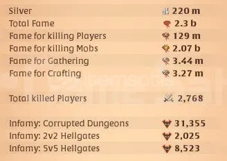 elle kasılmış emek kokan hesapOynama süresi: 2ay 7gün 16saatsilver: 220mcombat fame credit: 60.5mtotal fame: 2.3bfame for killing players: 129mfame for killing mobs: 2.07bfame for gathering: 3.44mfame for crafting: 3.27mtotal killed players: 2,768mit has fully upgraded brecilien island with house - son aşamaya kadar geliştirilmiş brecilien adası ve içinde evgathering tools: all tier8 - gatherların hepsi tier 8lanet/curse: 833/800buz/frost:...