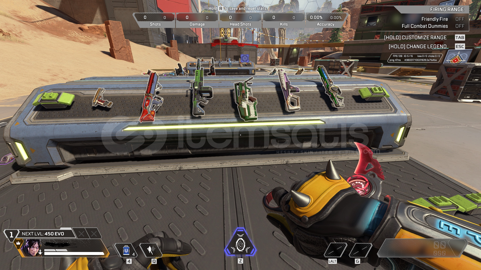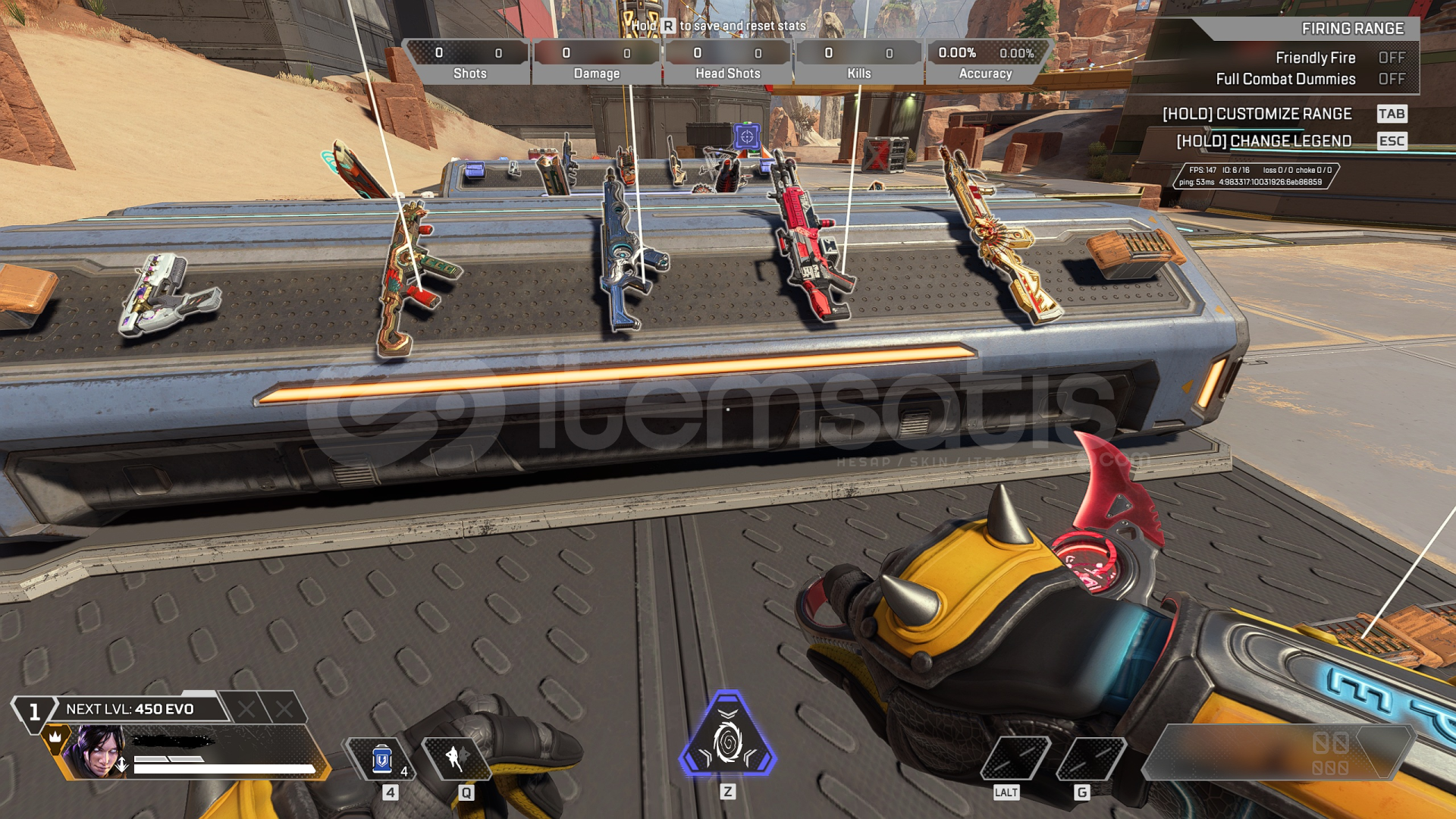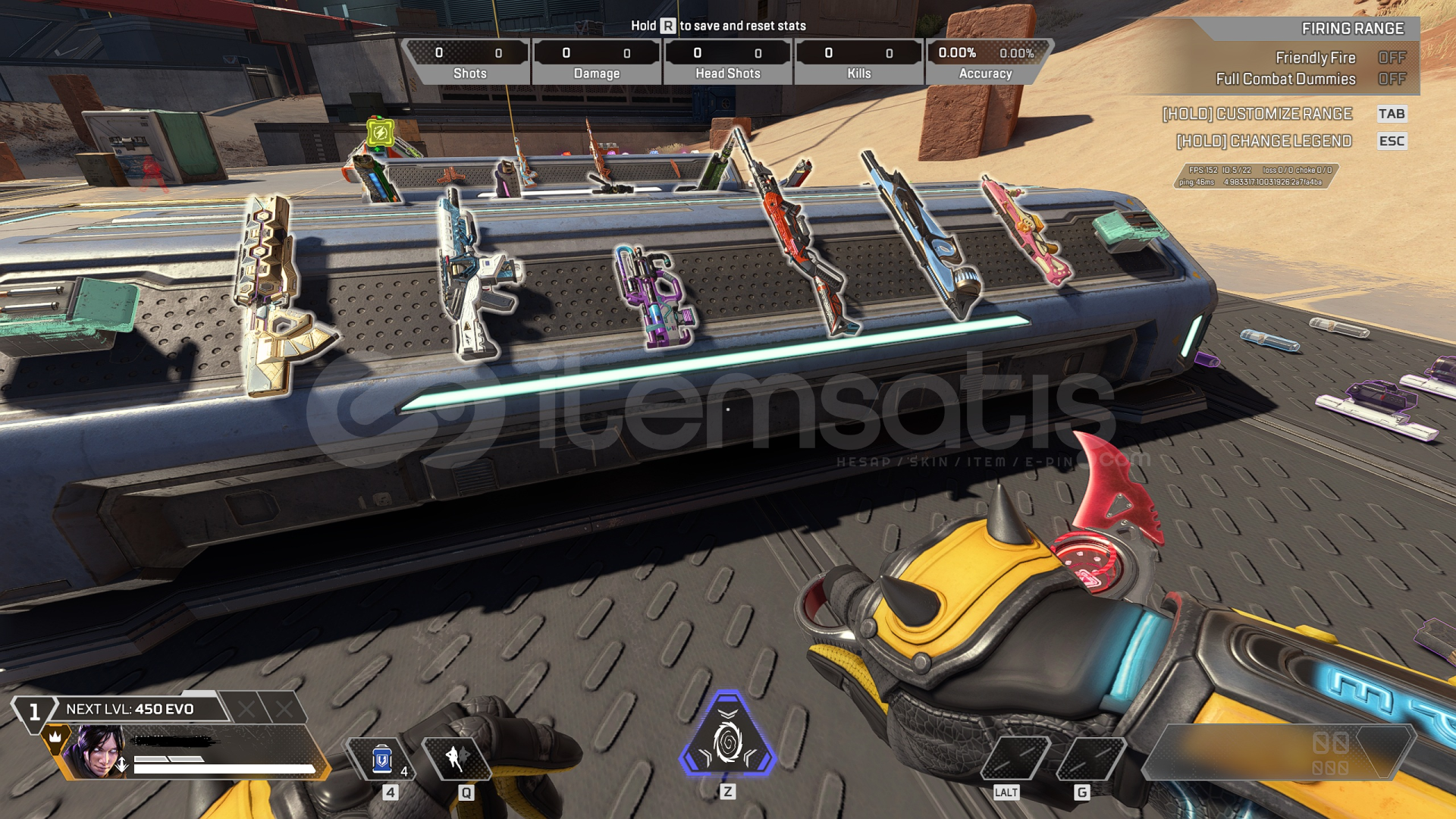 -KARAMBİT(sadece bordo renk var), BUZLU BALTA, R-301 MİTİK(tüm set) bulunmaktadır.-Sezon 20 ve sonrasındaki bütün battlepasslar (s22 den itibaren başlayan 20 dolar fiyatlı ultımate battlepassların hepsi) bitirilmiştir.-11 Farklı silahta 22 Reaktif skin bulunmaktadır. (battlepass ödülleri dışında beyaz flatlıne, buzlu hemlok, ve marketten exotik shardla satın alınan recolor r99, eva ...
