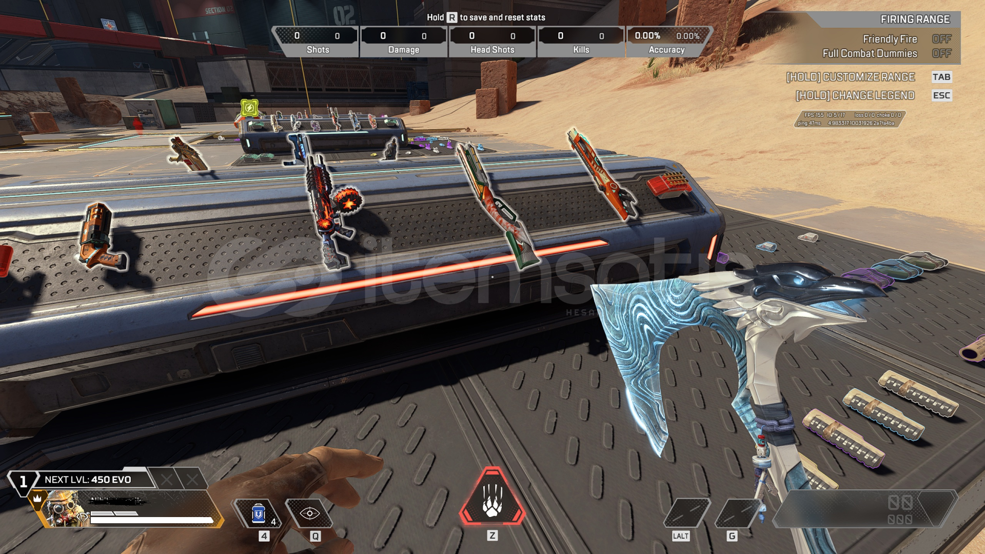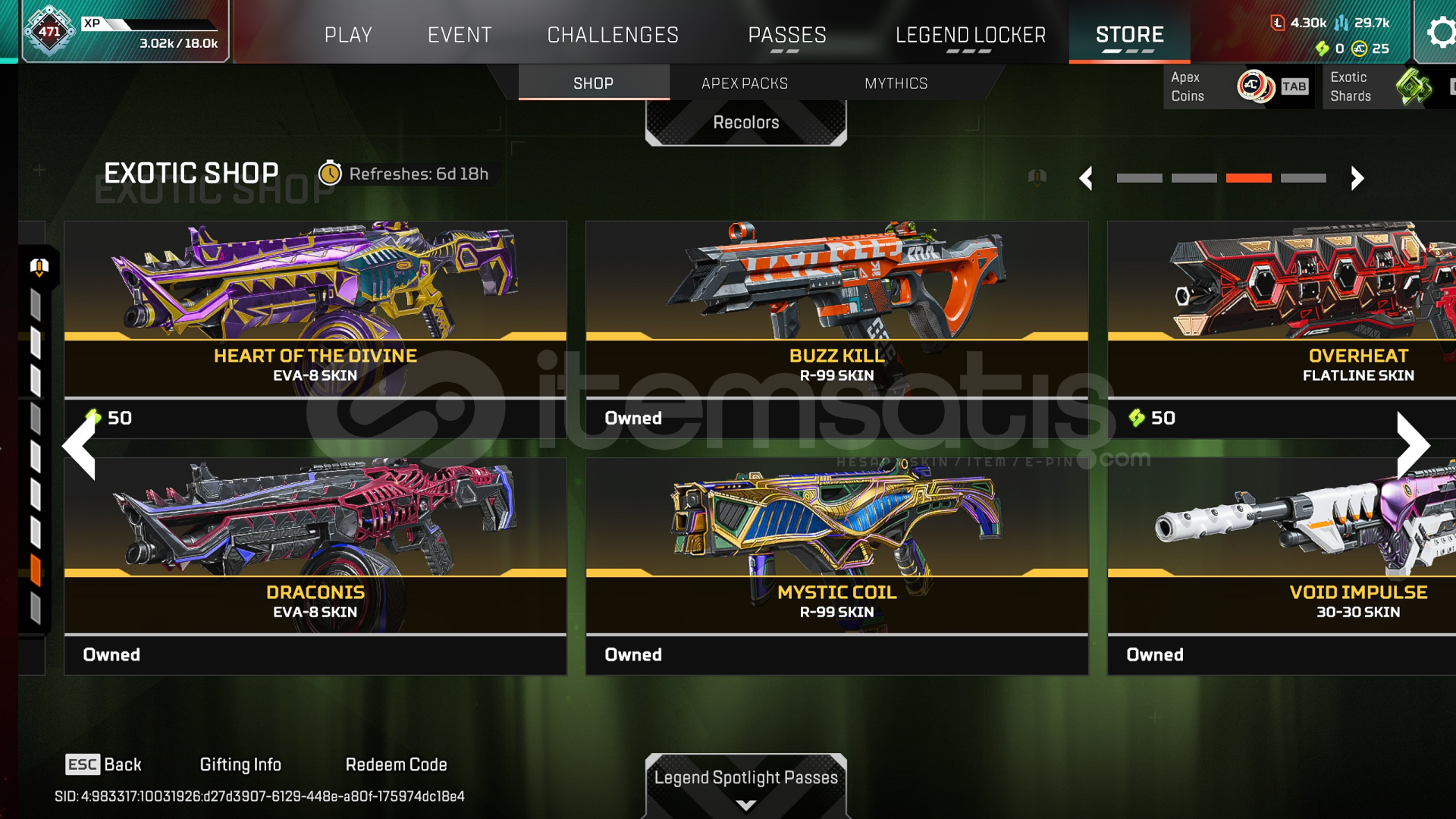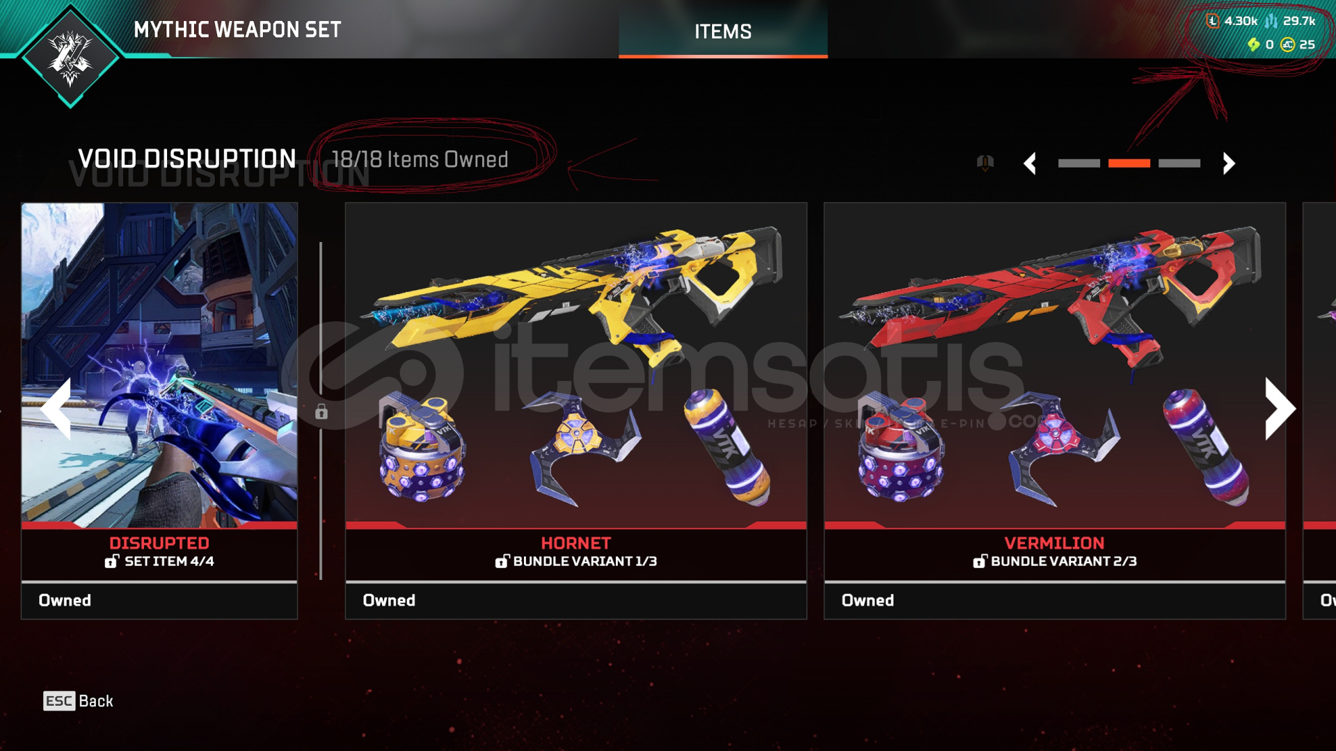 -KARAMBİT(sadece bordo renk var), BUZLU BALTA, R-301 MİTİK(tüm set) bulunmaktadır.-Sezon 20 ve sonrasındaki bütün battlepasslar (s22 den itibaren başlayan 20 dolar fiyatlı ultımate battlepassların hepsi) bitirilmiştir.-11 Farklı silahta 22 Reaktif skin bulunmaktadır. (battlepass ödülleri dışında beyaz flatlıne, buzlu hemlok, ve marketten exotik shardla satın alınan recolor r99, eva ...