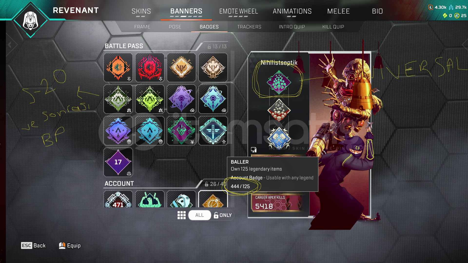 - Hesapta 451 legendary vardır. (122 karakter, 120 silah legendary skin vardır.)