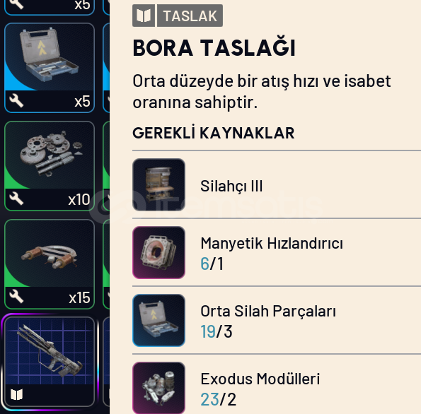 Bora silahının öğrenmeye hazır blueprintiGüvenli cebi olan bir bir mod takarsınız eşyayı size veririm ve çıkışa kadar size eşlik ederim.Güvenli cebi olmadan kaybedilen eşyadan sorumlu değilim.