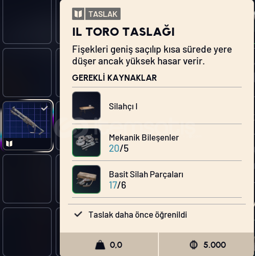 Oyundaki Il Toro silahını craft’lamak için kullanılan blueprinttir.