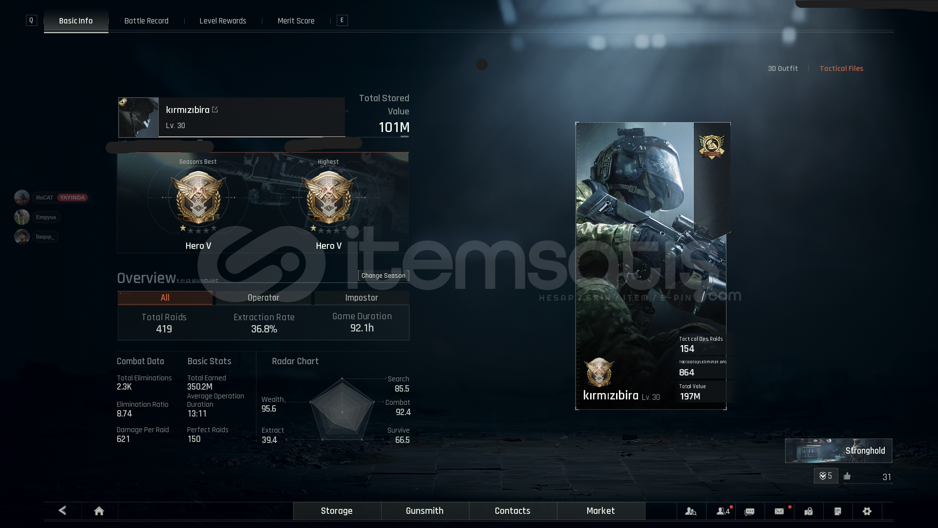 100m kasa değeri 45m nakit olmak üzere + 600 BOND para vardırçeşitli silah skinleri vardır battlepass bu sezonun fullenmiş şekilde duruyordur halihazırda 20 günlük 3x2 elite kasası vardır ayrıca 17 günlük 2x2 kasa kullanım fişi depoda bulunmakta150 slot full gold mermi bulunmakta ilginenen arkadaşlar mesaj atabilirler