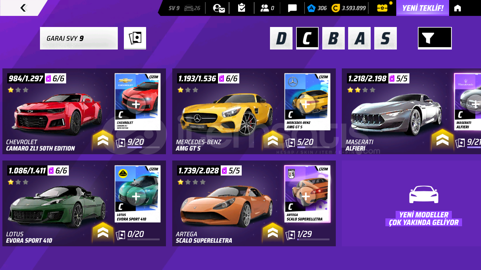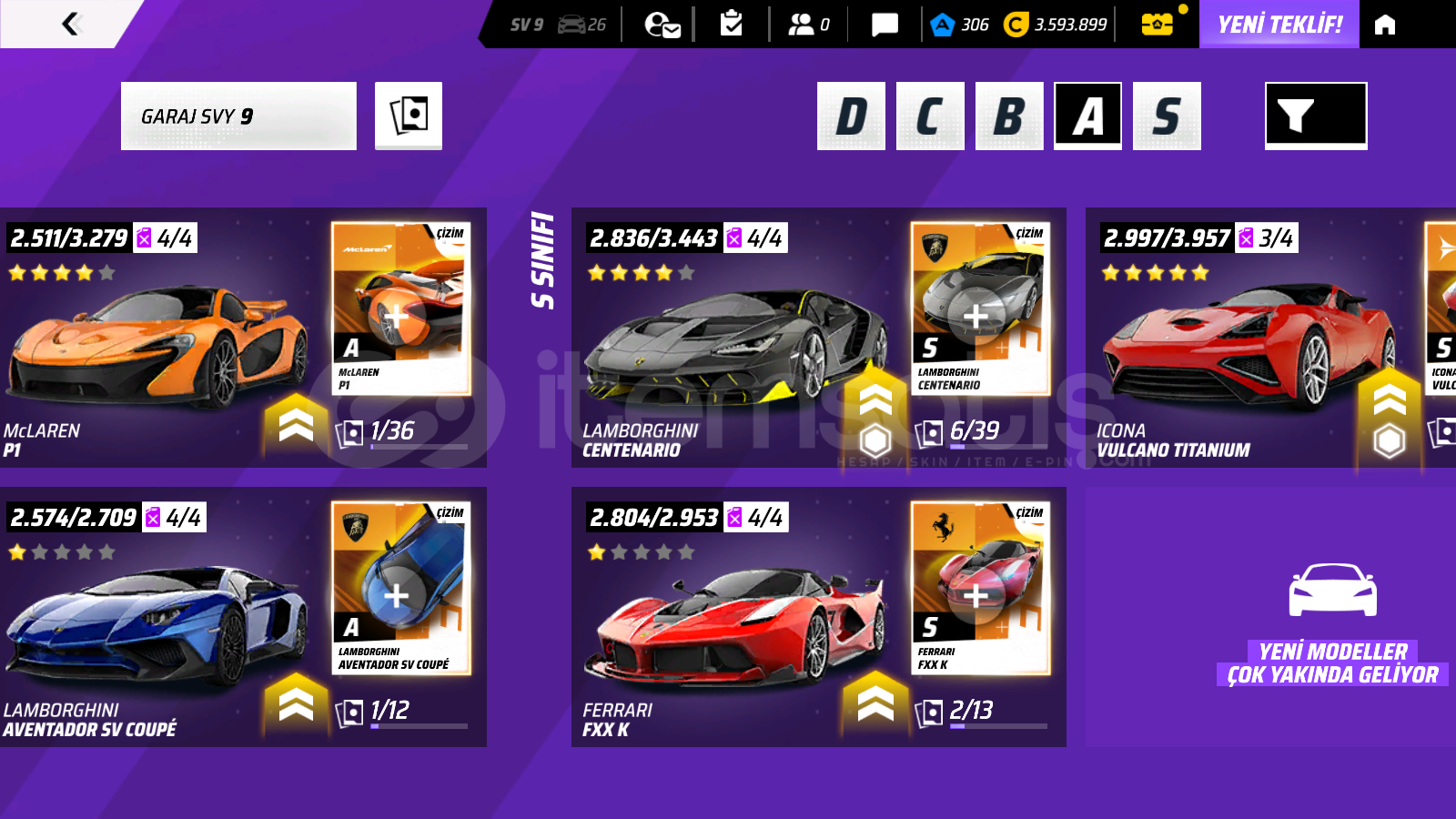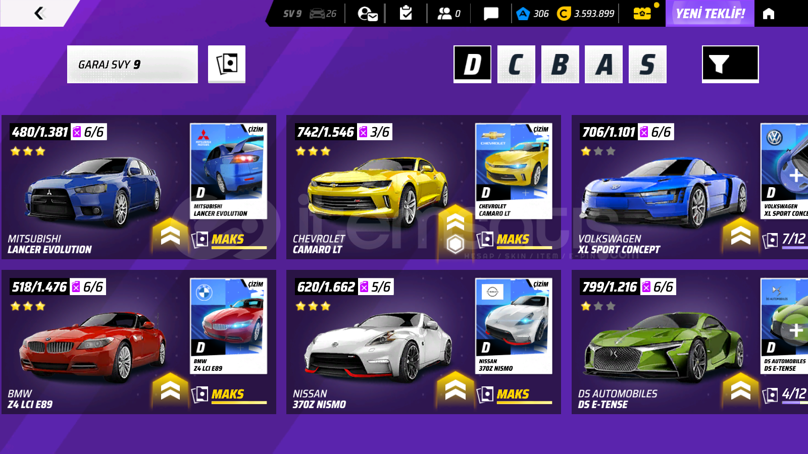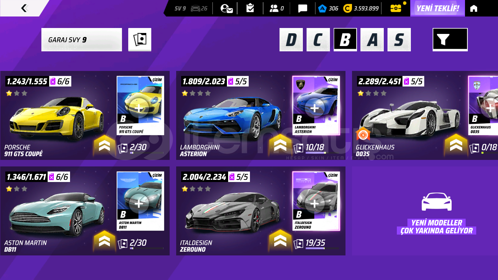 Hesap içerikleri: 306 jeton, 3.593.899 kredi, birbirinden nadir 26 araç bulunmaktadır. (son derece özel ve kullanışlı olan A, S ve B sınıfı araçlar dahil) ve onlarca ithal parça bulunmaktadır. Detaylar için görselleri inceleyebilirsiniz.