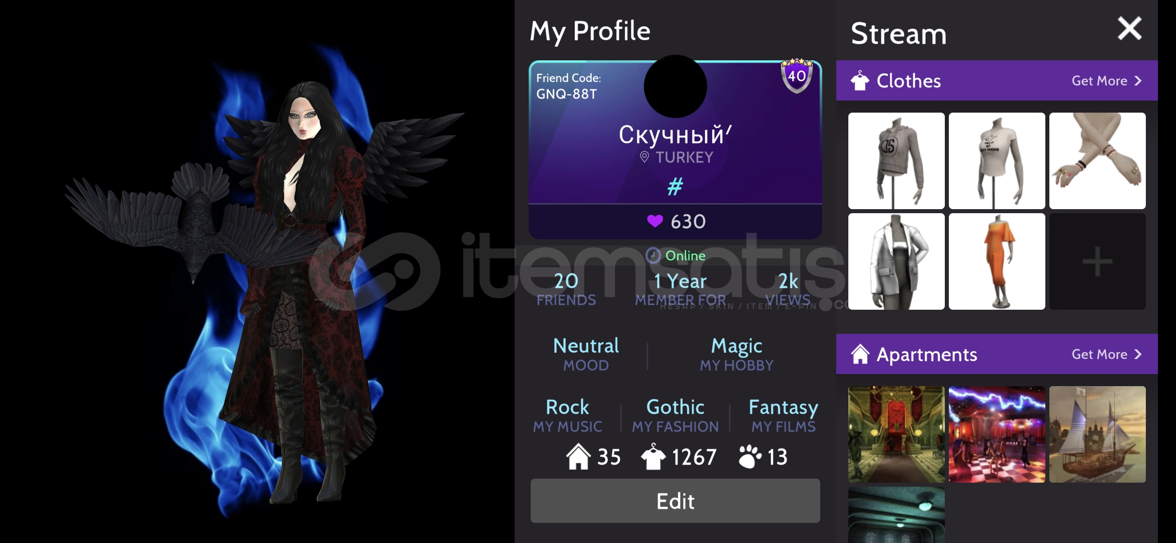 Bu hesap 1 yıllık 1 hesaptır içinde 1 adwt küçük siyah kanat bulunmaktadır ve toplamda 10 set bulunmakta ve 1267 kıyafet , 35 ev, 13 hayvan bulunmaktadır