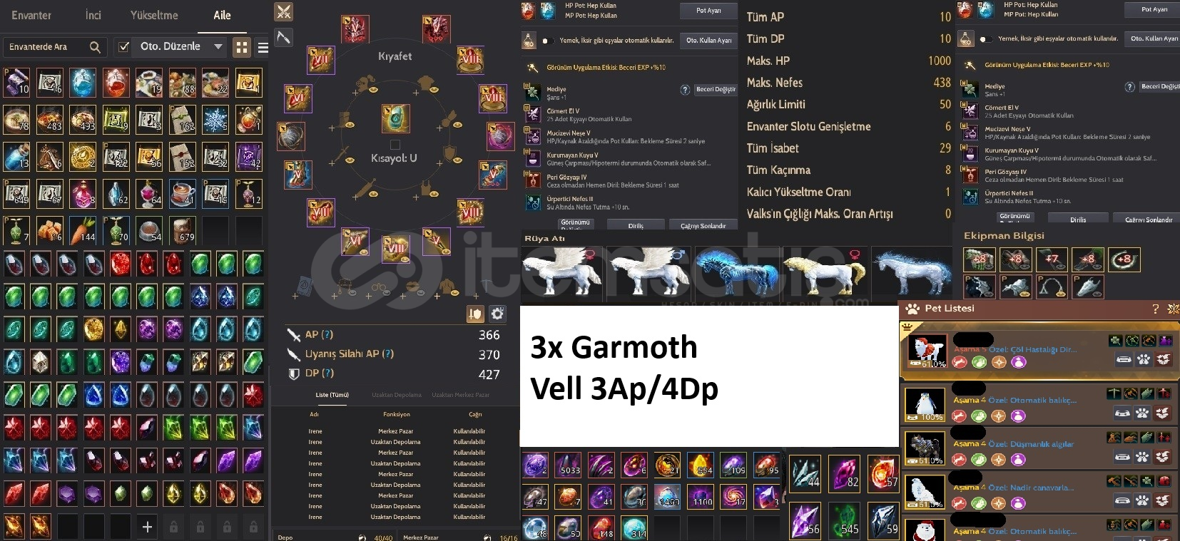 Tüm detaylar fotoğraflarda mevcut.Silahlarda 3x Garmoth ve biçimlendirme taşları basılı.Takılar full kadehli.Vell son seviye.T10 Dine, T10 Doom, T9 Arduanatt(erkek), T9 Arduanatt (dişi) mevcut. T10 arduanatt`a 8 kez denendi. +7 Krogdalo set mevcut.Pen sol var.Chat banı, uyarı vs. yoktur.Aciliyetinden dolayı fiyatı uygun tutuldu. Client hesaptır. Mail adresi ile teslim edilecektir. Sorularınız için pm atabili...