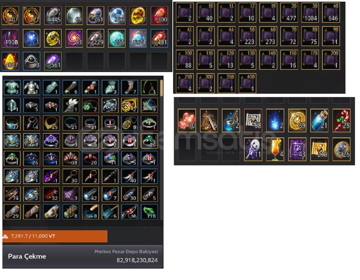 Kolay ilerleyebilecek eksiği olmayan bir hesap zamanım olmadığı için satıyorum.Mail adresi ayrıdır. 838 GS şu an 2k life seti var balıkçı. T10 atında rüzgar krogdalo seti mevcutŞu an 83 B mevcut değişiyor azalmaz.Detaylar resimlerdedir 66 witch 65 wiz 64 guard karakterleri mevut.Neredeyse tüm classlarda 61 karakter mevcut aile şöhretinden anlayabilirsiniz. Çoğunda kıyafet...