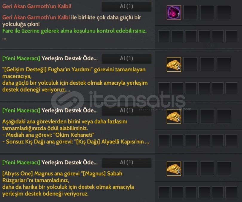 3T gümüş ve 18K Vefa var. Görev ile alınan 8T gümüş ve Garmoth Kalbi alınmadı. Görevden sonra alınmayı bekliyor.