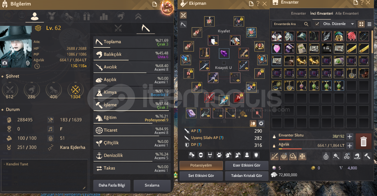 62 lvl dark knightTüm bonus packlerden 75-100 günlük varÇok fazla eşyası cartı curtu mevcut oyunu hatırlamıyorum birkaç fotoğraf var ordan görebilirsinizoyunu oynarken sürekli para yatırarak oynadım o yüzden içerisinde bir sürü eşya mevcutKarakter 290AP 10T pazarda parası var,eşyalarının çoğu para ile satılabilir ve iyi paralar ediyorlarAP/DP görevle...