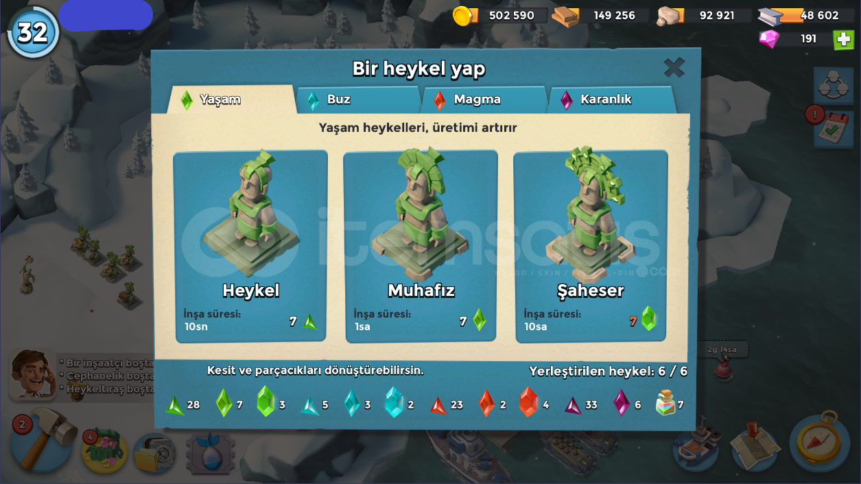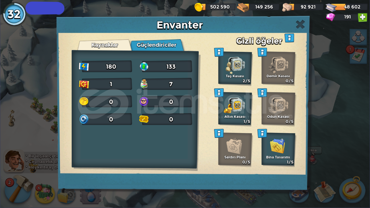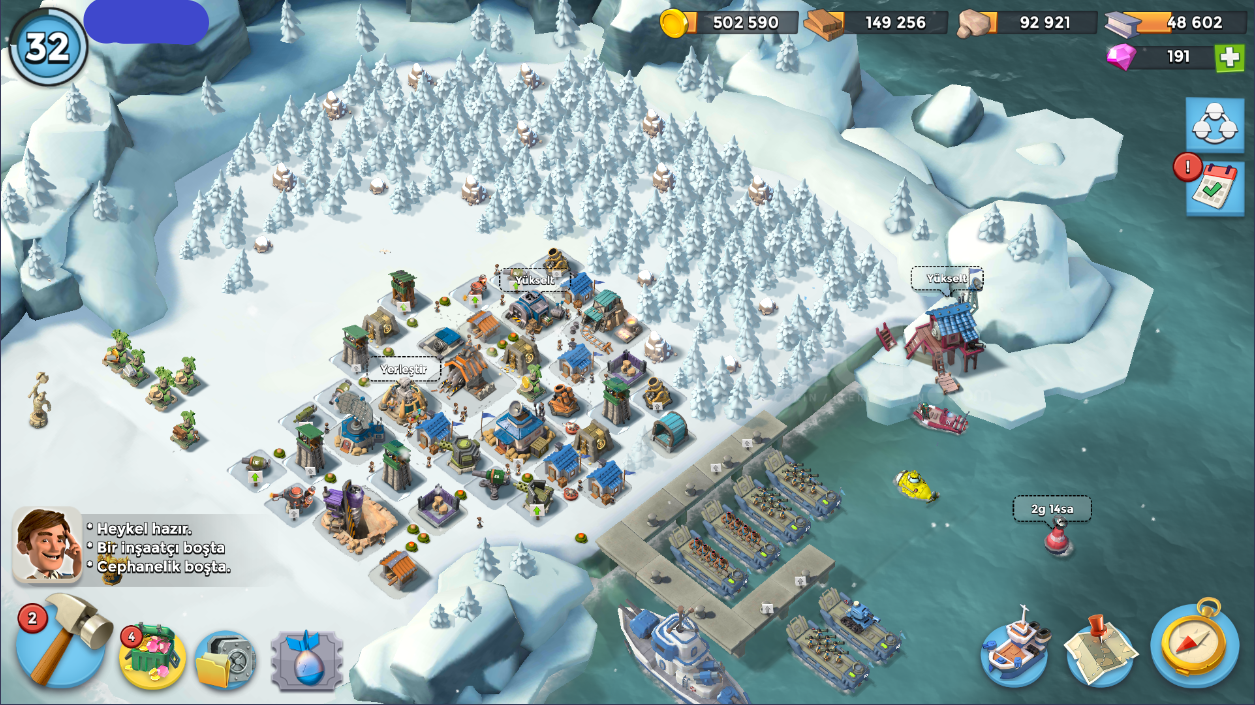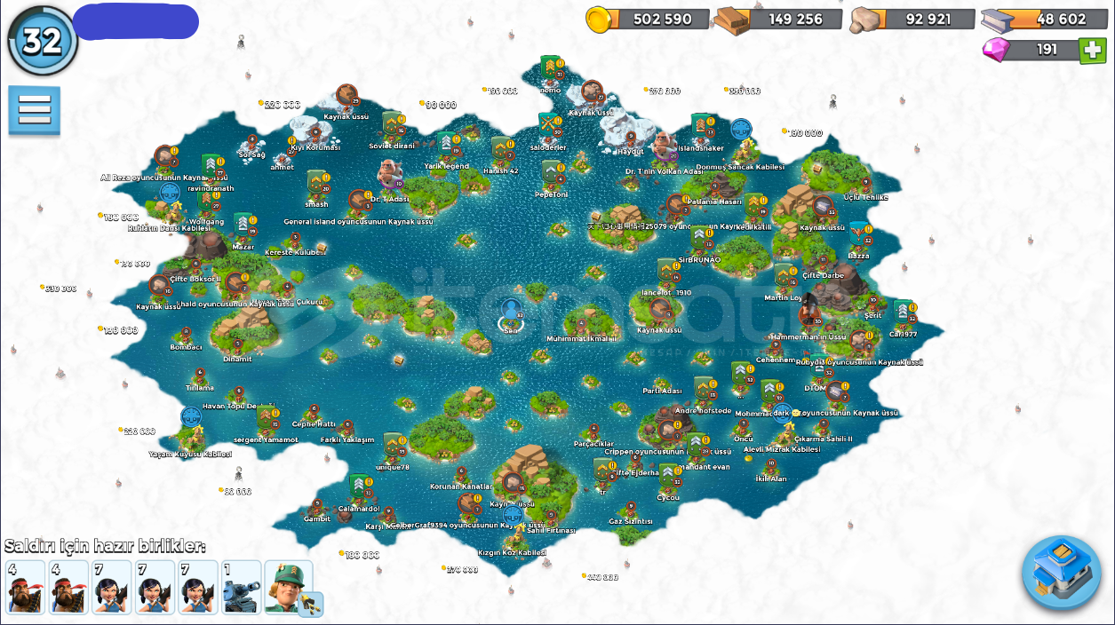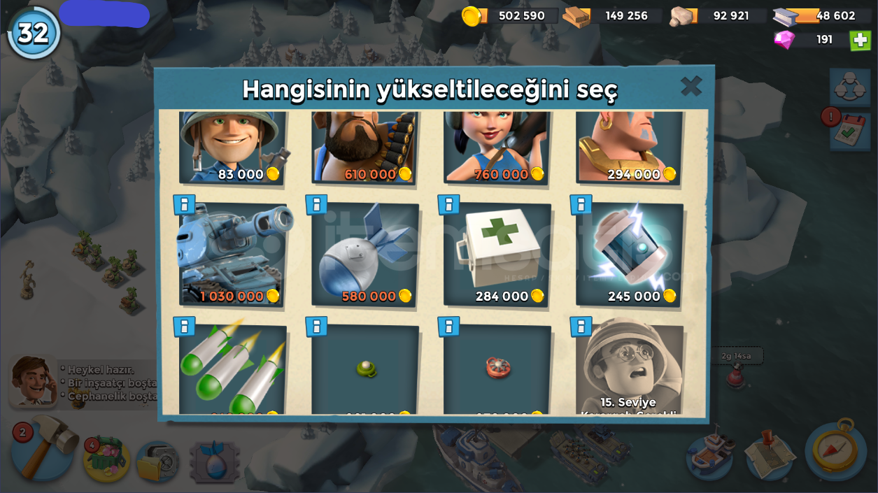 32 SeviyeTüm İçerik Resimlerde MevcutturKarargah: 12 levelÇıkartma Gemileri: 11-12 LevelGambot: 13 LevelDenizaltı: 5 LevelKeskin Nişancı Kuleleri 9-13 LevelHavan Topları: 10-13 LevelMakineli Tüfekler: 1-12 LevelToplar: 1-8 LevelDemir Madeni: 3 LevelTaş Ocağı: 6 LevelKereste Fabrikası: 8 LevelKonutlar: 7 LevelHeykeltraş: 4 LevelTaş Depoları: 6 LevelAltın Depoları: 8 LevelDemir Deposu: 4 LevelOdun De...