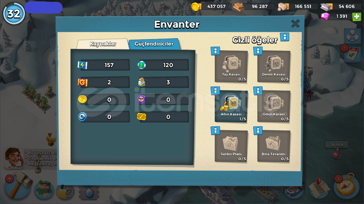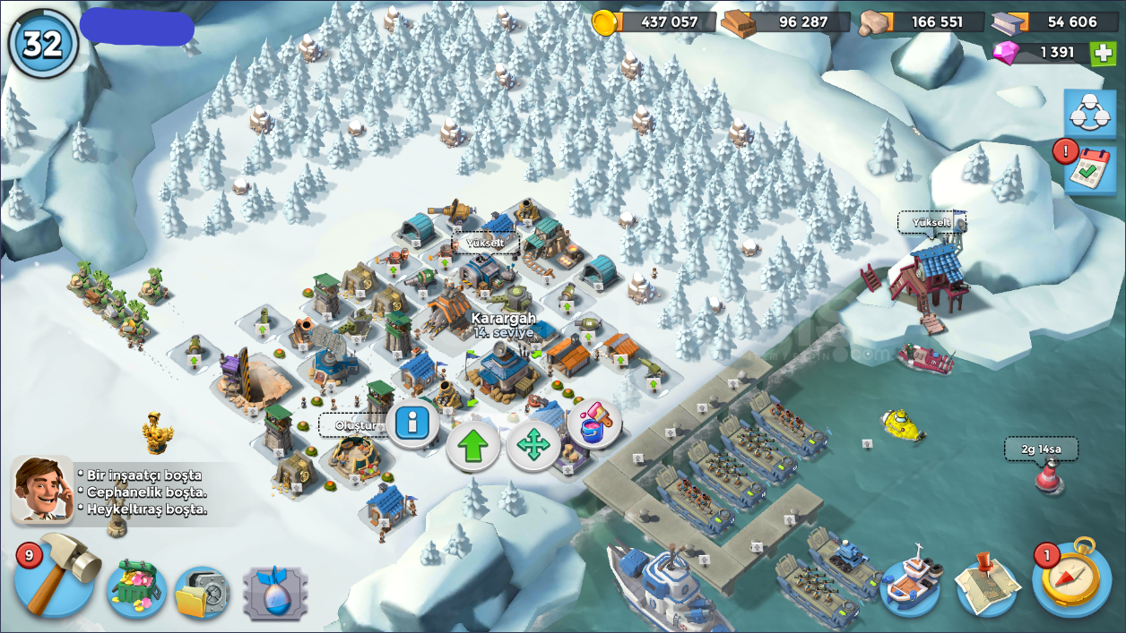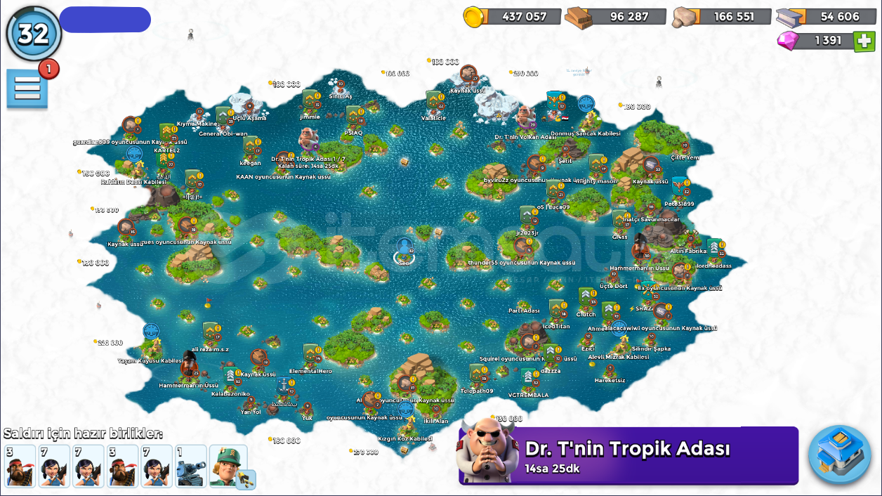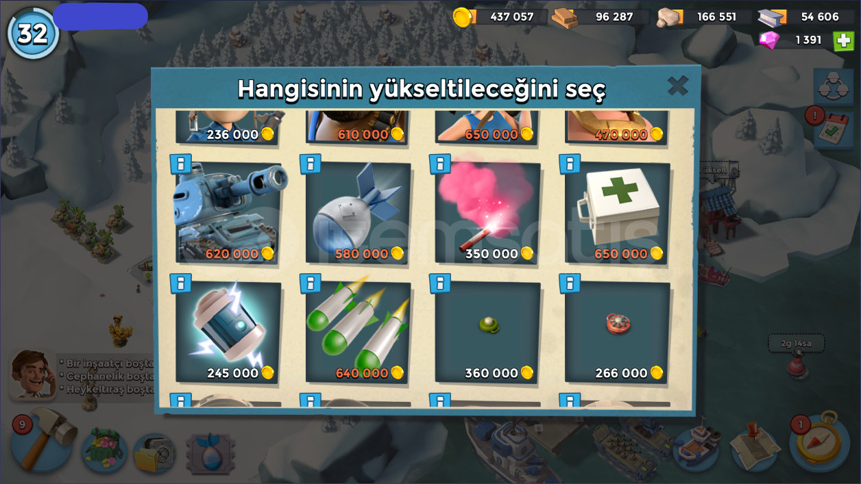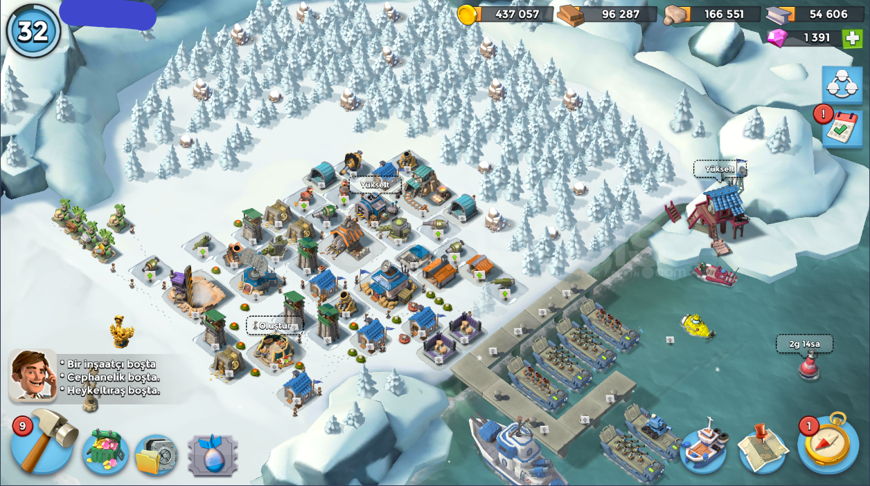 32 SeviyeTüm İçerik Resimlerde MevcutturKarargah: 14 levelÇıkartma Gemileri: 10-11 LevelGambot: 13 LevelDenizaltı: 6 LevelKeskin Nişancı Kuleleri 11-13 LevelHavan Topları: 8-11 LevelMakineli Tüfekler: 3-10 LevelToplar: 1-11 LevelDemir Madeni: 4 LevelTaş Ocağı: 7 LevelKereste Fabrikası: 8 LevelKonutlar: 7-8 LevelHeykeltraş: 3 LevelTaş Depoları: 7 LevelAltın Depoları: 8 LevelDemir Deposu: 5 LevelOdun...
