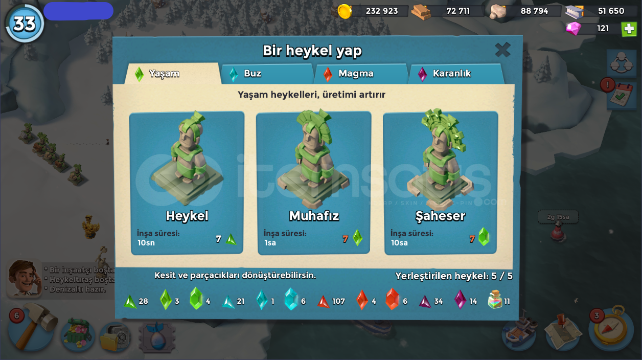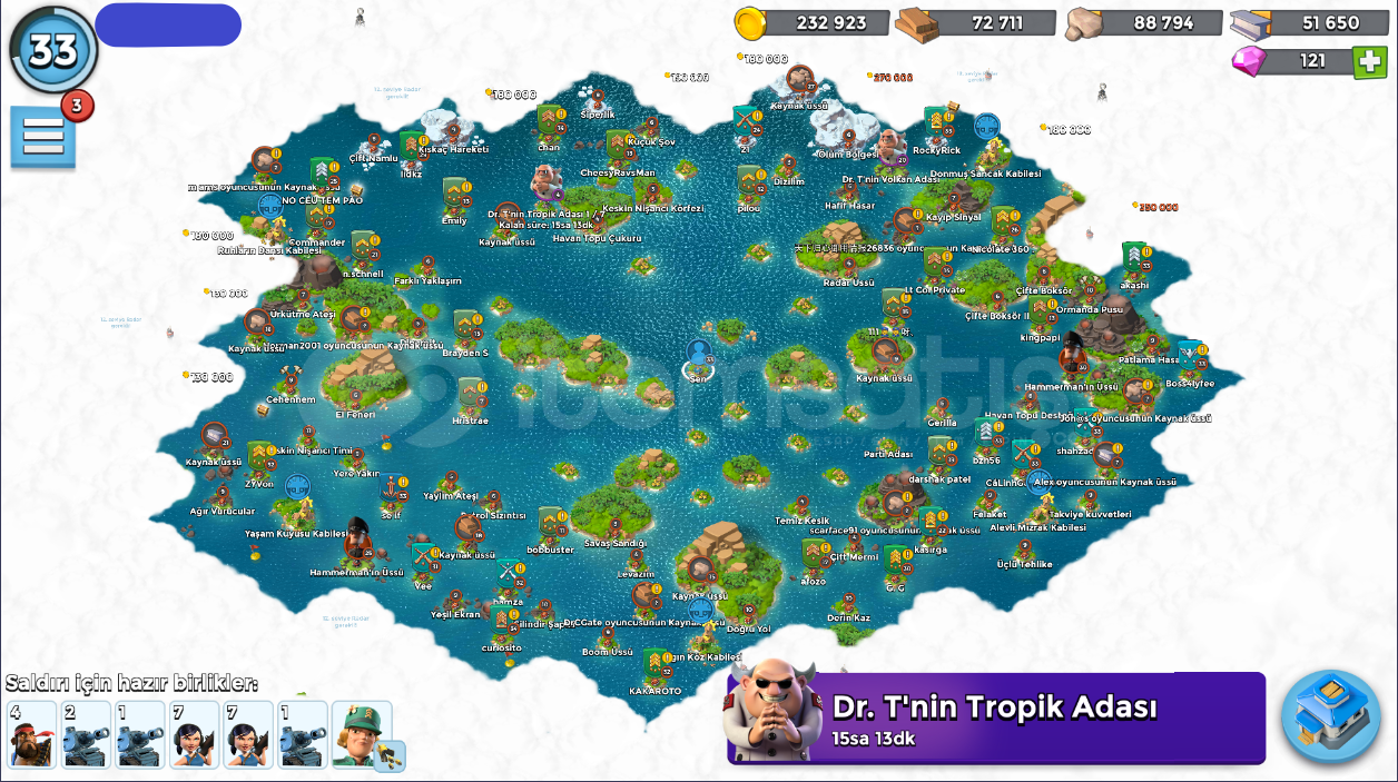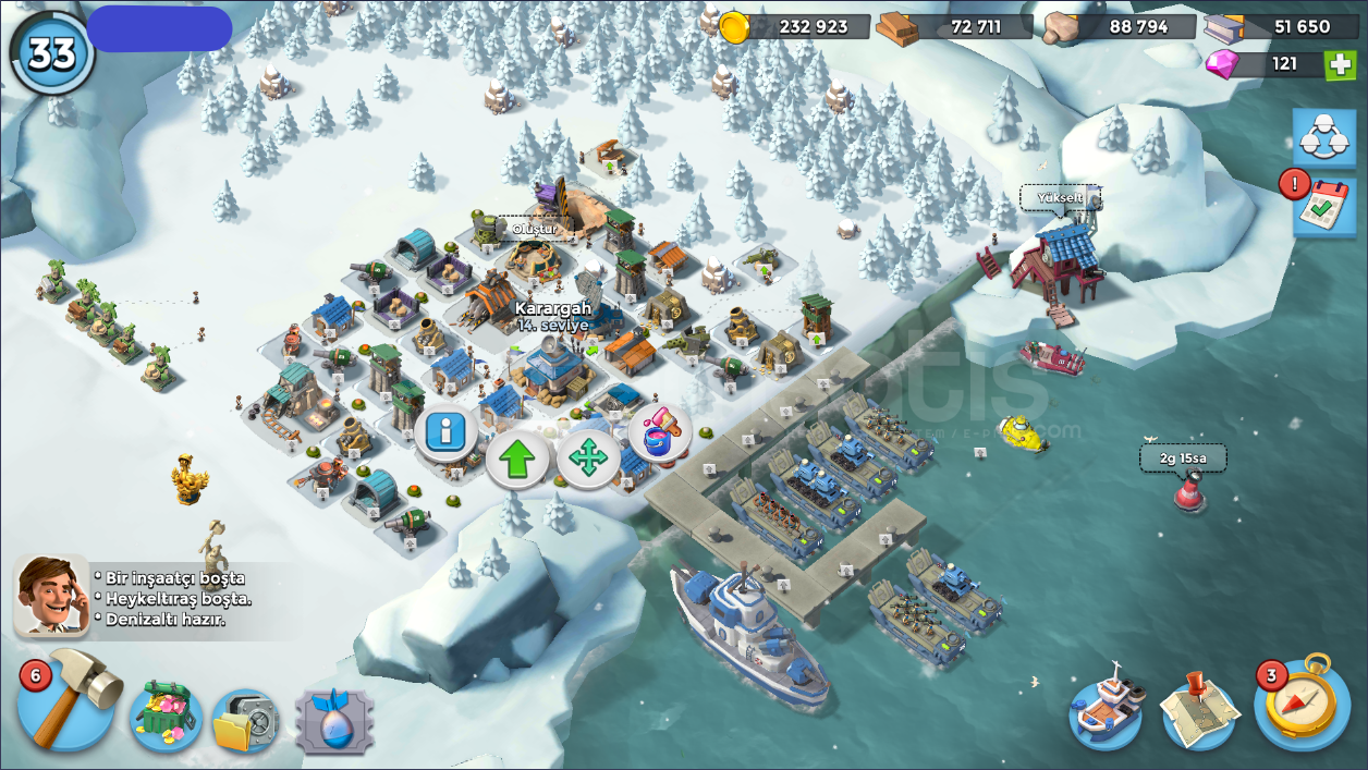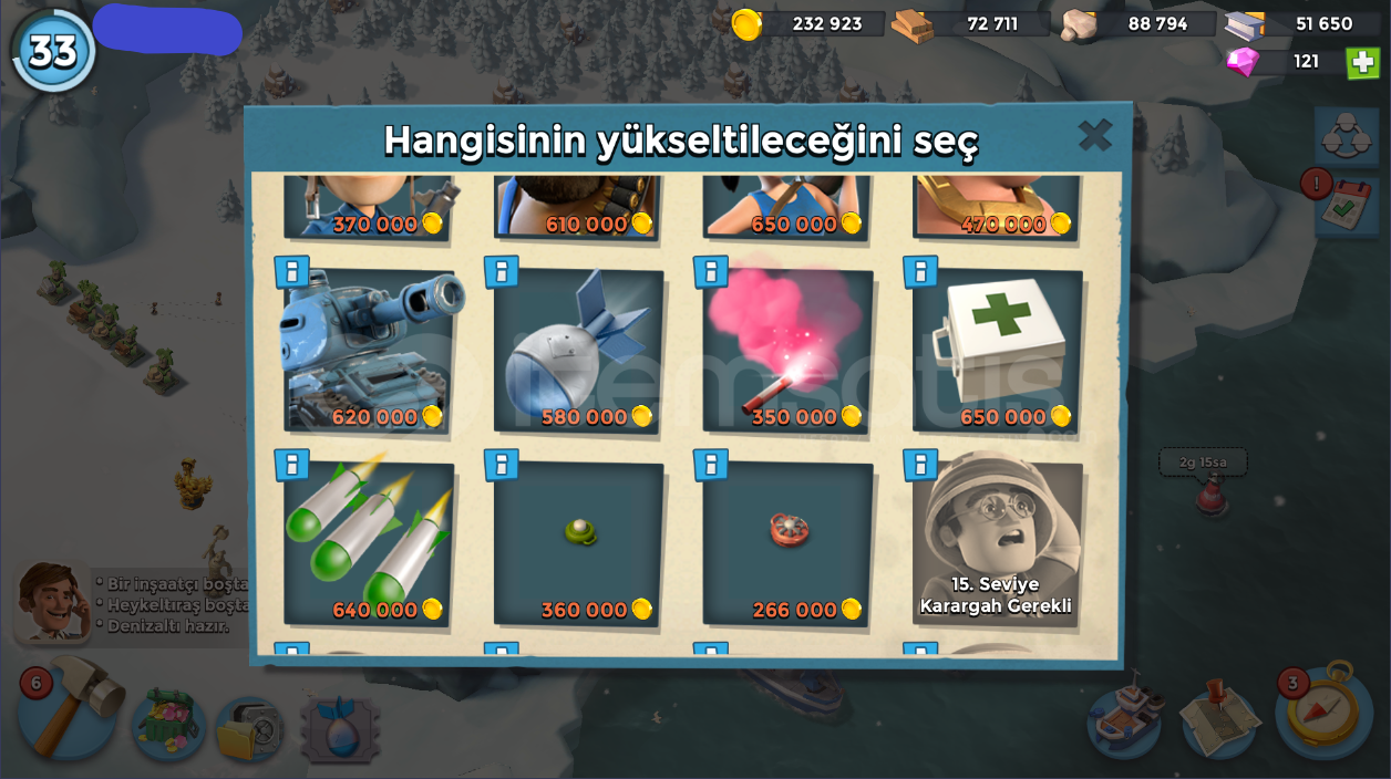 33 SeviyeTüm İçerik Resimlerde MevcutturKarargah: 14 levelÇıkartma Gemileri: 10-12 LevelGambot: 13 LevelDenizaltı: 6 LevelKeskin Nişancı Kuleleri 7-12 LevelHavan Topları: 10 LevelMakineli Tüfekler: 4-11 LevelToplar: 6-8 LevelDemir Madeni: 4 LevelTaş Ocağı: 7 LevelKereste Fabrikası: 8 LevelKonutlar: 7-8 LevelHeykeltraş: 3 LevelTaş Depoları: 7 LevelAltın Depoları: 8 LevelDemir Deposu: 5-6 LevelOdun D...