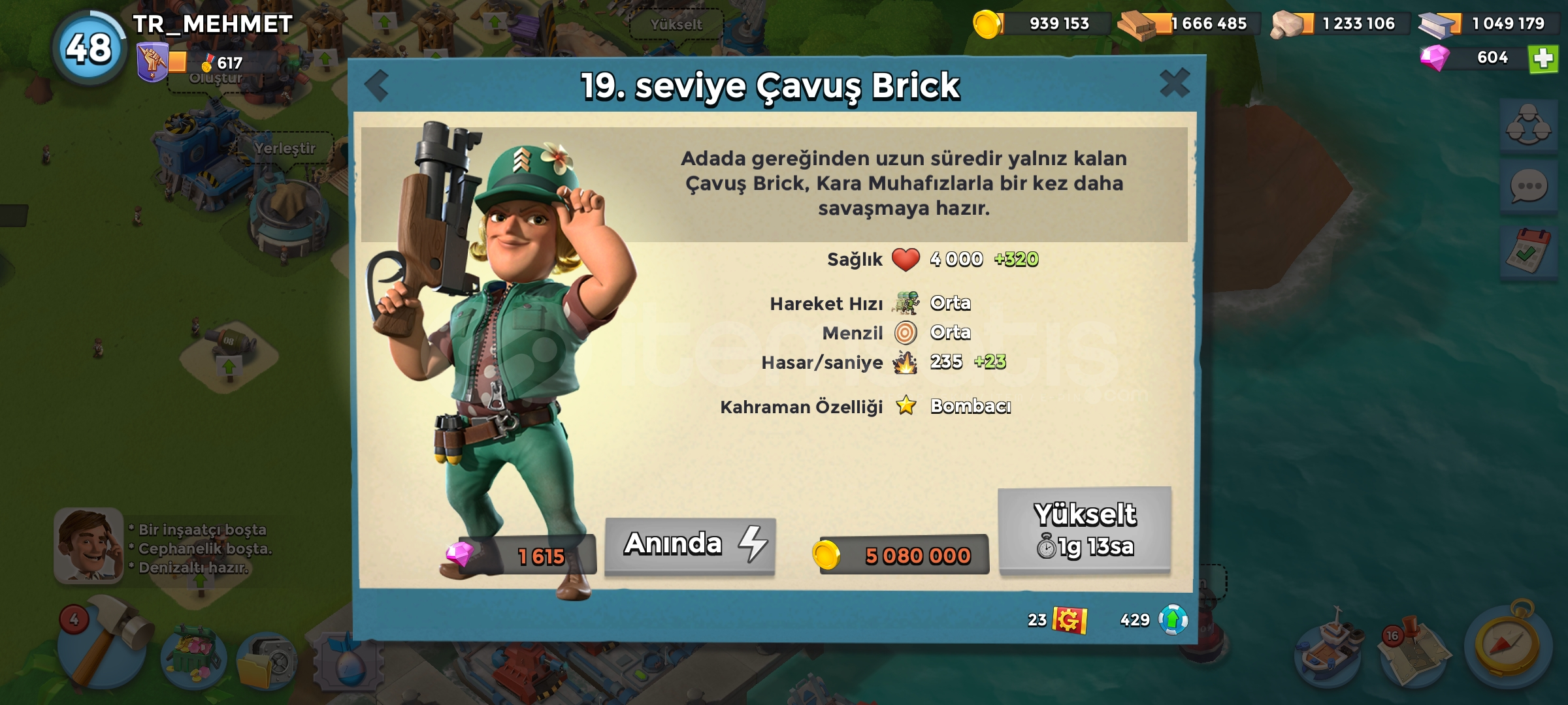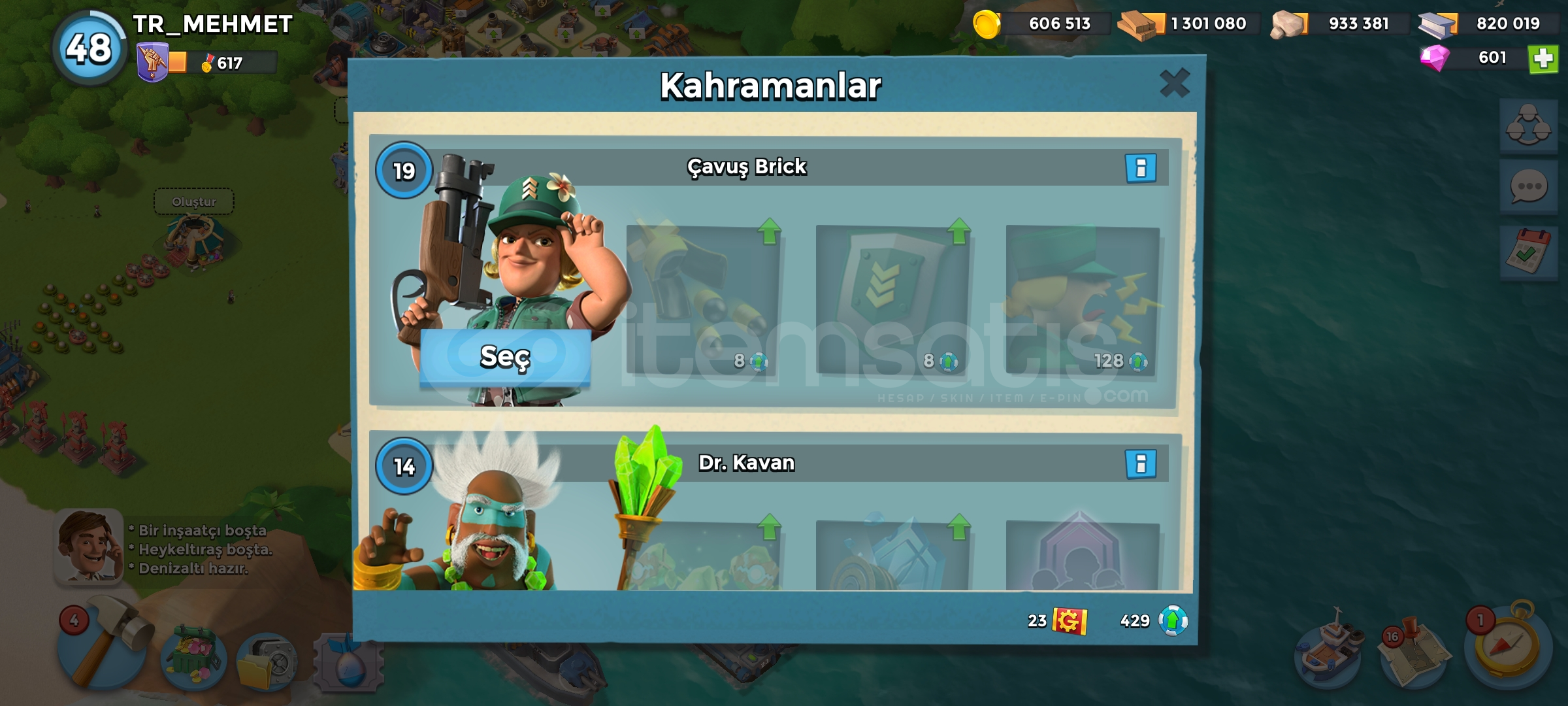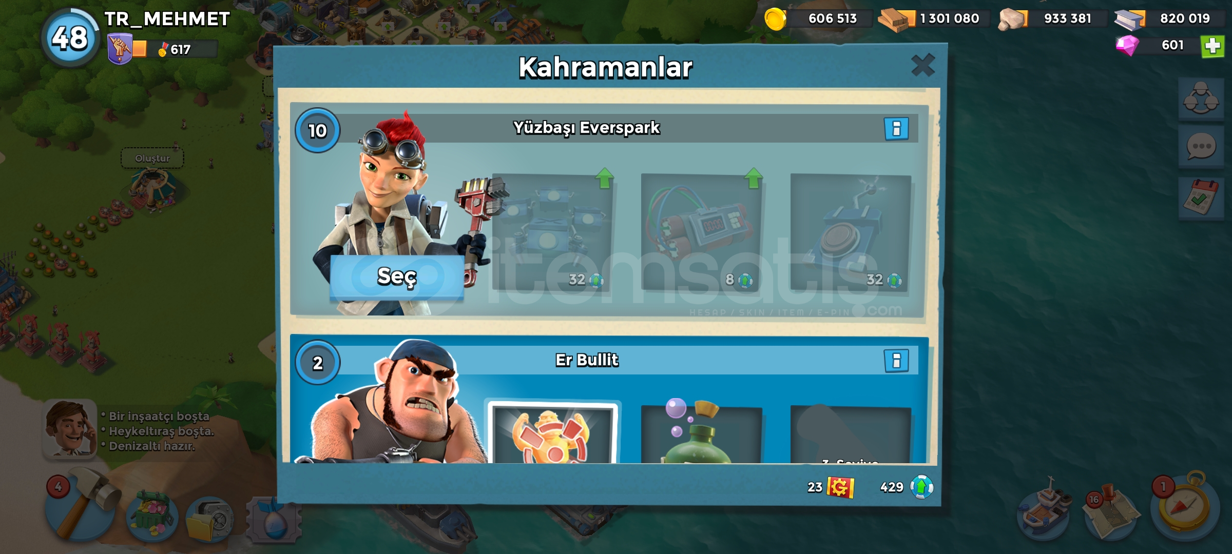 Hesapta 1000 lira değerinde elmas ve 131 adet toz bulunuyor biçok birlik ve yüksek seviyedeKahramanlar aynı şekilde MEŞALE,TANK,ZOOKA,Kahramanlar Çavuş brick,Dr kavan,everspar, er Bullit açık Proto birlik atölyesindede var5 adet hasar heykeli5 adet gabot heykeli1 adet kaynak heykeli varKarargah 19 seviye