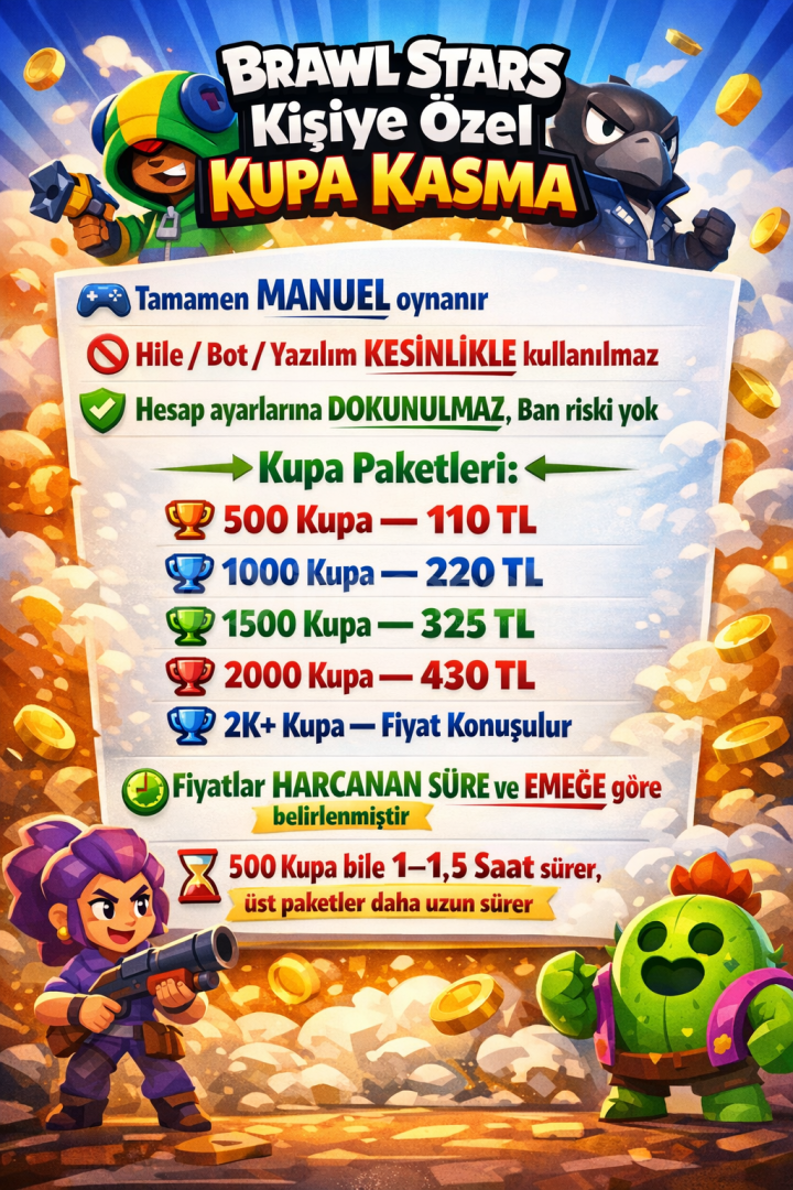 🔴 Brawl Stars Kişiye Özel Kupa Kasma🔵 Tamamen manuel oynanır🔴 yasaklı / bot / yazılım kesinlikle kullanılmaz🟢 Hesap ayarlarına ve oyun içi eşyalara dokunulmaz🔵 Ban riski yok, hesap güvenli🟢 Kupa Paketleri:🔴 500 kupa — 110 TL🔵 1000 kupa — 220 TL🟢 1500 kupa — 325 TL🔴 2000 kupa — 430 TL🔵 2K+ kupa — fiyat konuşulur🟢...