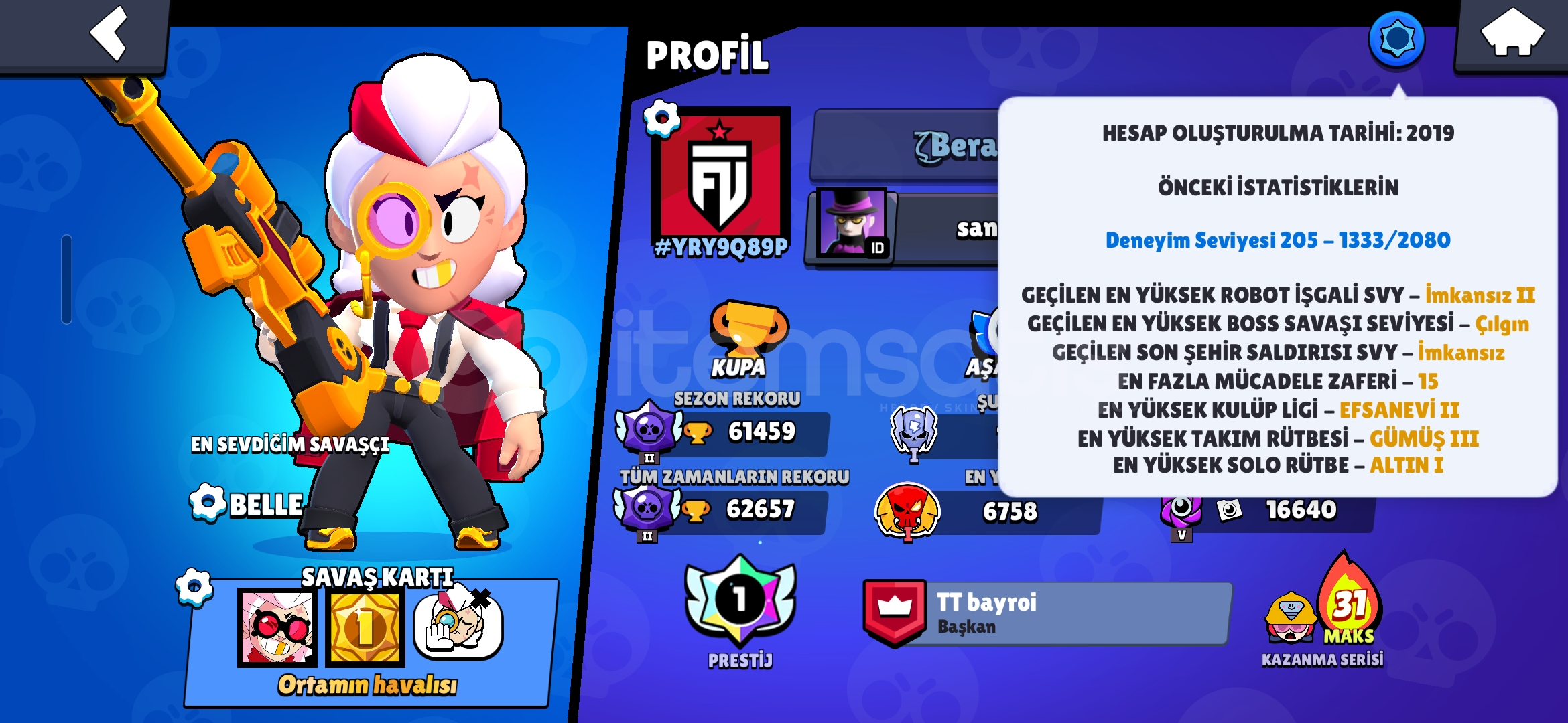 Hesab 2019 Hesabıdır içinde 6 tane eski bp kostümü vardır belle Türkiye 126cısı olmuştur 1 tane prestiji var koruma yok sohbet açıkdır maili sizin üzerinize yapıcam 1 hesab parasına 3 hesab almış olursunuz detaylar görsellerde vardır alıcısına şimdiden hayırlı olsun pazarlık az bişey olsada vardır