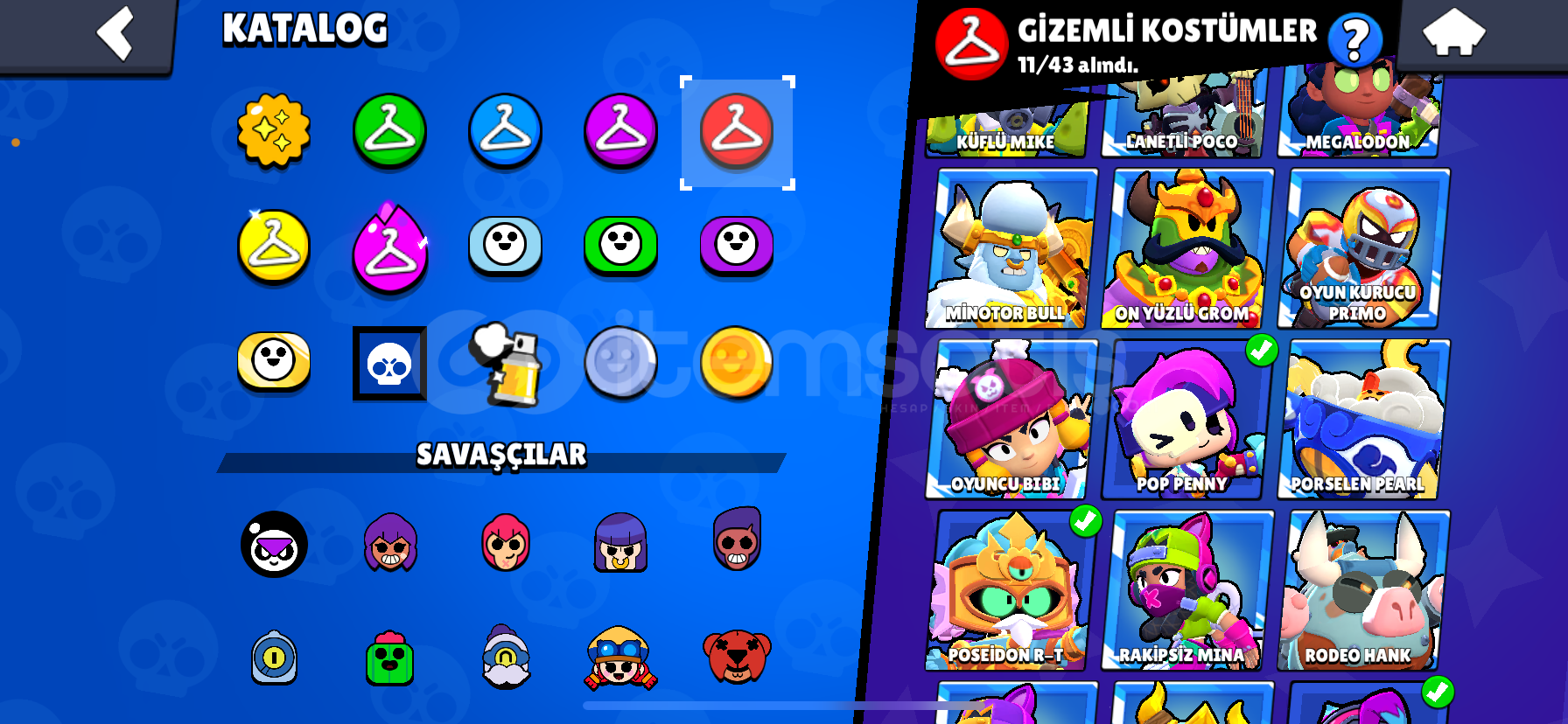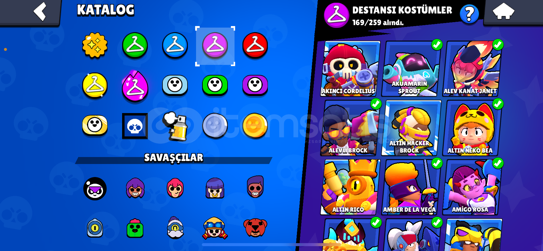 Hesap 100k, master 1 169 tane destansı skin var 100 tane süper ender 86 tane ender 10 gizemli 8 efsanevi skin var değerli kostümler vardır sorabilirsiniz