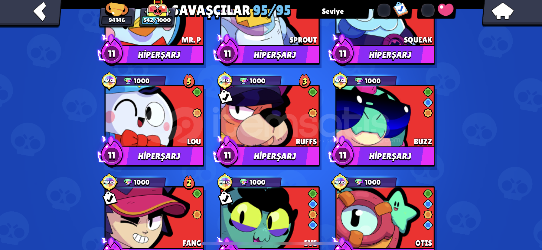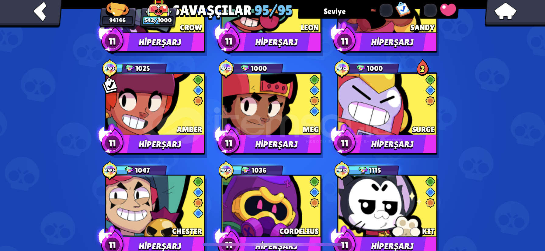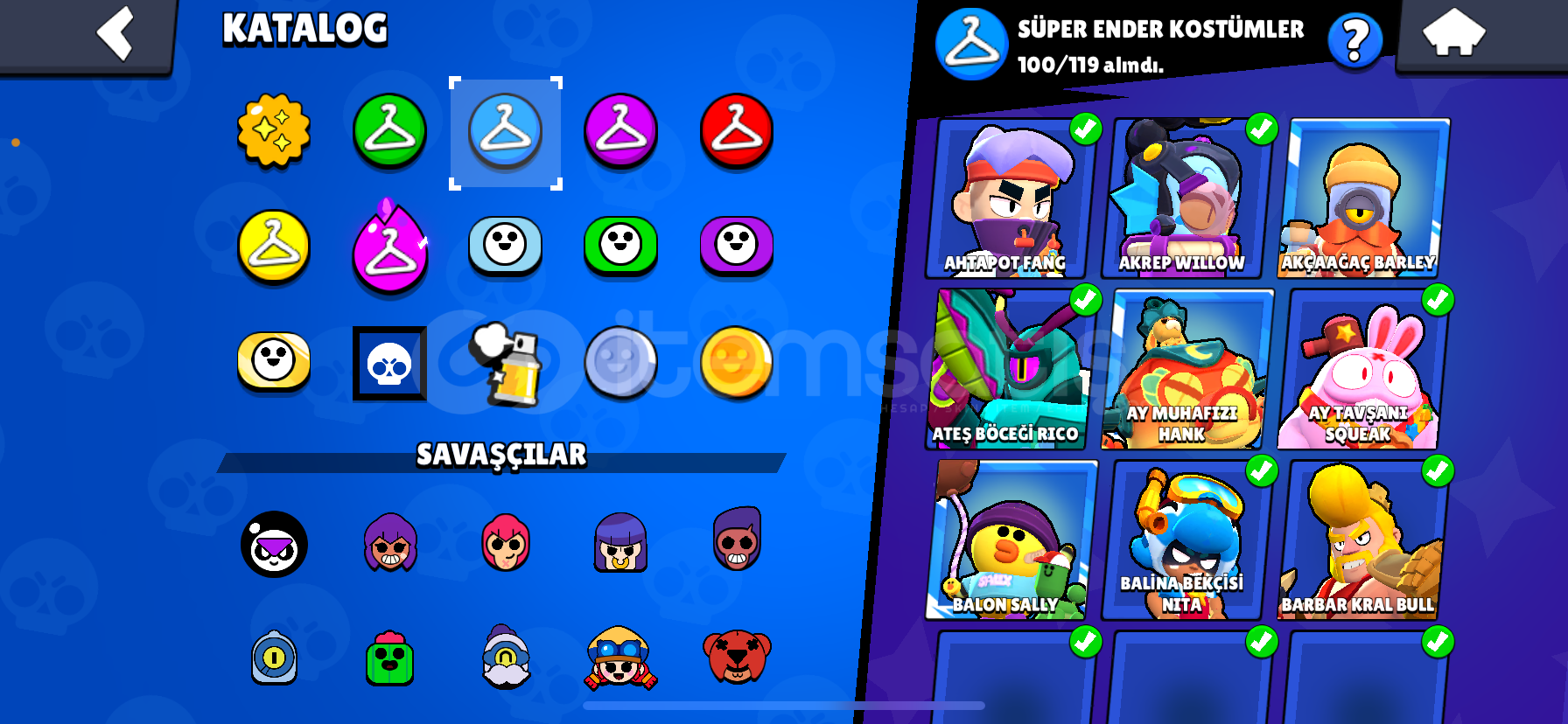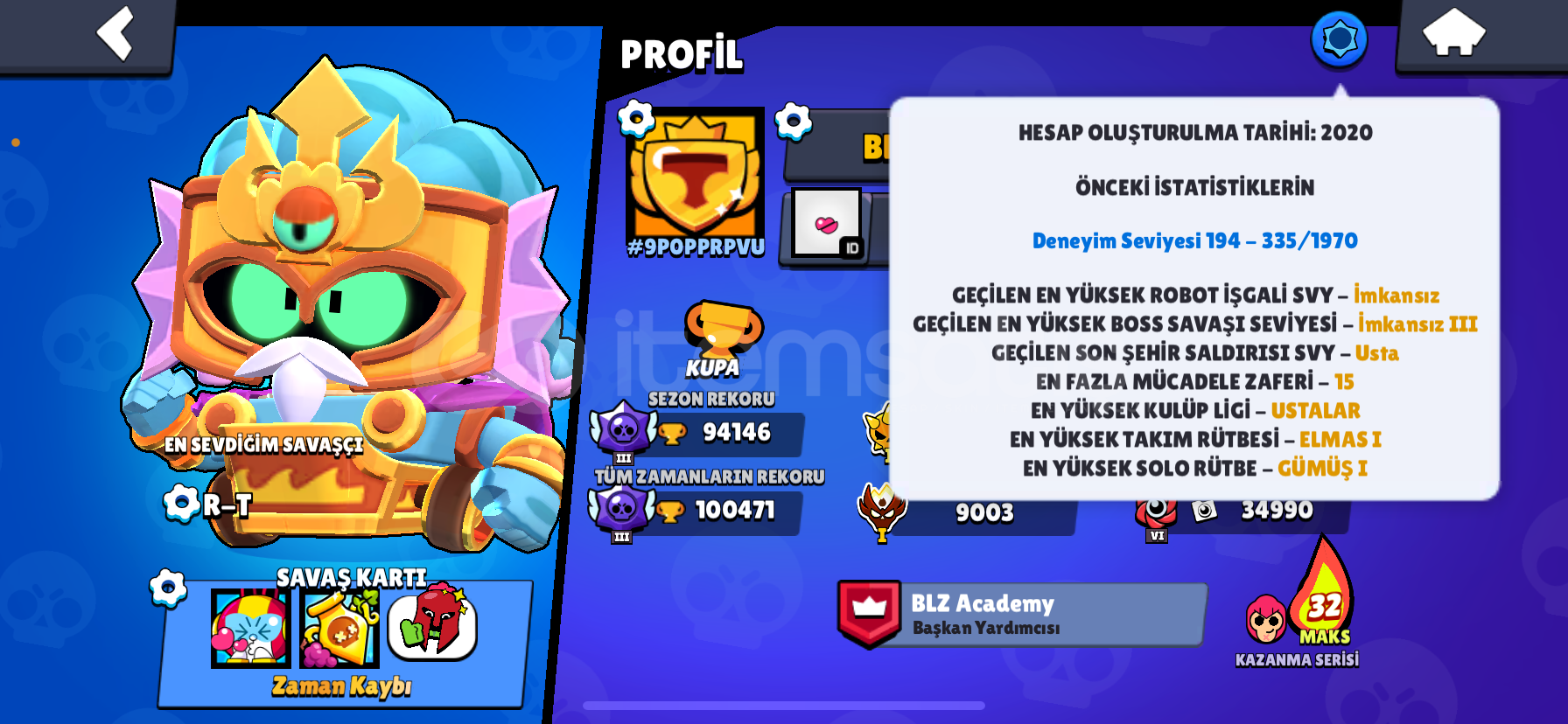 Merhaba hesap kafanıza yattıysa istediğiniz gibi yazabilirsiniz soru sormak için ciddi alıcıysanız şahsi ig hesabım : m1chape Hesap 100k, master 1 169 tane destansı skin var 100 tane süper ender 86 tane ender 10 gizemli 8 efsanevi skin var değerli kostümler vardır sorabilirsiniz 81 karakter maxtır 70 tane hiperi açıkmaxtır 6k para var daha ne istiyebilirsiniz meteor şöhreti 1 dir ve 5kredi top...