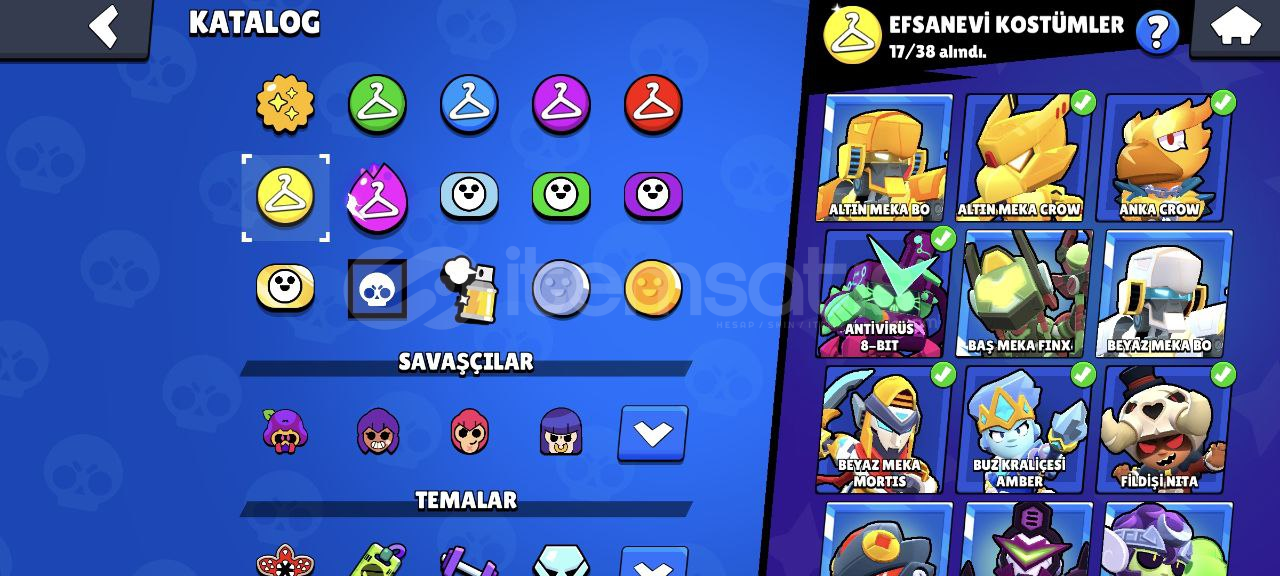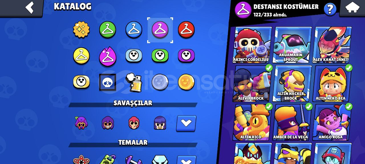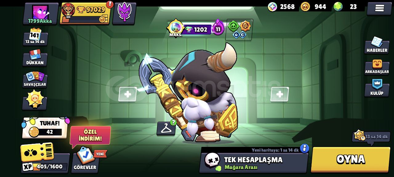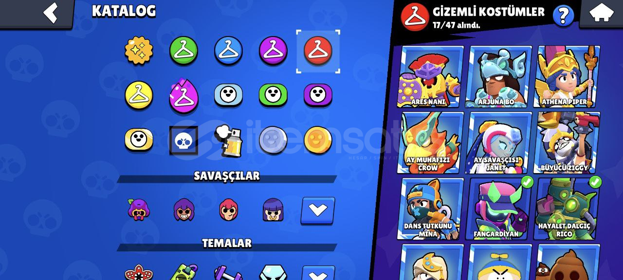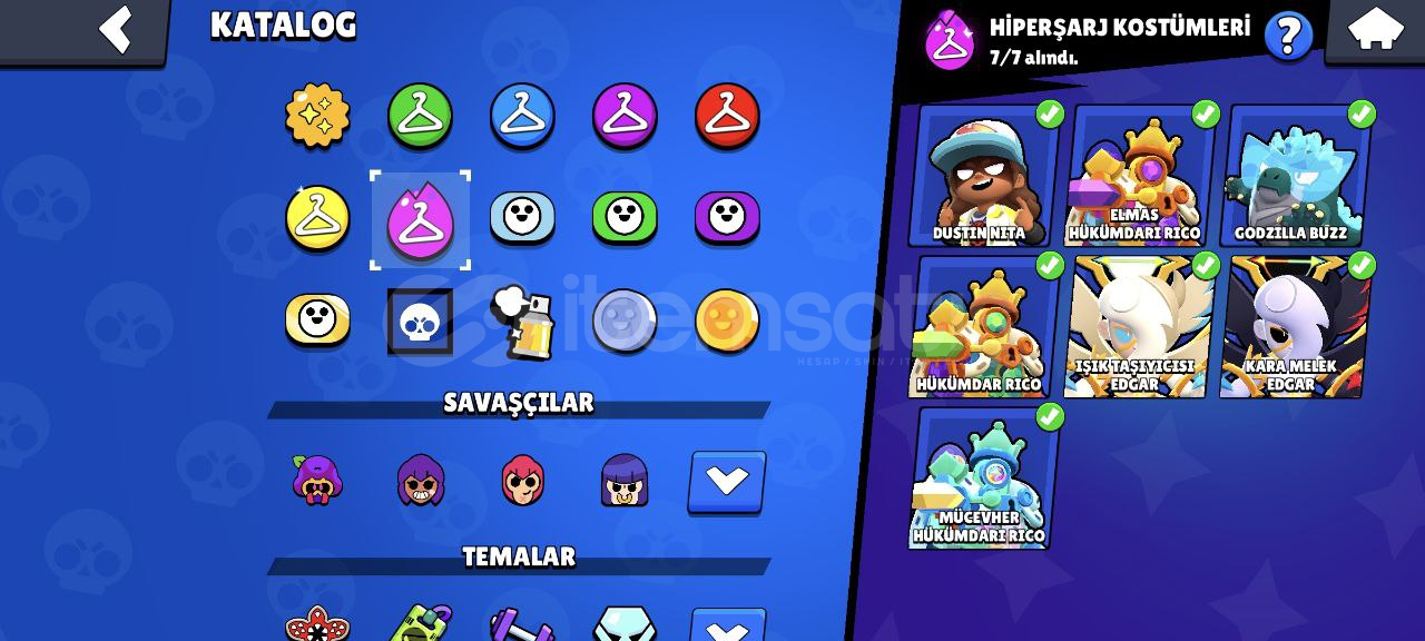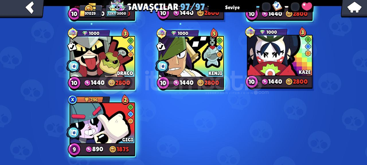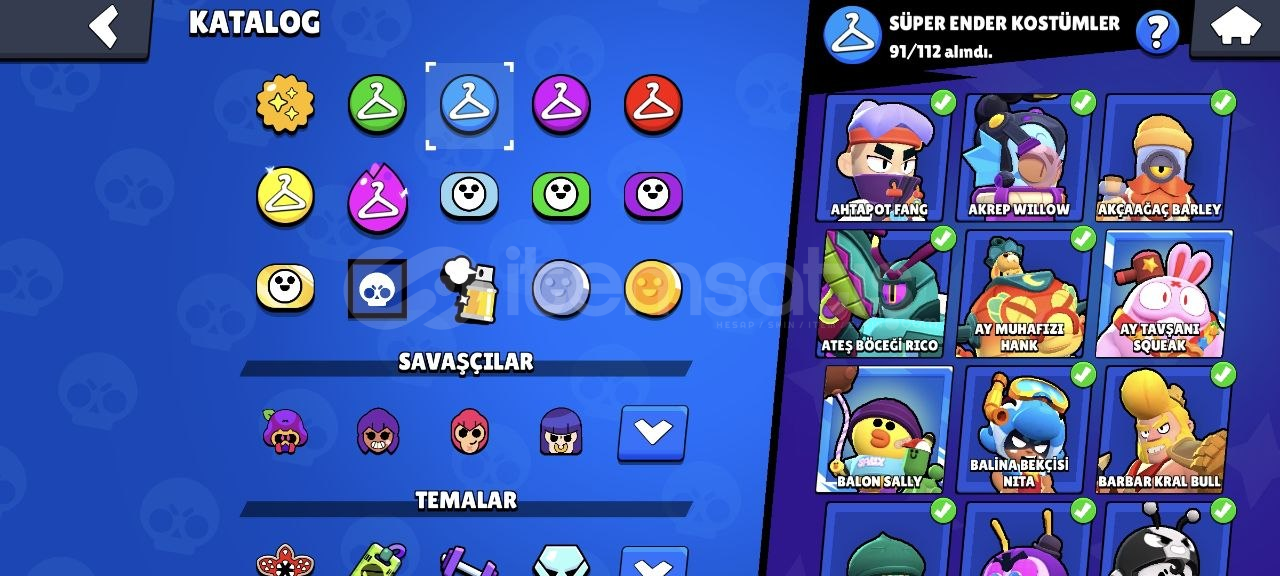 Hesap Özellikleri:97/97 Karakter, Hepsi +10 seviye 52'si 11 seviye!47 Hiperşarj (hepsi kullanılabilir durumda)148/194 Yıldız Gücü160/194 Aksesuar164 Eşya 92 Ender kostüm91 Süper ender kostüm122 Destansı kostüm17 Gizemli kostüm17 Efsanevi kostüm7 Hiperşarş kostümü (Kara Melek Edgar'da içlerinde var.) Kupa yolunda 70k dan sonraki hiçbir ödül toplanmadı. Kayıtla...