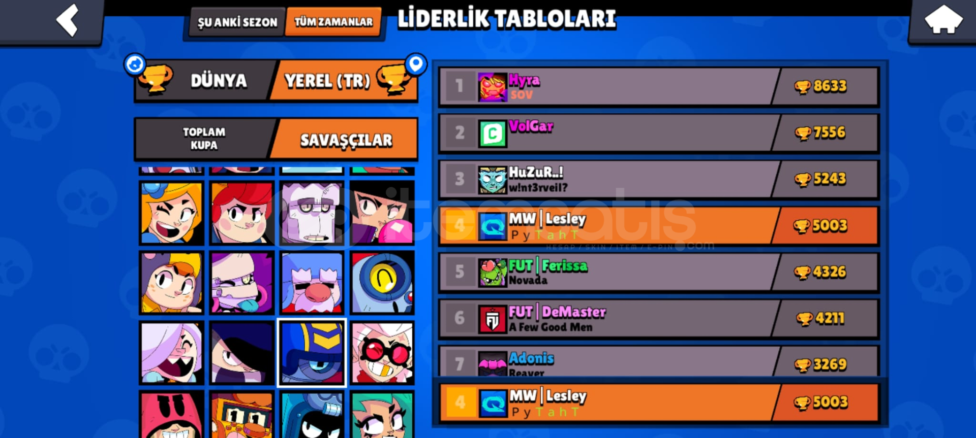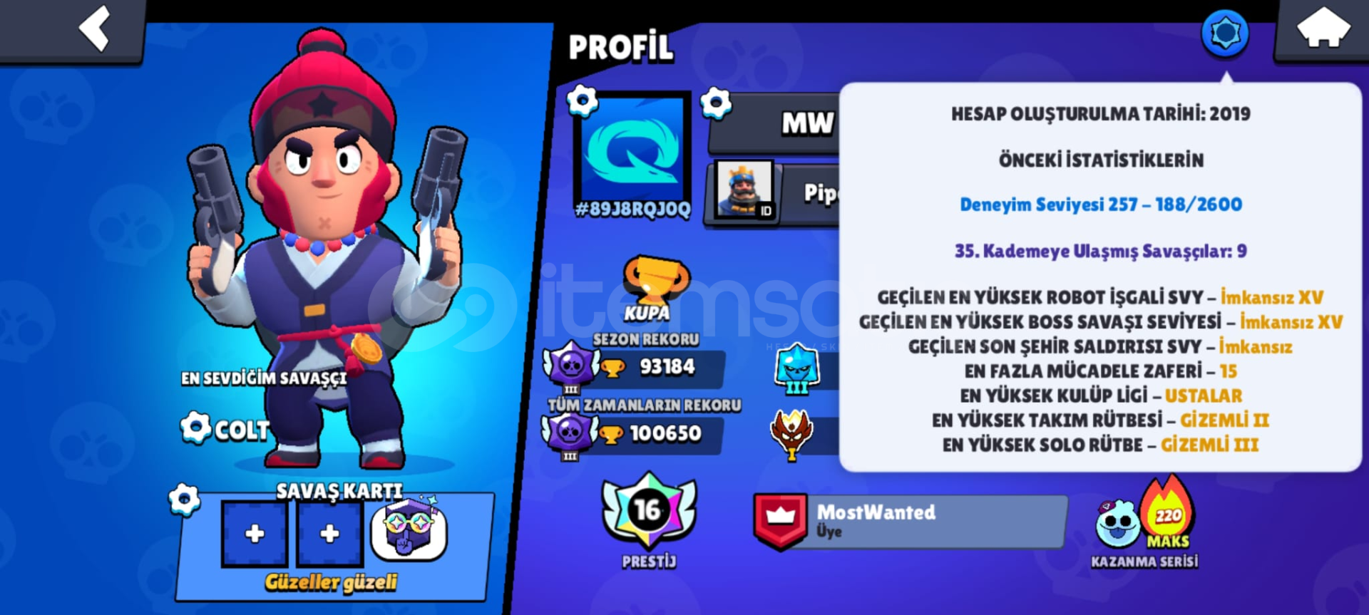 100k kupa 500+ kostüm Ful+Ful Nadir hesaptır9 Tane 35rank vardır10k eski sistemde aşamalı puanına ulaşmıştır45k3v3 21k Mücevher16 Tane Prestij 63k Kayıt Puanı VardırMeteor 3 şöhretine 80 kredi kalmıştırHesapta 5k Stu Yapılmıştır Tüm Zamanlar Türkiyede 4. sıradadırbirçok karakter 2k kupa yapılmıştırHesapta Nadir Cok fazla ...