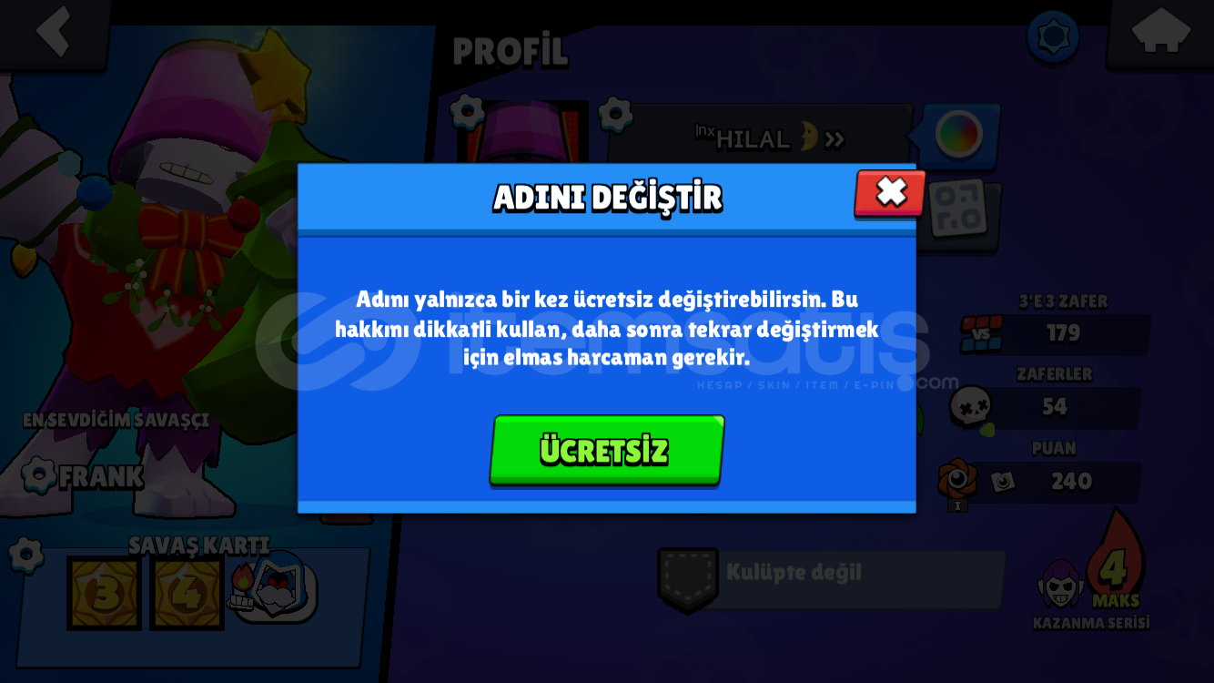 Hesapta İsim Değişim Hakkı Vardır.Hesapta Birkaç Güzel Kostüm Mevcuttur.2021 De Açılmış Hesaptır Başlangıç İçin Uygun Hesaptır.Aldığınız An Direk Teslim Edilecektir.