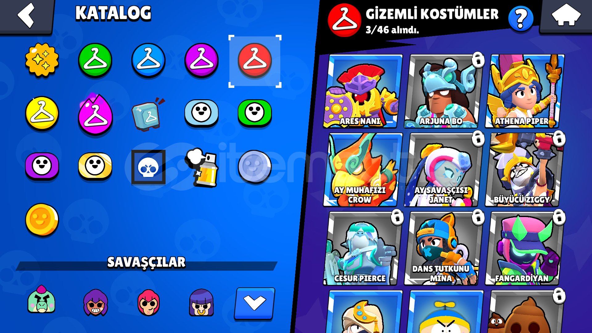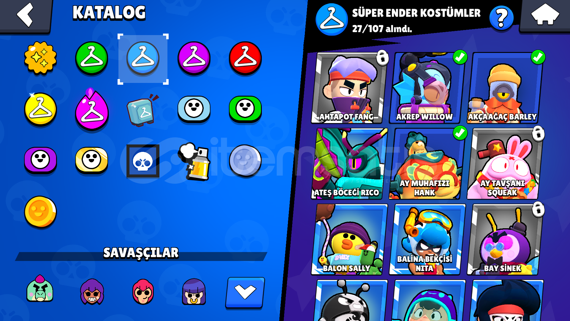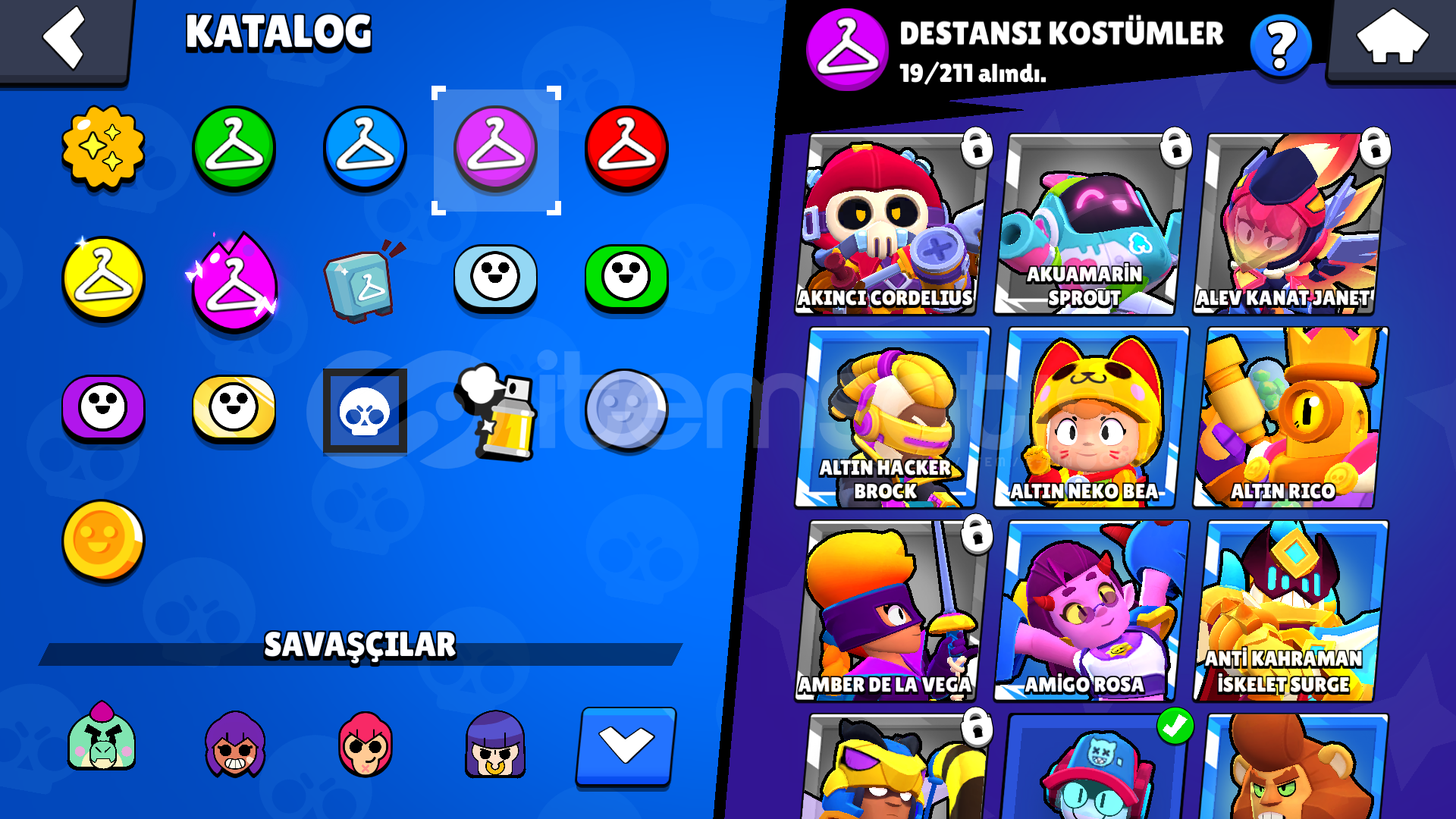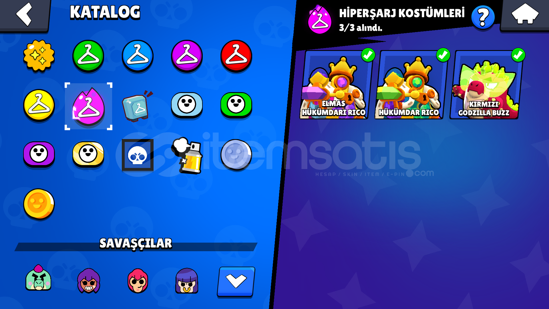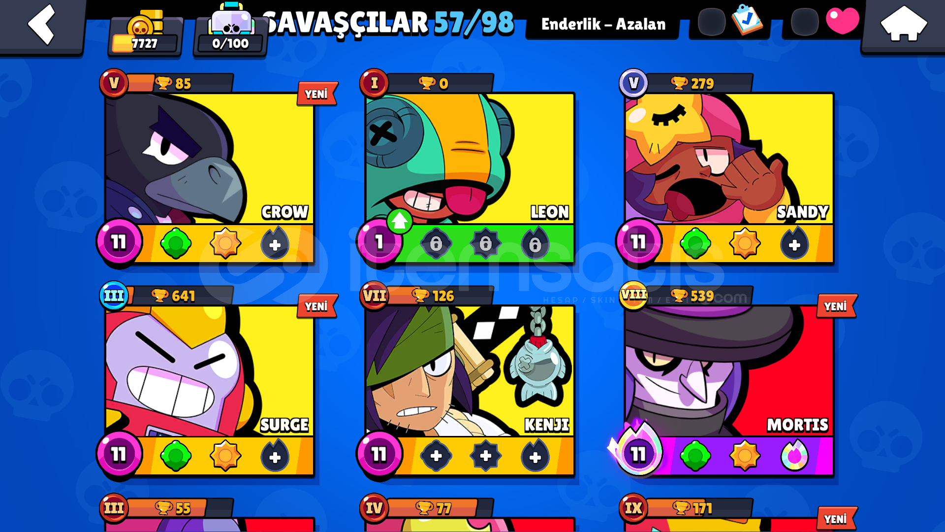 57 KARAKTER5 EFSANEVİ12 GİZEMLİ21 DESTANSI13 TANE 11 SEVİYE KARAKTER44 ENDER SKİN27 SÜPER ENDER SKİN19 DESTANSI SKİN3 GİZEMLİ SKİN3 EFSANEVİ SKİN(KOTU KRALICE PAM,SURGE ISIK YILI,ROBO MIKE )3 HİPERSARJ KOSTUMU (KIRMIZI GODZILLA BUZZ,ELMAS HUKUMDARI RICO,HUKUMDAR RICO)(10 GORSEL SINIRI OLDUGU ICIN GORSELLER BIRLESTIRILMISTIR )TANRILAR CANAVARLARA KARSI BRAWL PASSI ALINMISTIRHESAP TESLIM EDILIRKEN ALICININ MAIL ADRESI ILE DEGIST...
