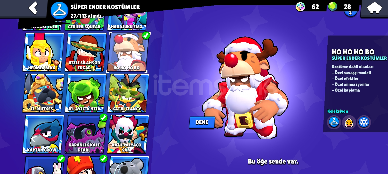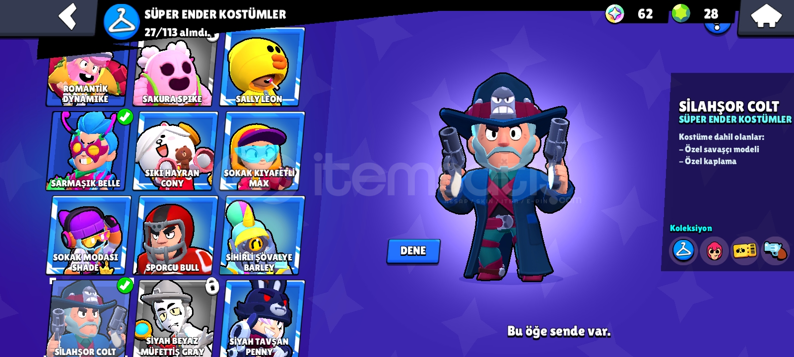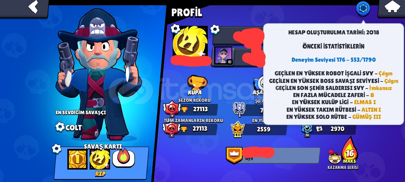 Hesapta Brawl Pass Açıktır Lakin Fullenmemiştir. Hesap başka maile aktarılacak olup, bağlı olduğu mail verilmeyecektir. Eski Nadir Kostümler Bulunmaktadır. Hesap ismi ve ID si art niyetli kişiler olabilme ihtimali yüzünden sansürlenmiştir.