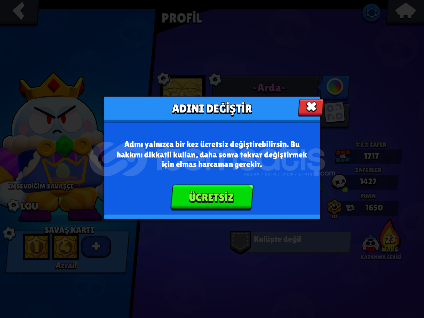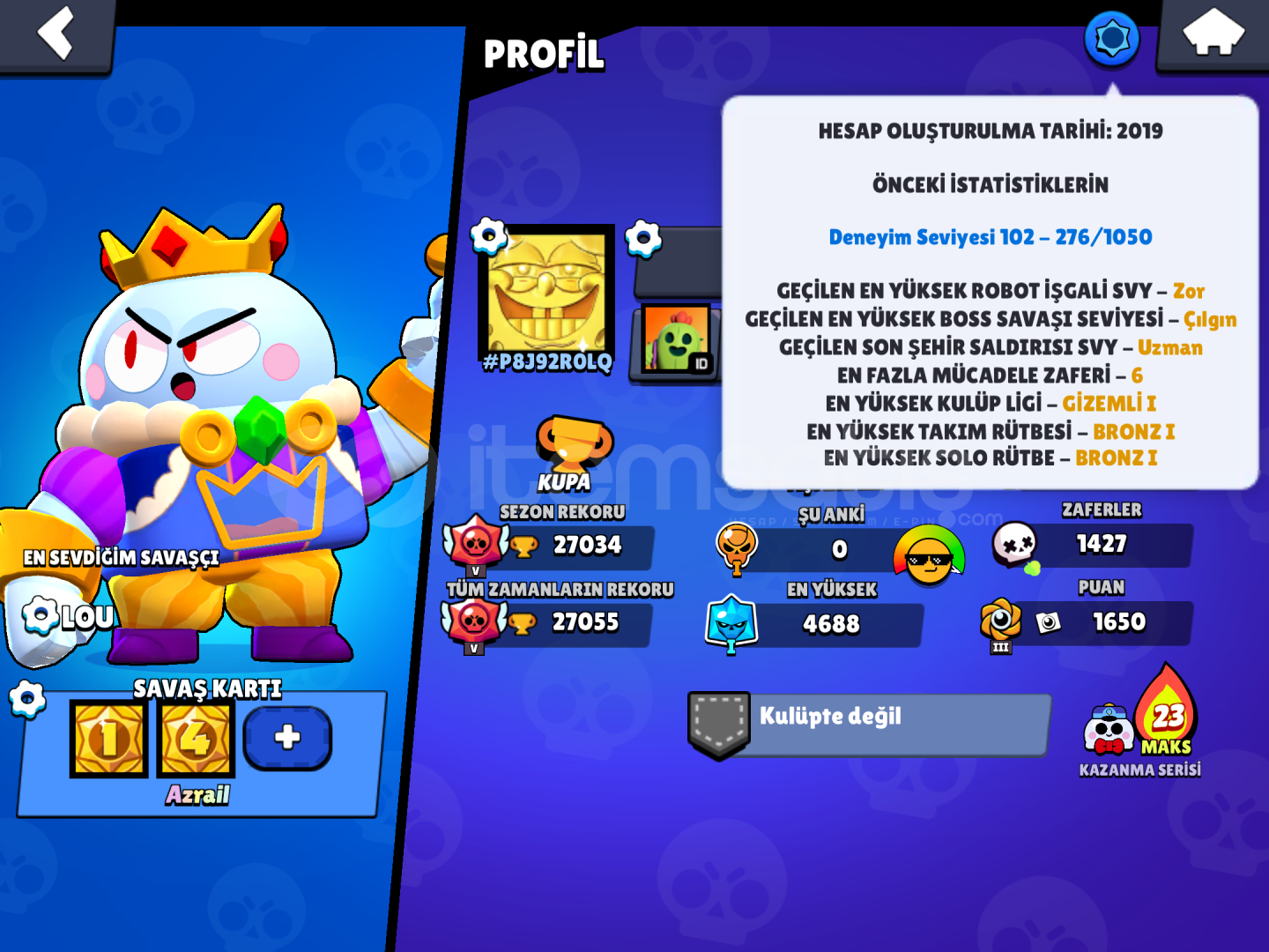6 efsanevili eski hesap 2 veya 3 sezon brawlpass açılmış fullenmiştir nerdeyse her karakterde skin vardır