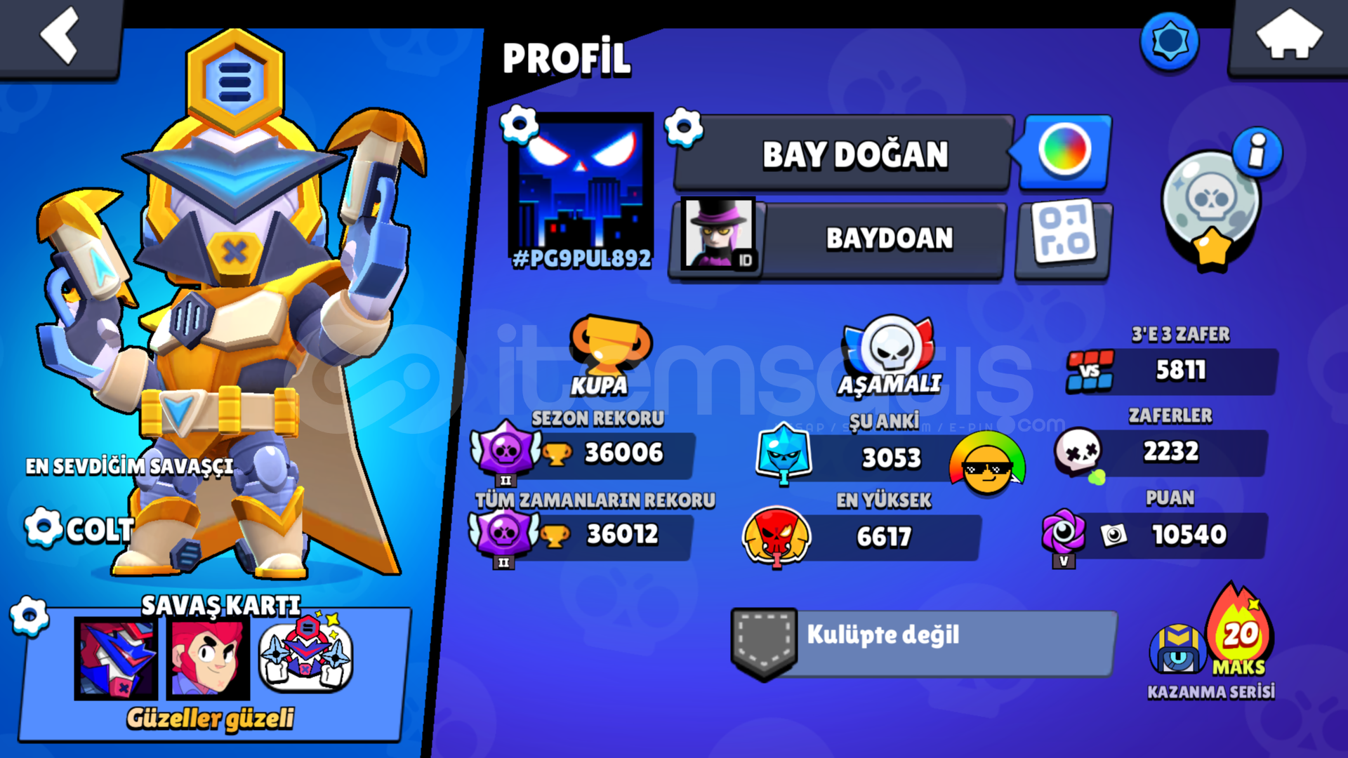 Hesap 36k kupadır278 taş var hesabın içindeHesap mail değişimi yapılacakClash Royale hesabı bulunmaktadır 7700 kupa evrim vbHesap Ninja ash sezonu brawl pass açılmıştır değerli kostümler bulunmaktadırhesabı alan kişiye şimdiden hayırlı olsun