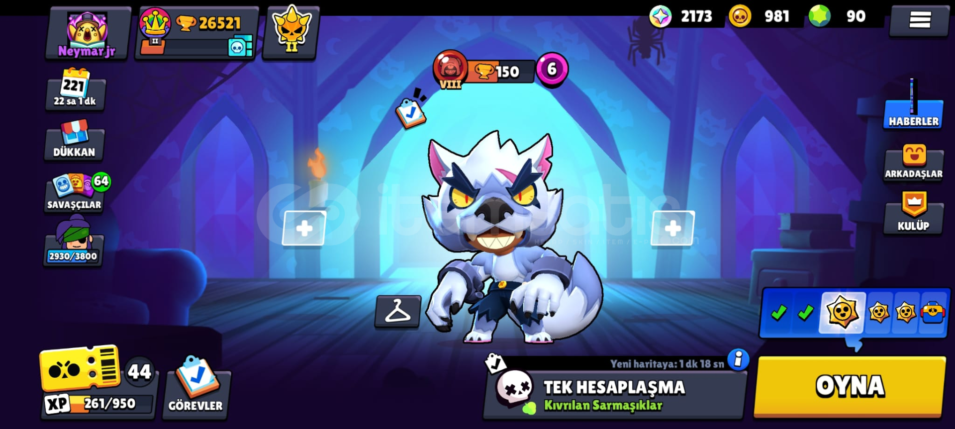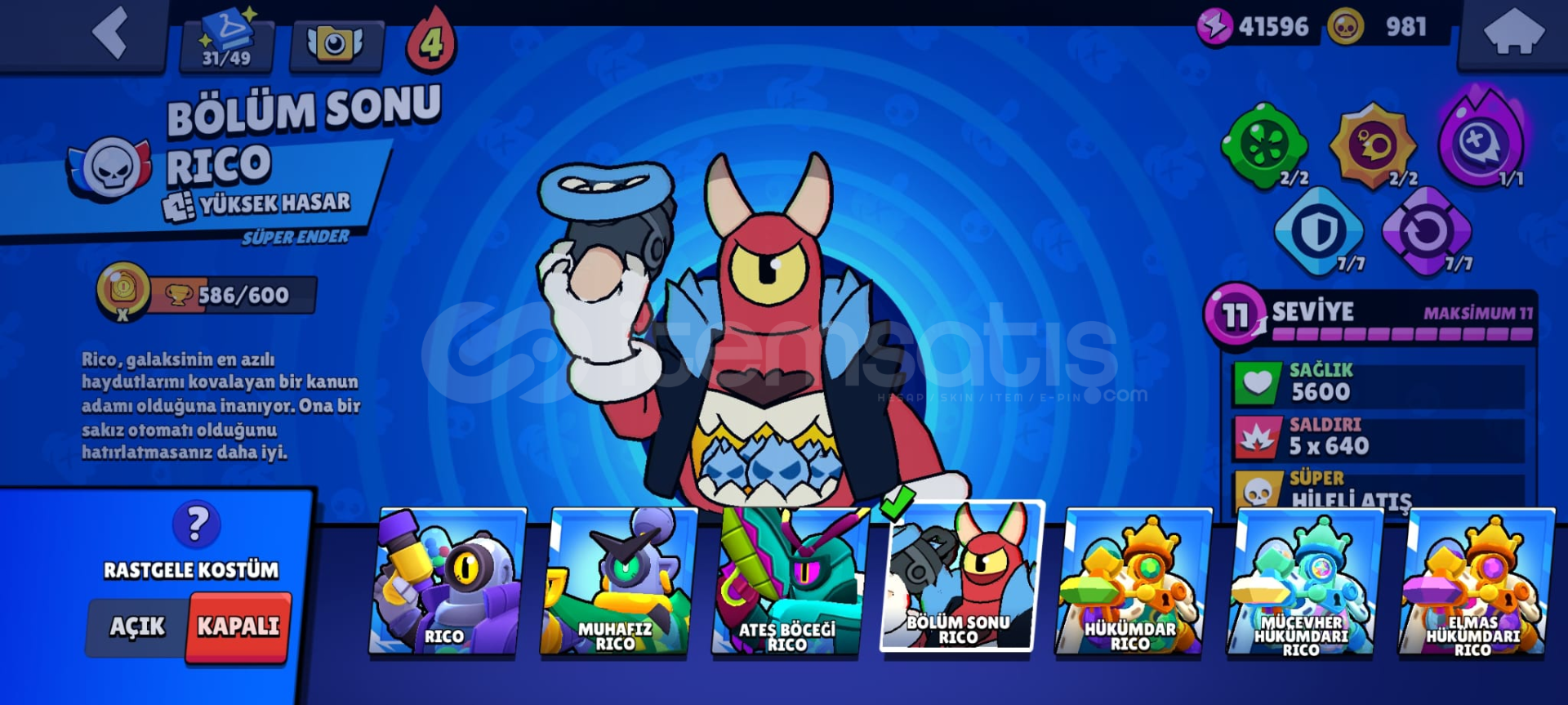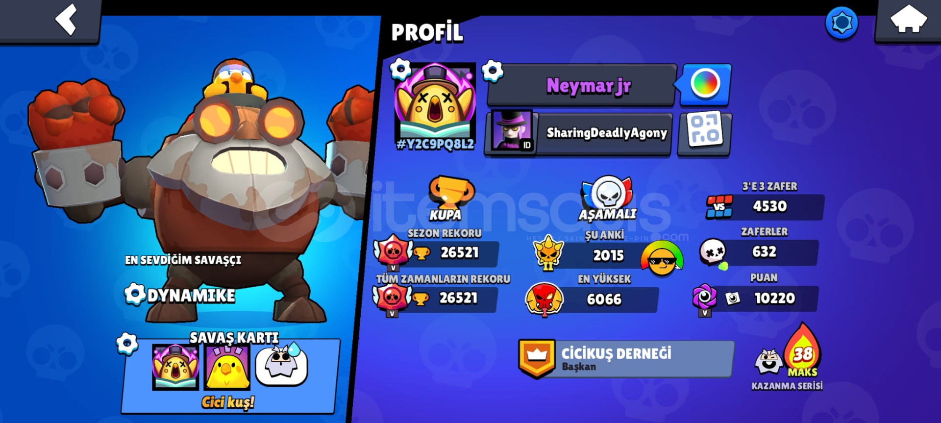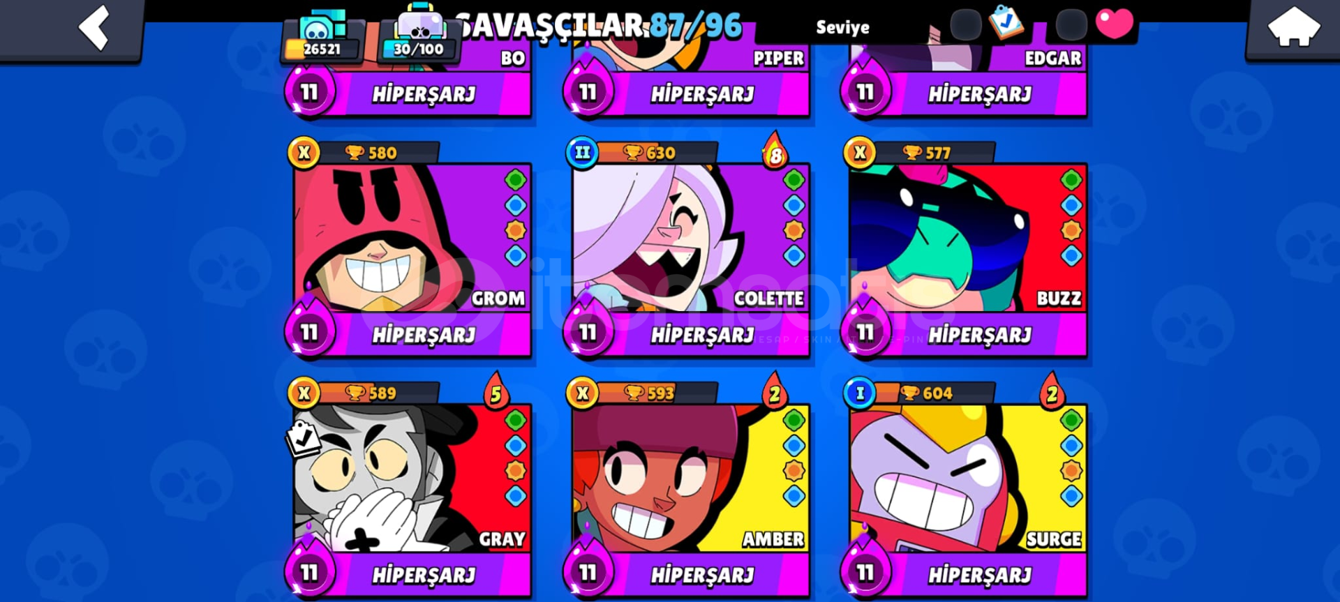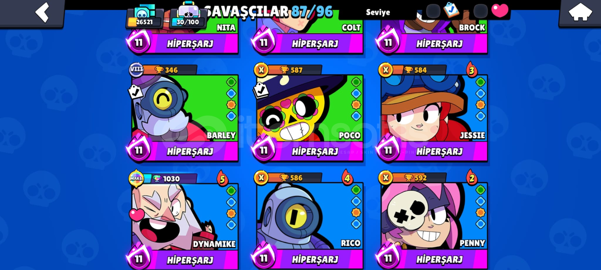Hesap özellikleri:Hesap 26.000 Kupadadır 269 değerli skin bulunmakta18 Tane hiperşarjlı karakter bulunmakta 87 Karakteri var5 Adet BrawlPass açılmıştırBütün Dynamike skinleri vardır⭐Zeus brock⭐⭐Rodeo Hang⭐⭐Horus Bo⭐⭐Kaplumbağa Gale⭐⭐Cobra Lola⭐⭐Müfettiş Colette⭐⭐Şovalye Jessie⭐⭐Muhafız Rico⭐ ...