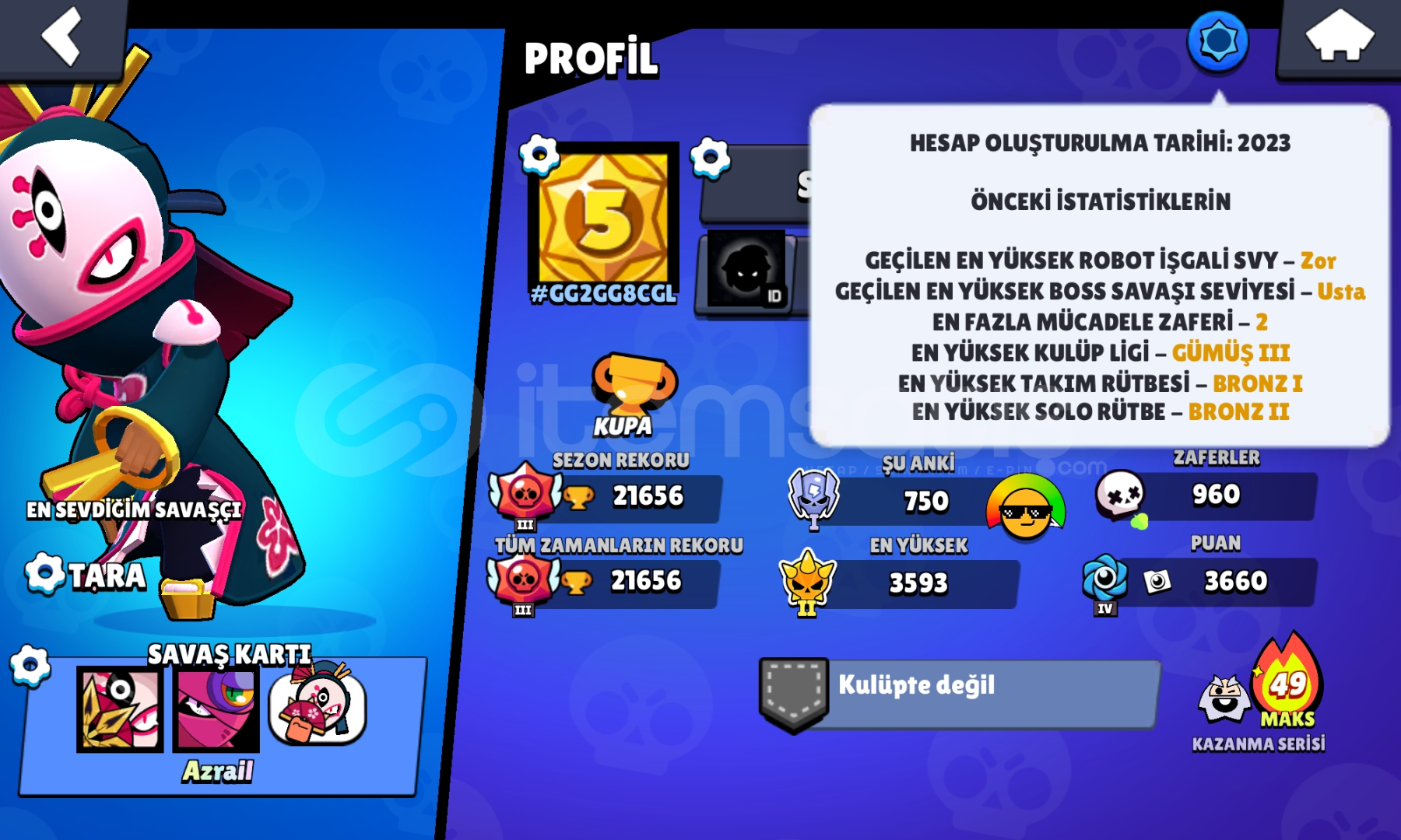 ⚡ Efsane Brawl Stars Hesabı Satılık 💥⭐.🎯 Hesap Bilgileri:🏆 21656 Kupa📅 2023 Hesabı✏️ Ücretsiz isim değiştirme hakkı mevcut.👥 73 Karakter:➡️ 7 Efsanevi➡️ 18 Gizemli➡️ 29 Destansı➡️ 10 Süper Ender➡️ 8 Ender➡️ 1 Başlangıç karakteri.🎨 188 Skin:🎭 71 Ender🔥 46 S&uu...