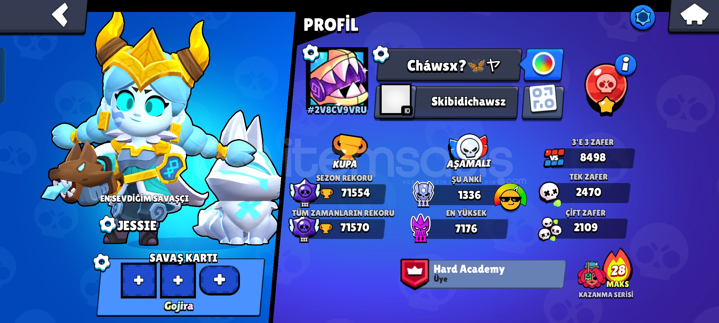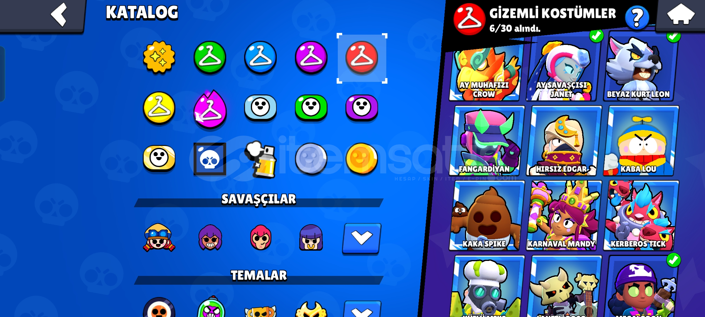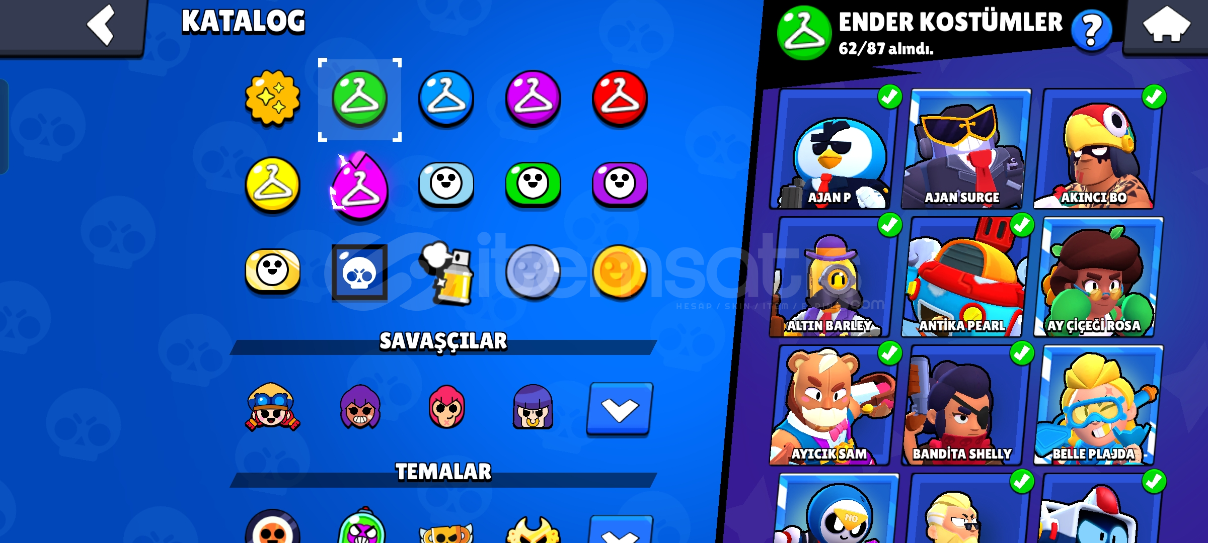 Hesapta 3 Brawl Pass+ vardır.72K Kupadır.2 Eski 30 Rank vardır.400₺ Satılan Fang Skini.400₺ Matcherino Pini.30 Tane Max Rank.230+ Skin.Eski Belle Sezonu Brawl Pass.Mars Şöhret.DETAYLI VİDEO ATILIR.PAZARLIK VARDIR.