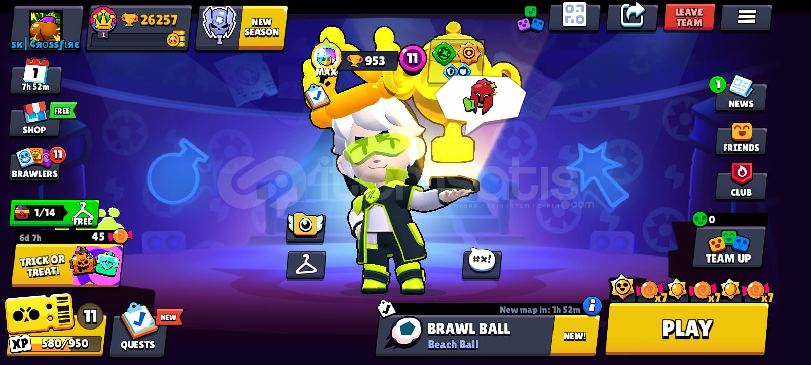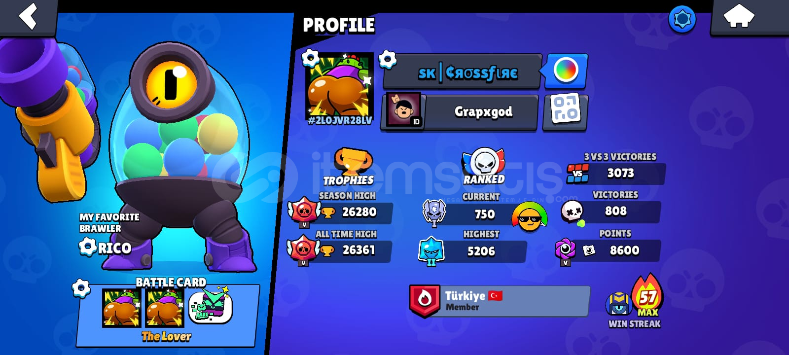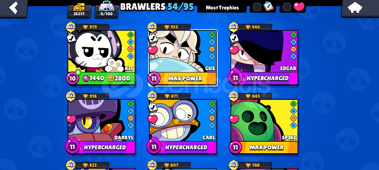 MACHERİNO PİNİ VAR7 tane efsanevi skin var3 gizemli skin var52 destansı skin var52 süper rare skin var48 rare skin var2 tane hypercharge skin var4 BRAWL PASS + 1 TANE NORMAL PASS ALINMIŞTIR9 tane karakter max rank