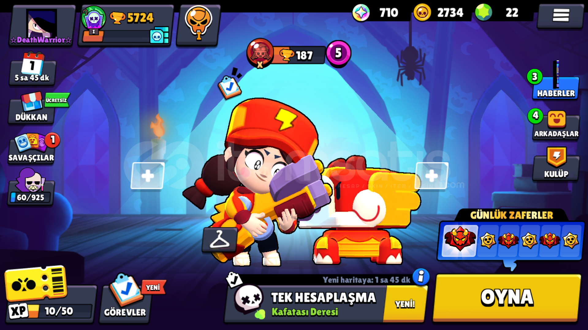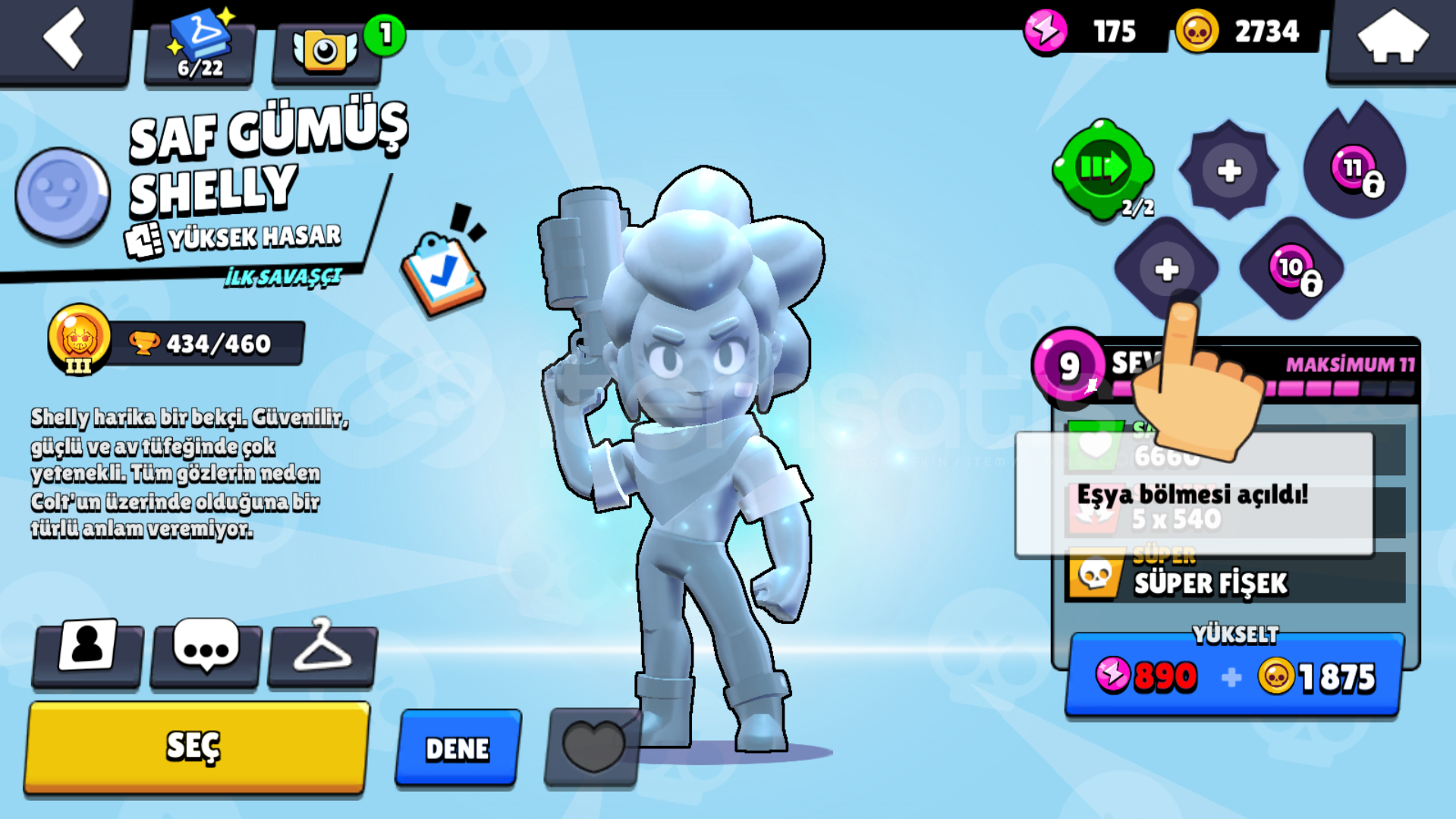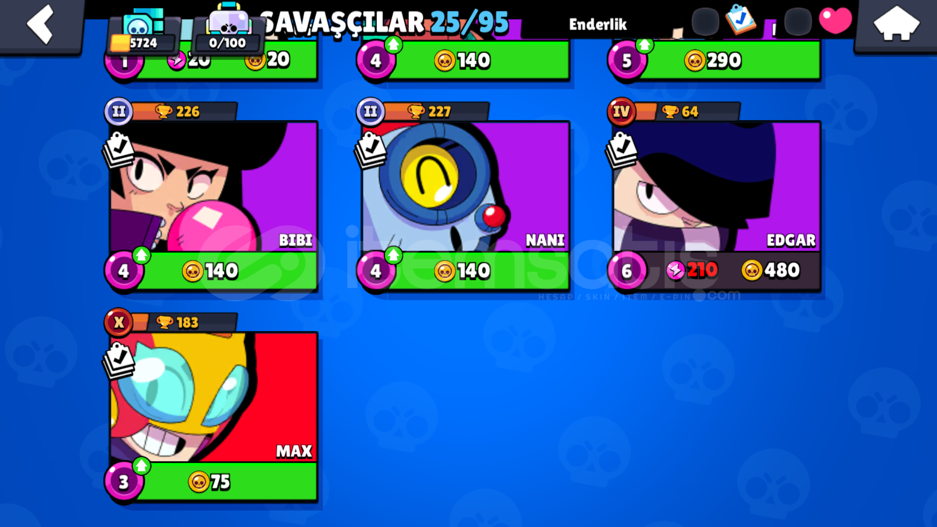 Hesapta toplam 5725 kupa25 karakter ve 11 skin + Saf Gümüş Shelly bulunuyor.