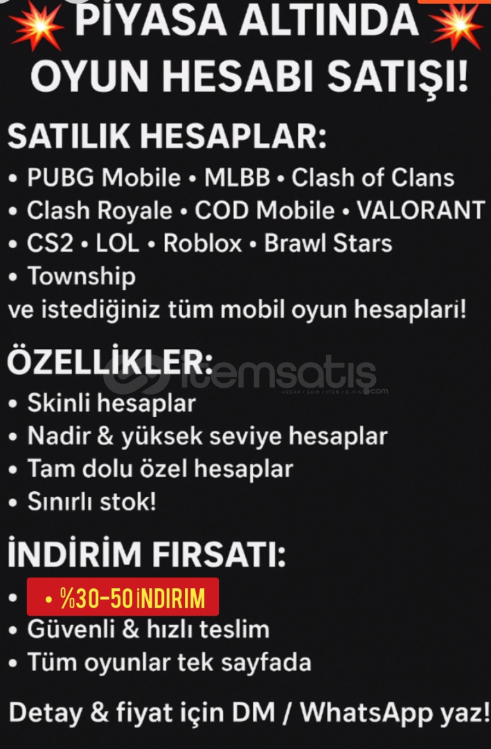 Mobil oyun tutkunlarına özel piyasa değerinin oldukça altında birçok kaliteli hesap satıştadır. PUBG, Mobile Legends, Clash of Clans, Clash Royale ve Call of Duty Mobile gibi popüler oyunlarda; skinli, yüksek seviye, nadir içerikli, düzenli oynanmış ve tamamen hazır hesaplar arasından dilediğinizi seçebilirsiniz.