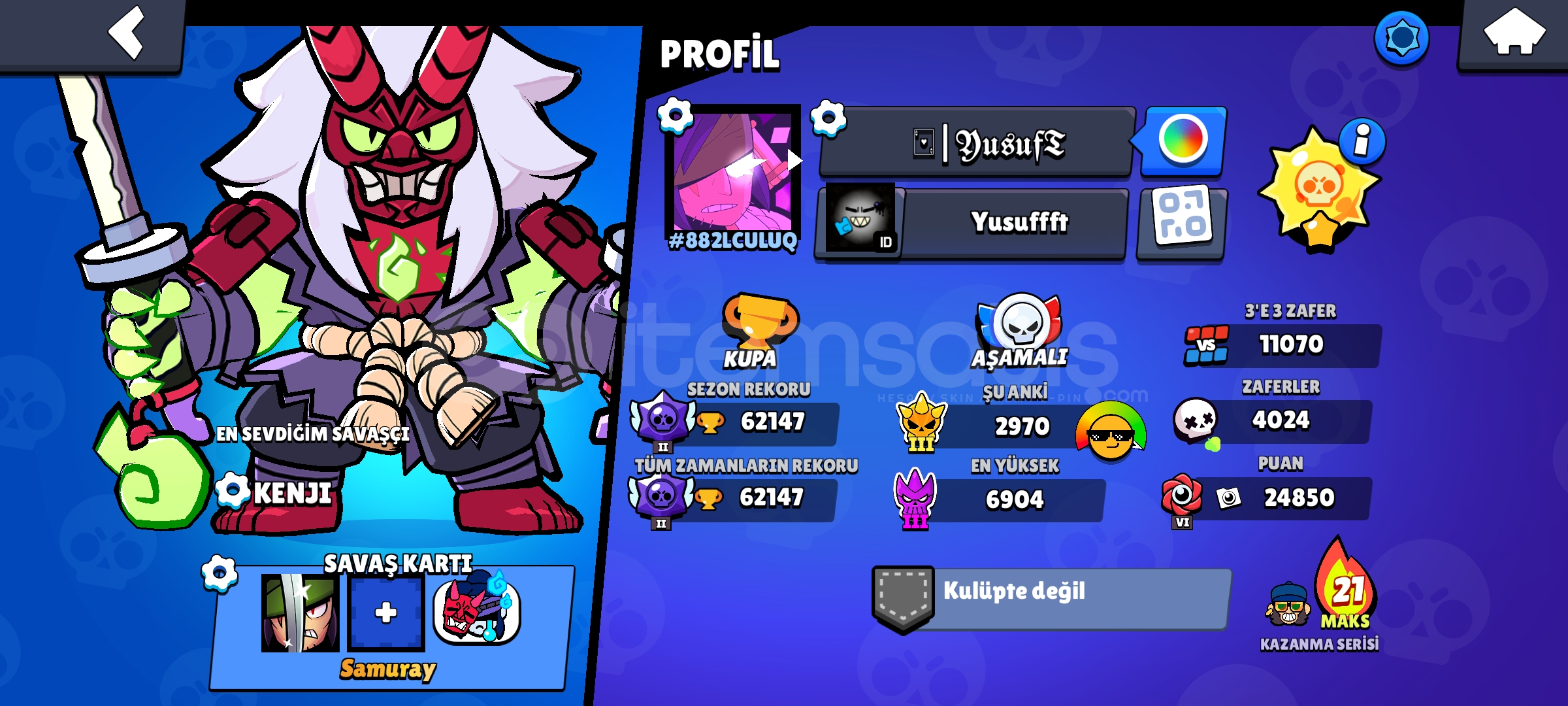 ⚡ PREMIUM BRAWL STARS HESABI SATILIK!Aktif kullanılmasa bile tamamen dolu, koleksiyon değeri çok yüksek bir hesap.Toplam 97/97 karakter + 62.000 kupa + PRO PASS aktif + nadir kostümlerAlıcıya hesap mail + şifre ile güvenli şekilde devredilecektir.🔰 TEMEL BİLGİLER 🏆 Toplam Kupa: 62.000🧍‍♂️ Karakter Sayısı: 97/97 🎫 Pro Pass: Açık – 68. aşama&...