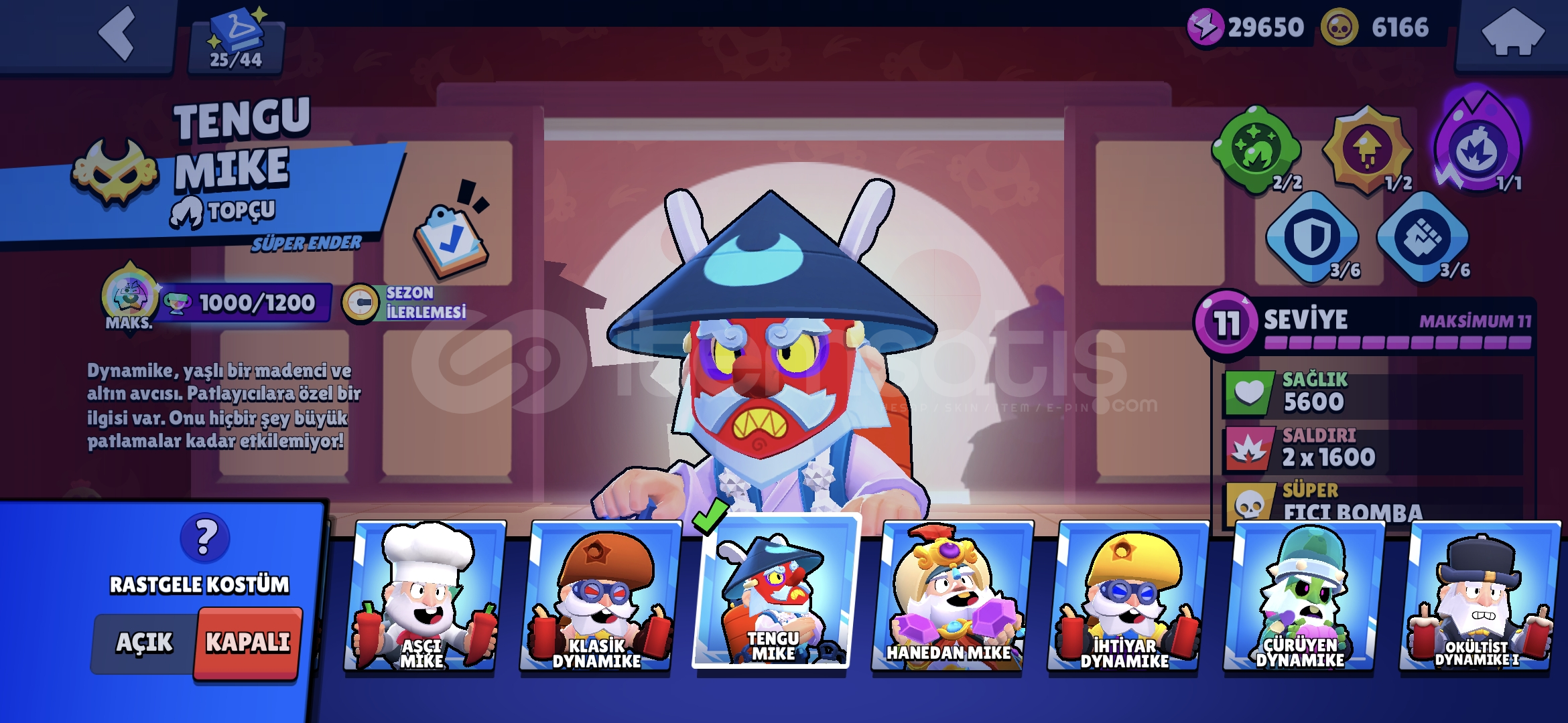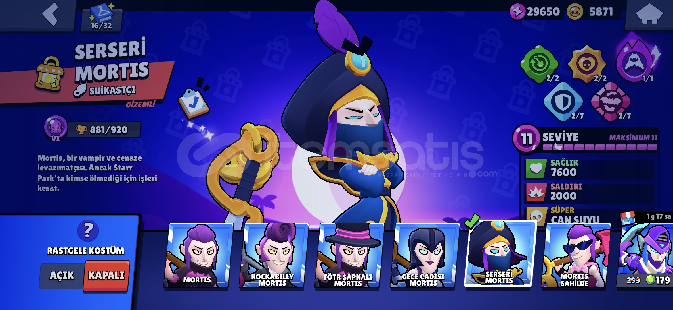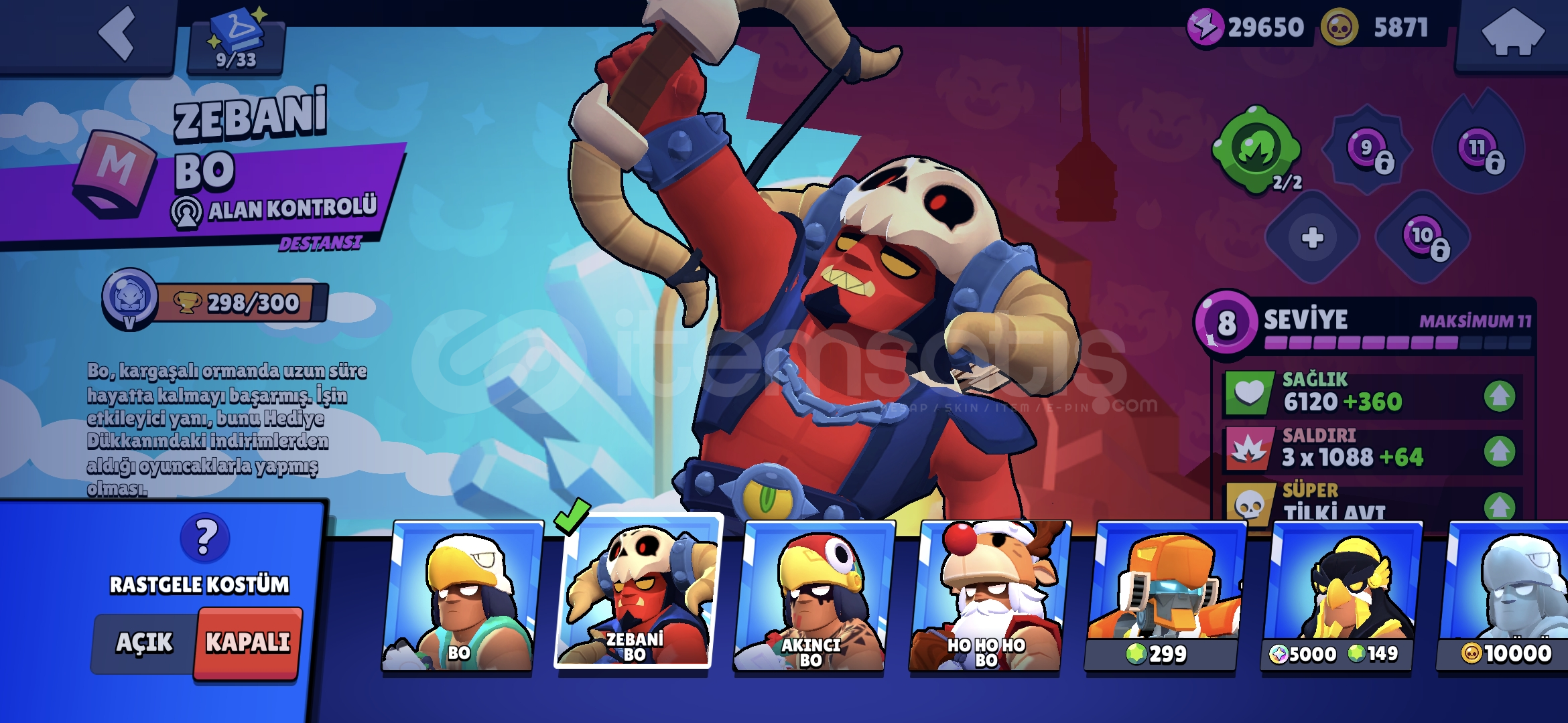 Nadir değerli skinler mevcuttur 77 karakterdir 10 Efsanevi 20 Gizemli 28 Destansı nerdeyse her karakterdede skin vardır koyamadığım birkaç tane daha değerli skin var. (Pazarlık yapılır) 60 tl ye brawl pass teklifide mevcuttur isim değiştirmek için taşı hazırdır hayday hesabıda vardır alana hayırlı olsun
