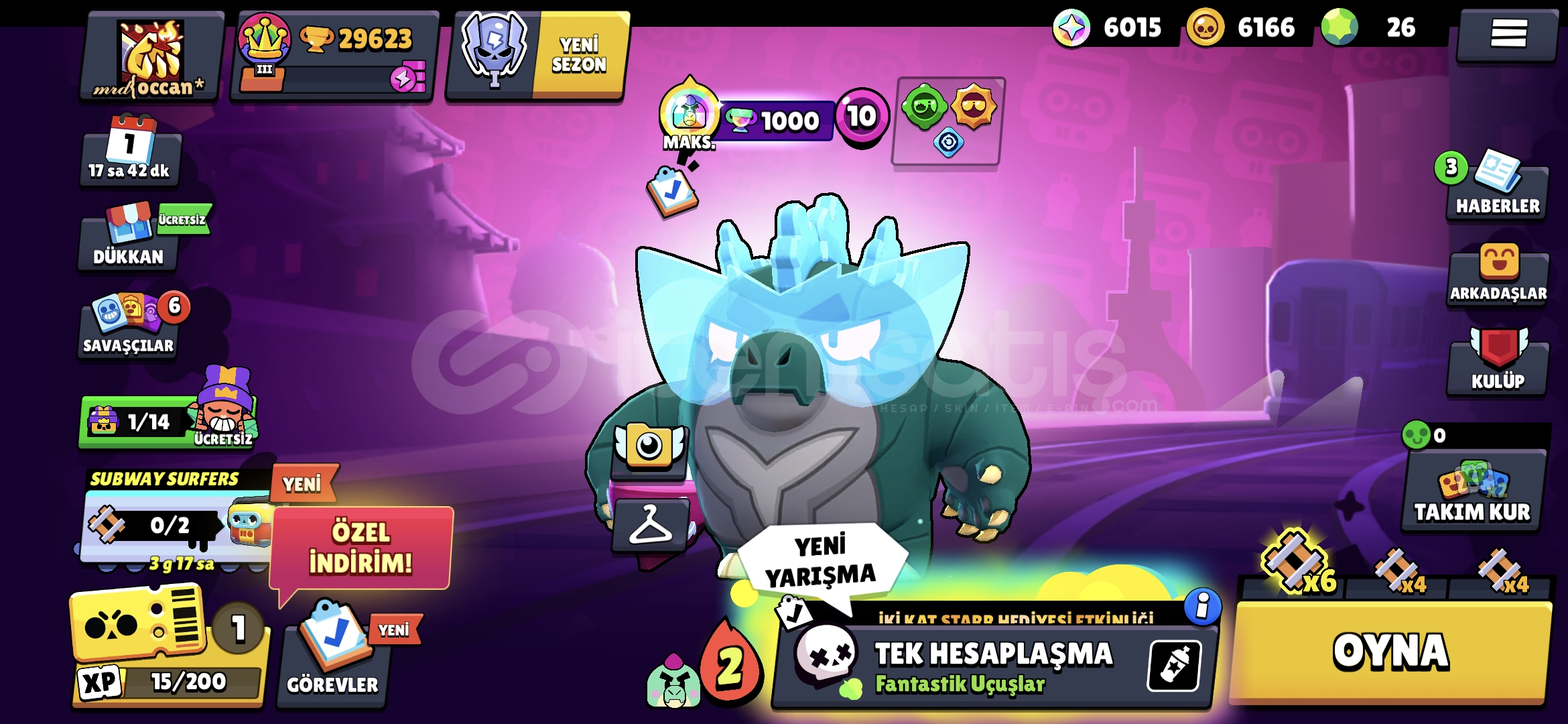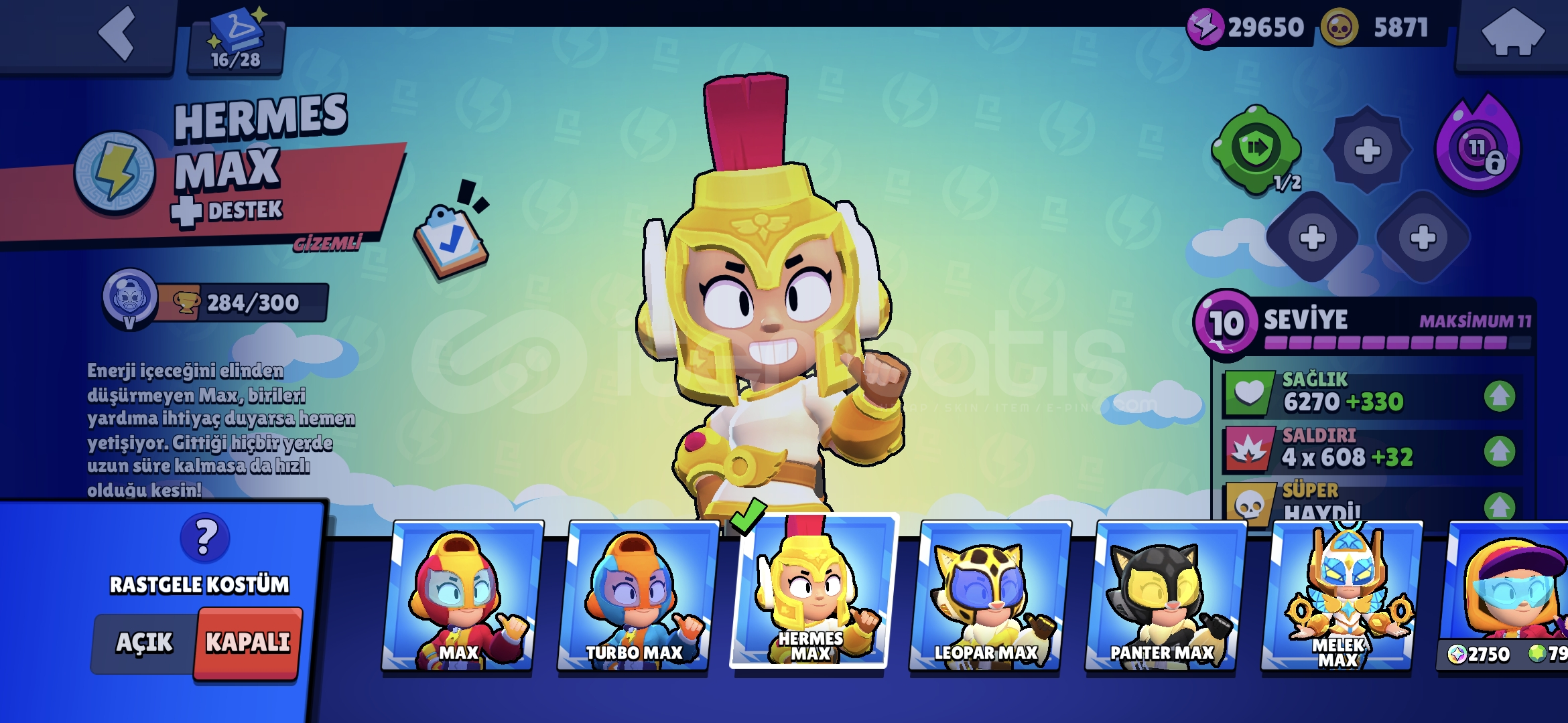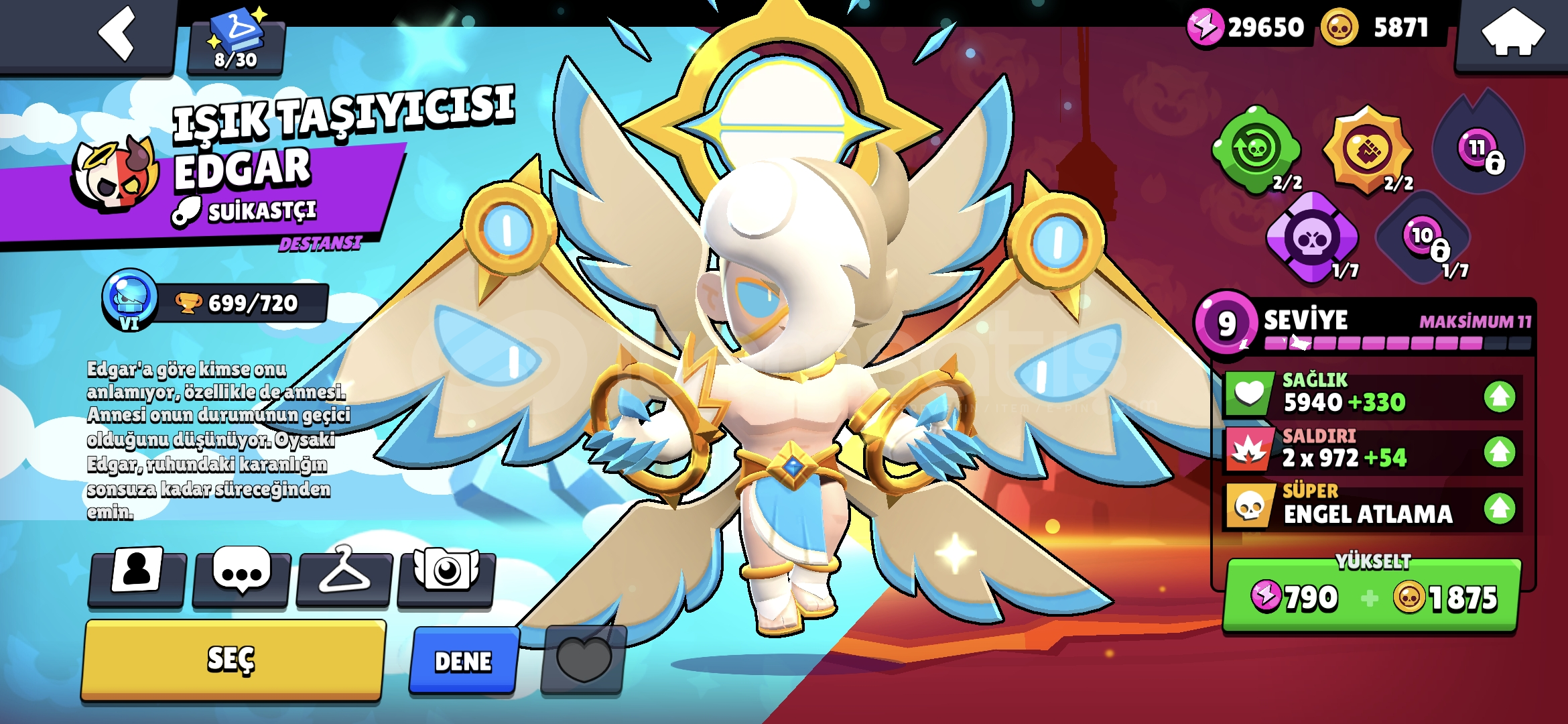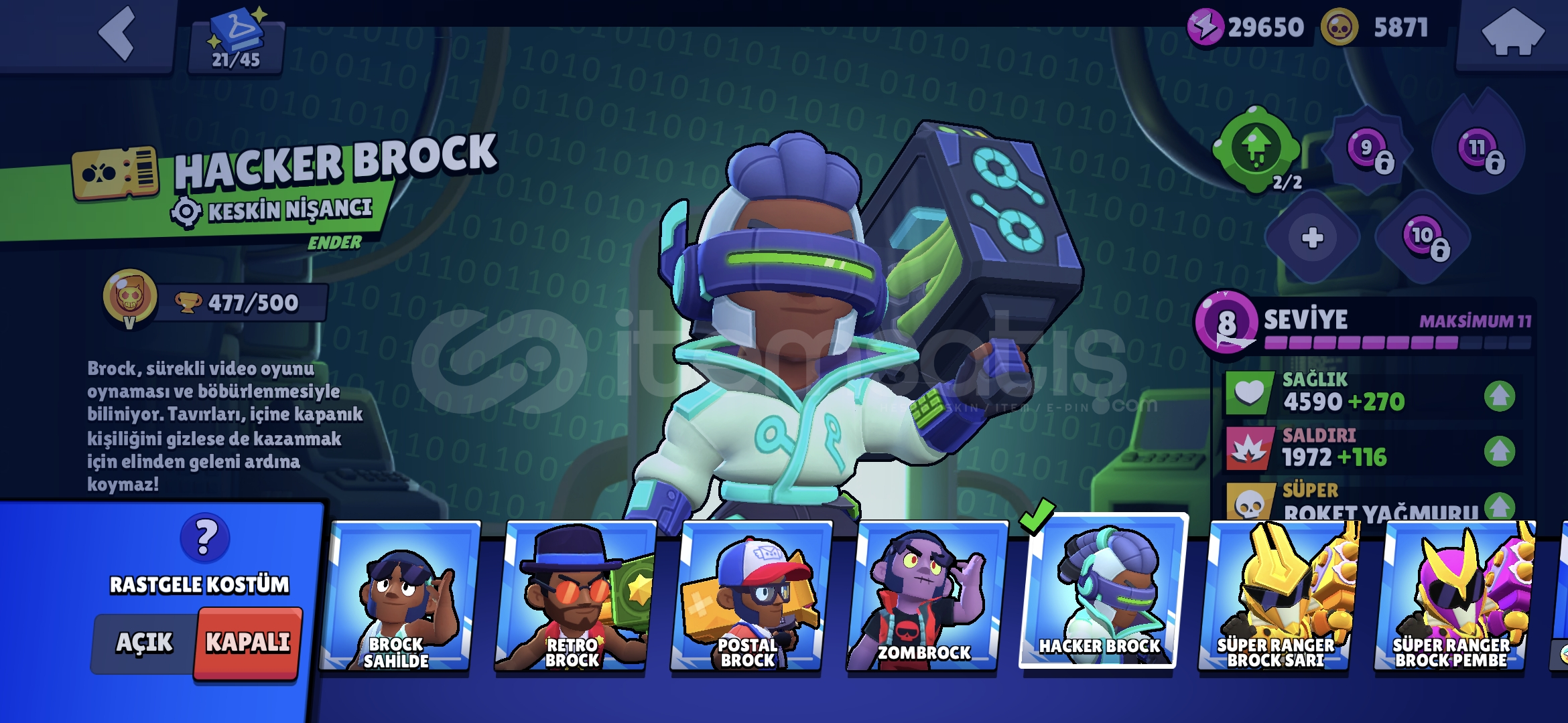 Nadir değerli skinler mevcuttur 77 karakterdir 10 Efsanevi 20 Gizemli 28 Destansı nerdeyse her karakterdede skin vardır koyamadığım birkaç tane daha değerli skin var. (Pazarlık yapılır) 60 tl ye brawl pass teklifide mevcuttur isim değiştirmek için taşı hazırdır hayday hesabıda vardır alana hayırlı olsun