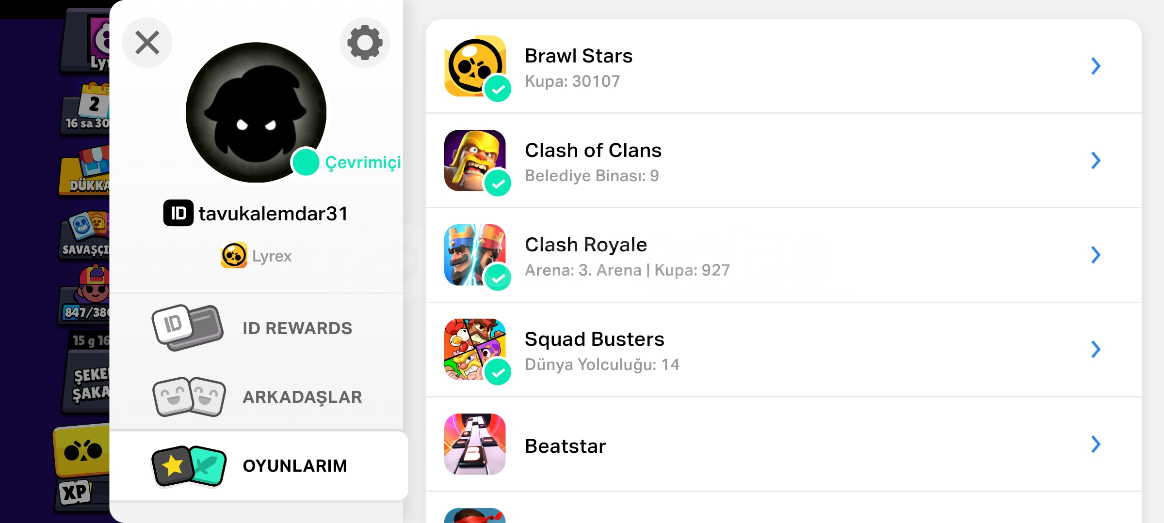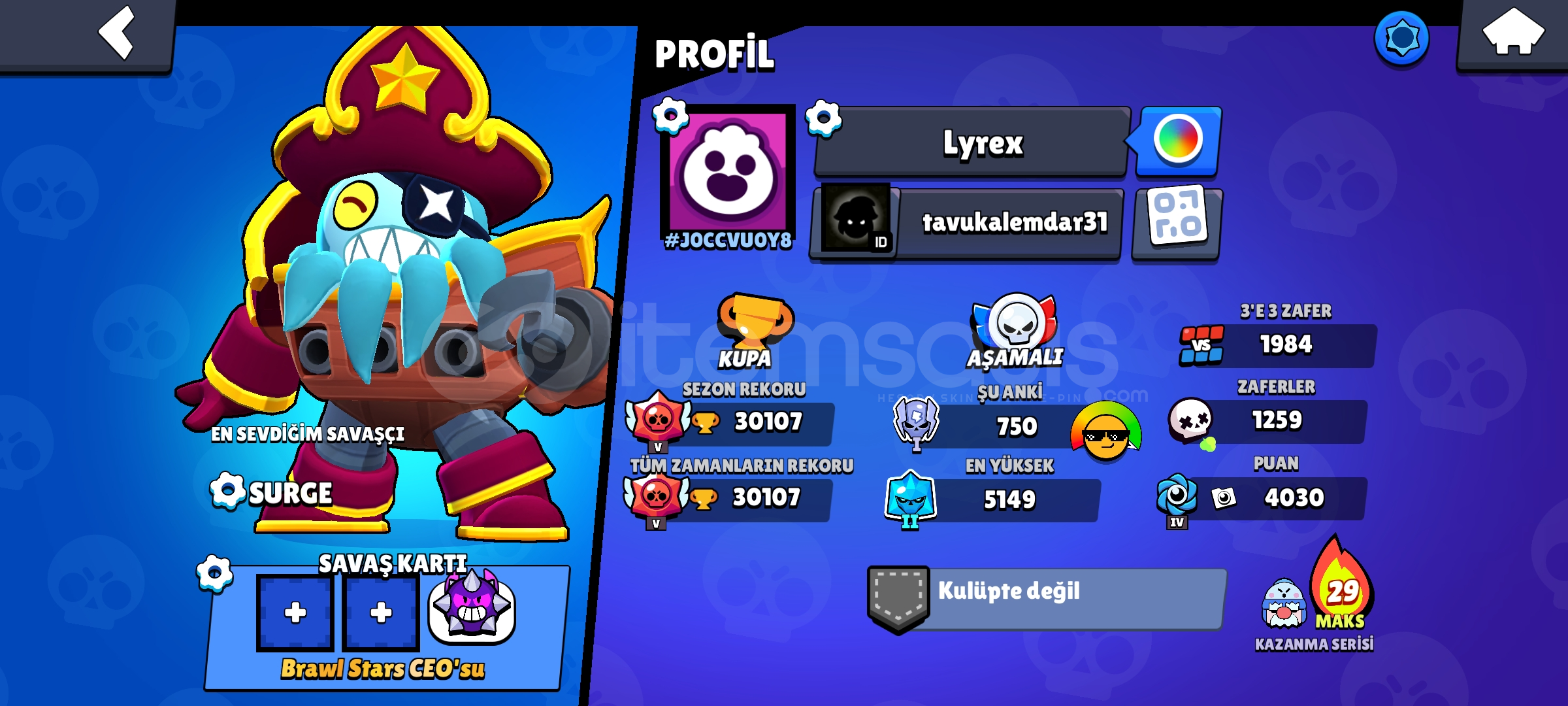 4 oyunClash of clash TH9Clash royale 927Squad busters14 Braw Stars 30.107 kupa66 karakter 5 efsanevi 19 gizemli23 gizemli10 süper ender 8 ender1 ilk savaşcı104 kostüm48 ender27 süper ender 22 destansı3 gizemli1 efsanevi1 hipersarj2 saf gümüşTelefon numarası bağlı değil E posta şifre verilecek
