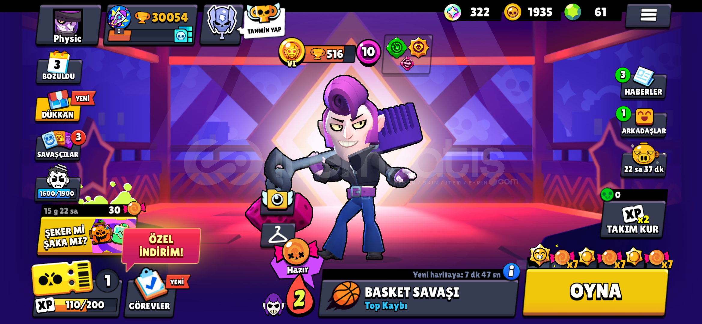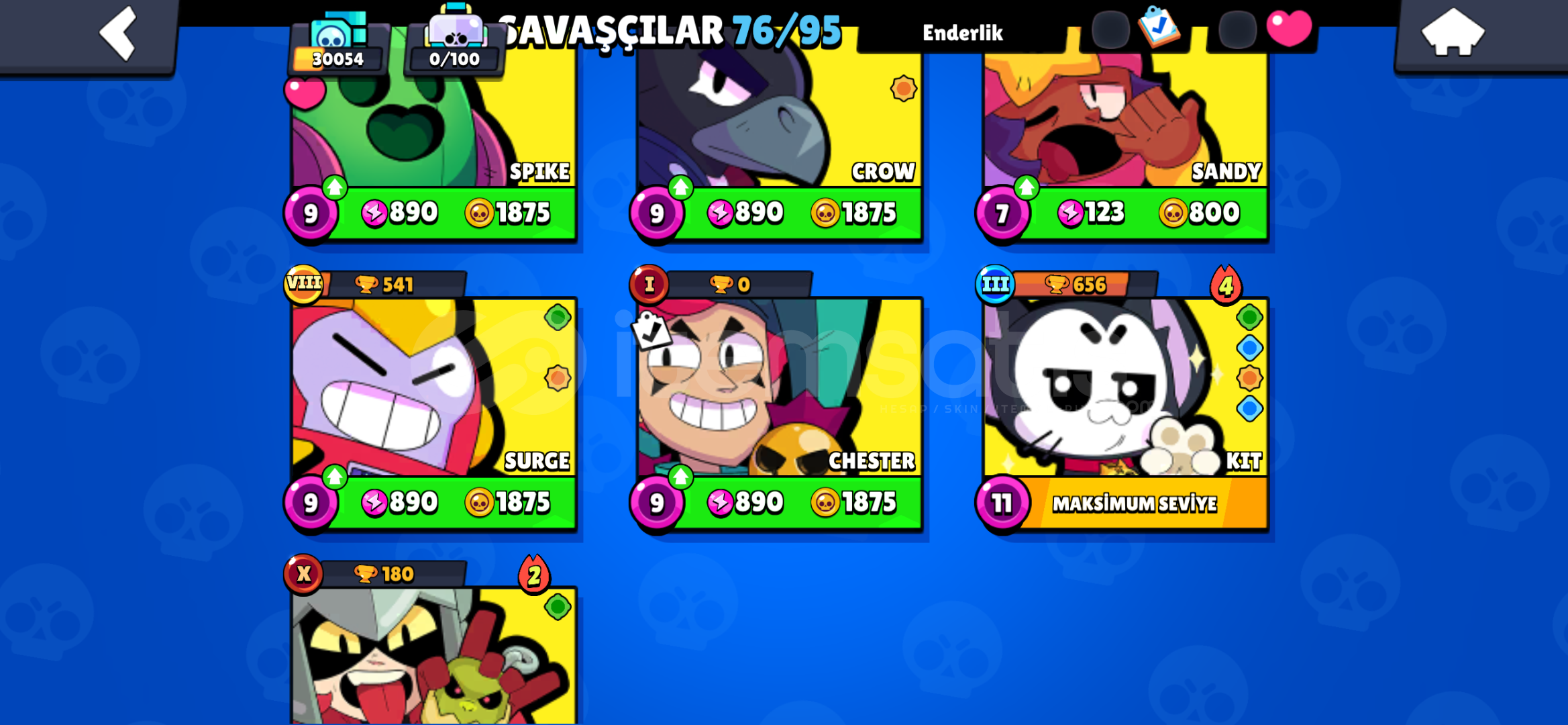 30k kupa 76 karakter 107 kostümMail devredilir 7 efsanevi karakter61 elmas 52 ender -36 süper ender-13 destansı-2 gizemli -1 efsanevi -1 hiperşarj kostümü- 1 saf gümüş - 1 saf altın 7000 kupa Clash royale 36 seviye116 karakter