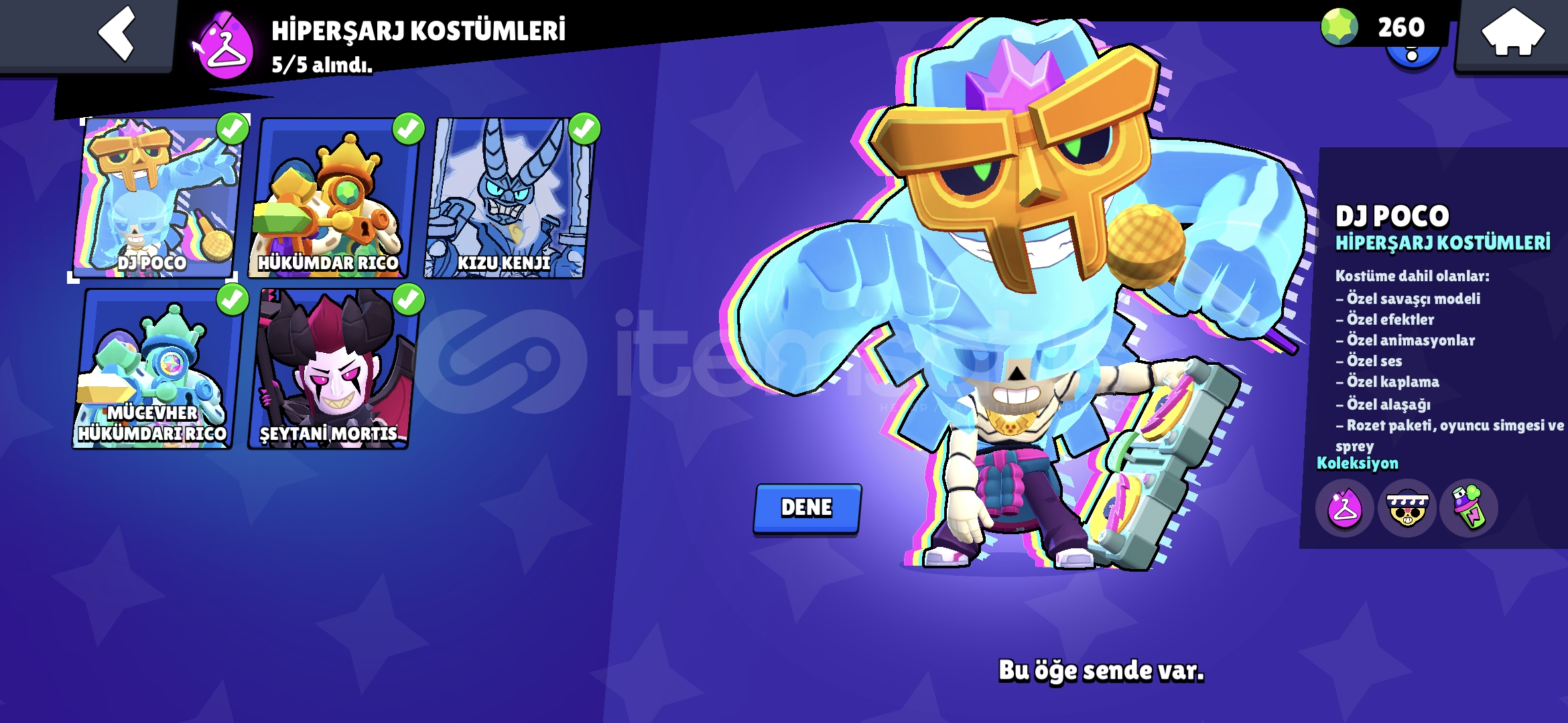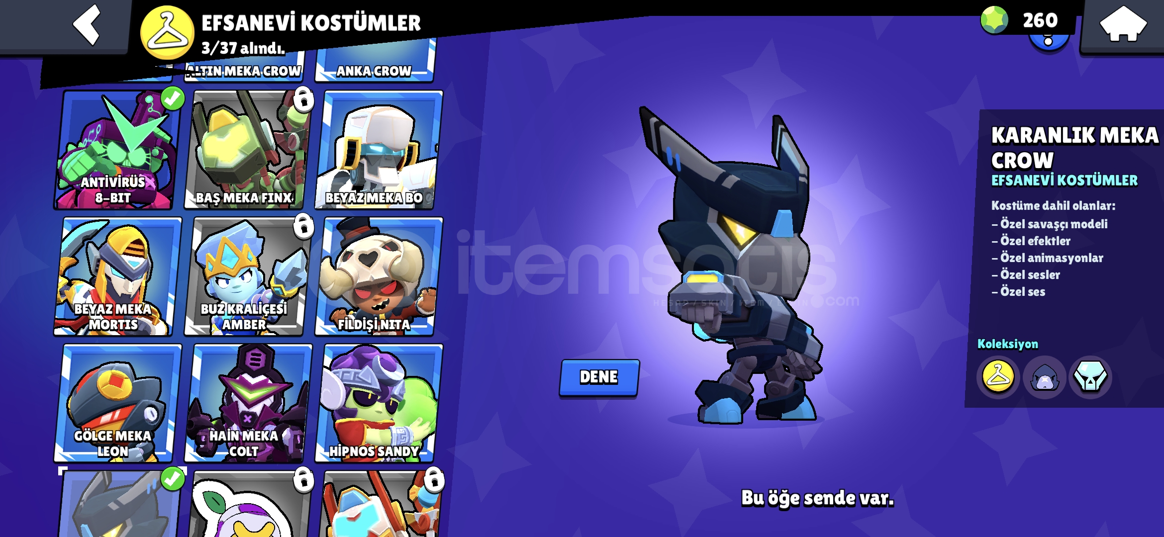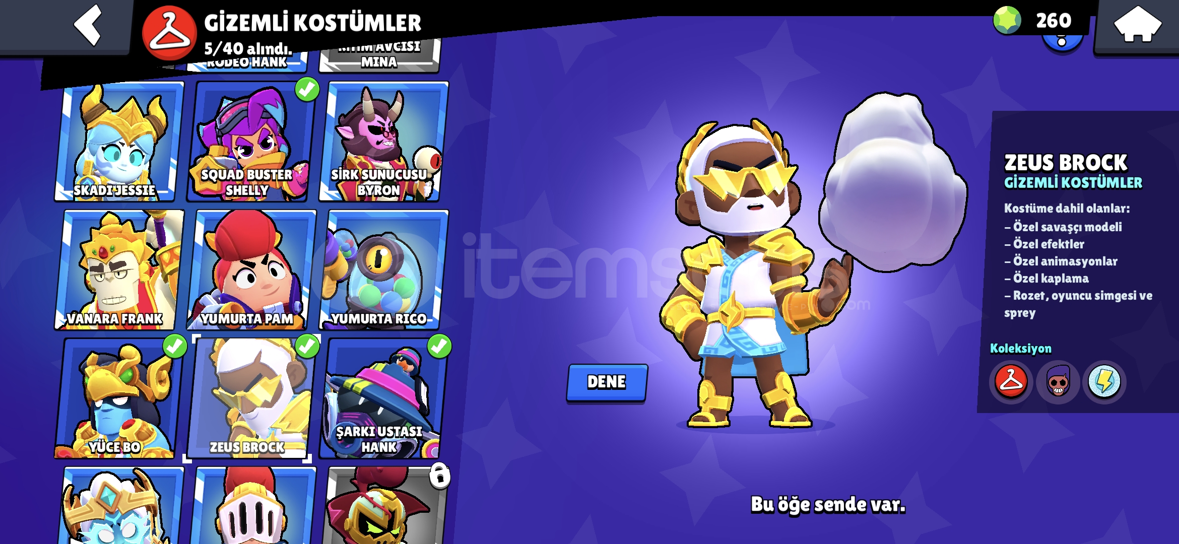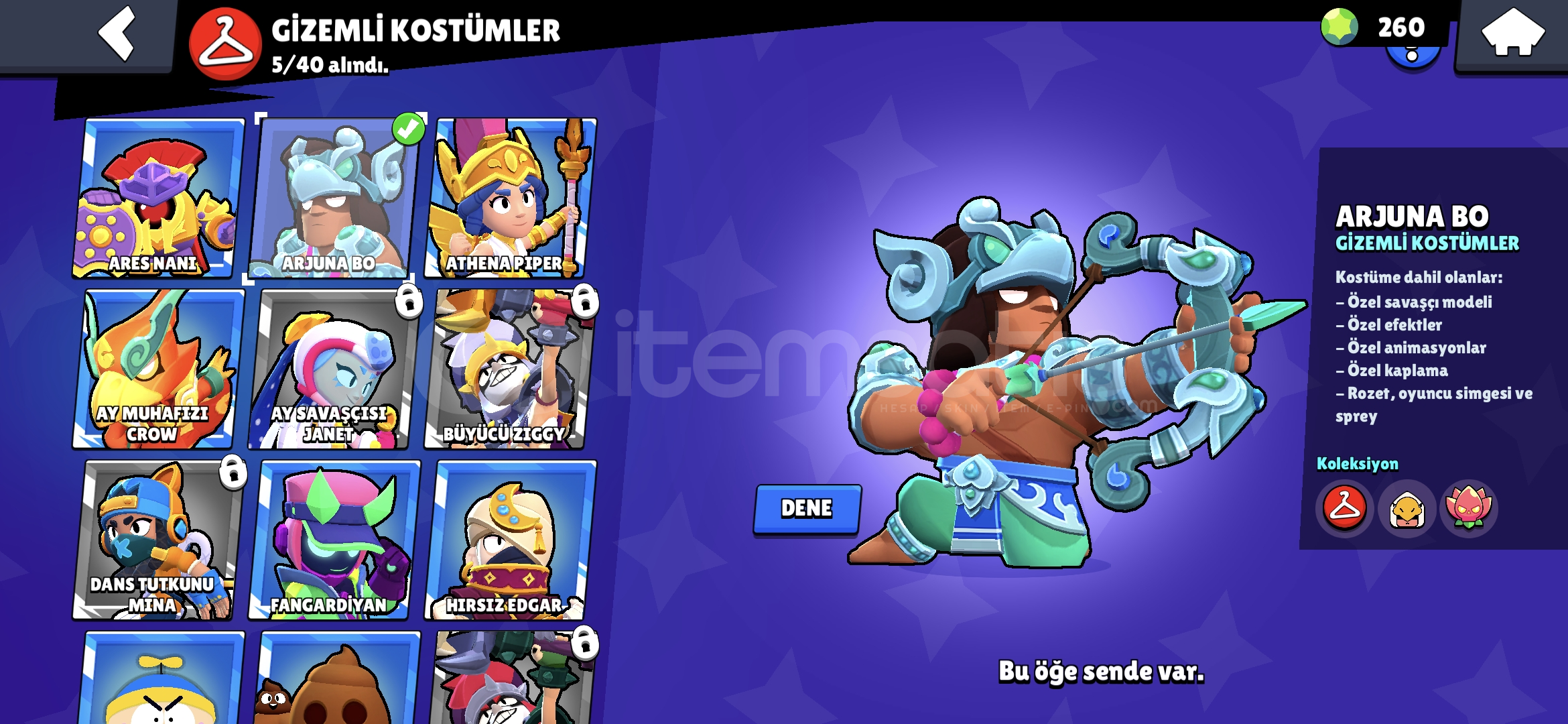 Hesapta 260 elmas.60 bin altin.31 bin mücevher.5 gizemli kostum. Arjuna bo yuce bo zeus brock vb.3 efsanevi kostum. Meka crow antivirus 8bit vb.5 hipersarj kostümü. Dj poco hukumdar/mucevher rico seytani mortiskizu kenji bulunmaktadir.21 destansı kostum.49 super ender kostum.46 ender kostum bulunmaktadır.